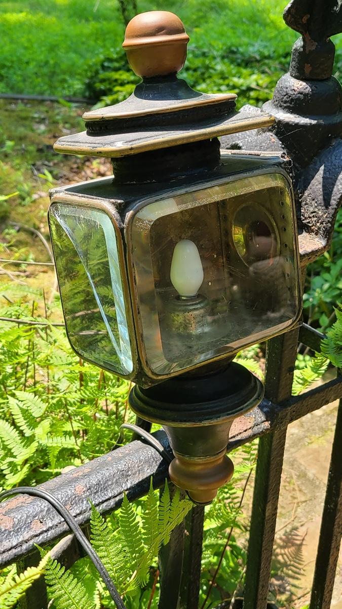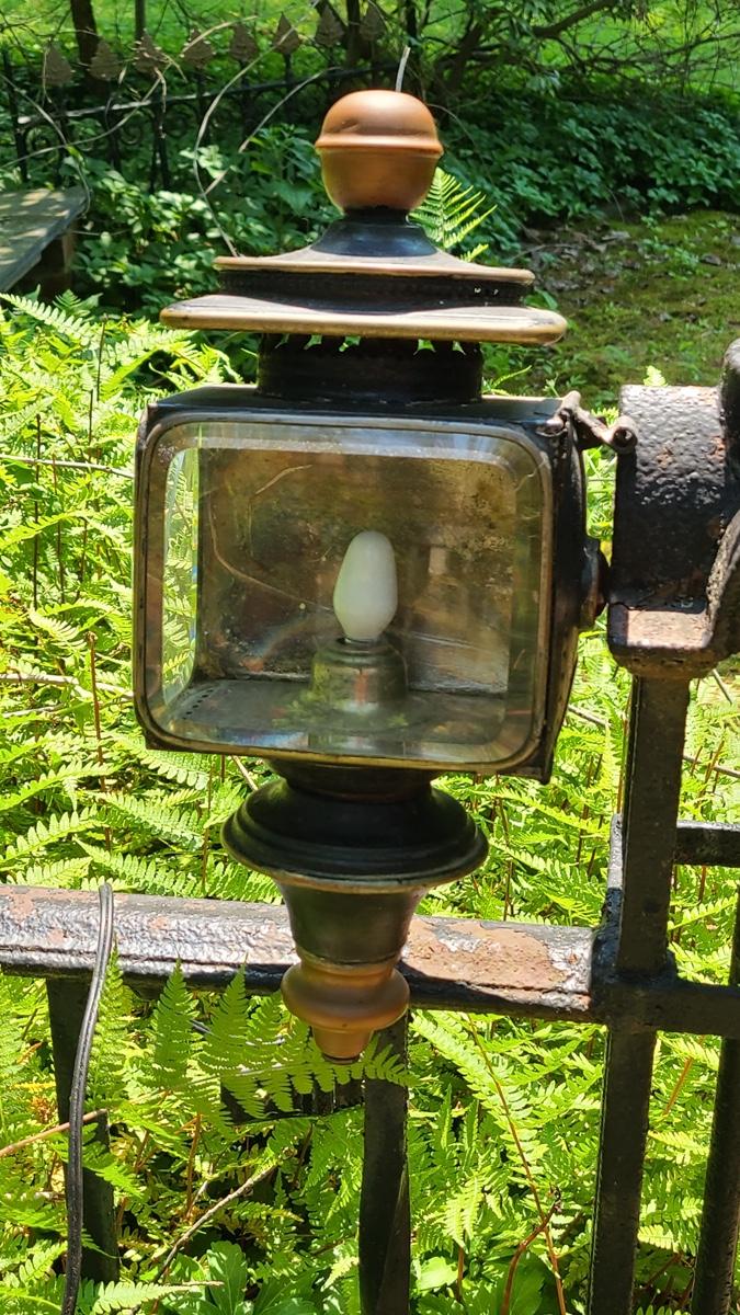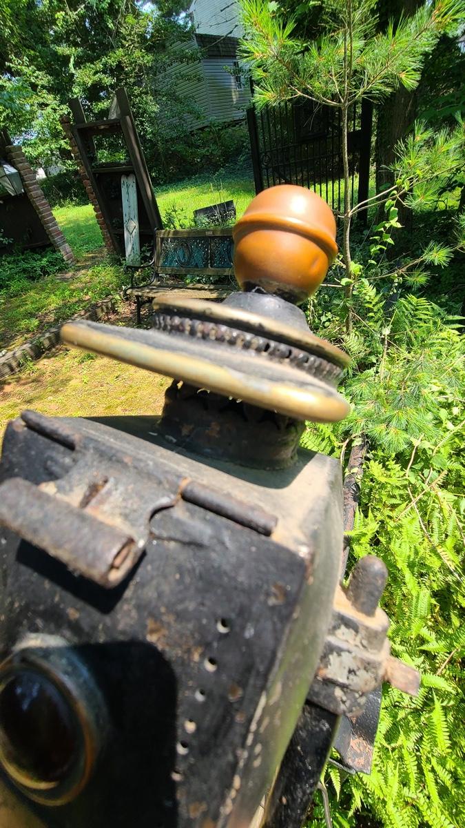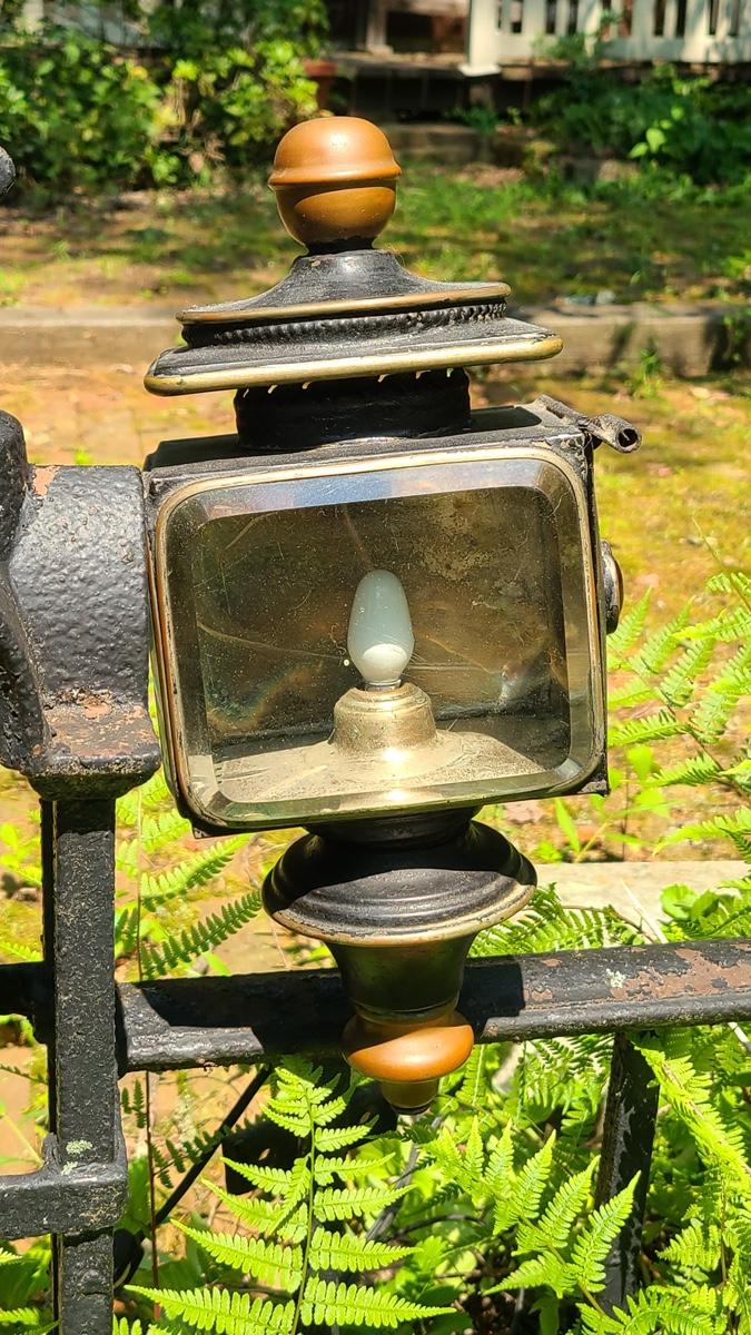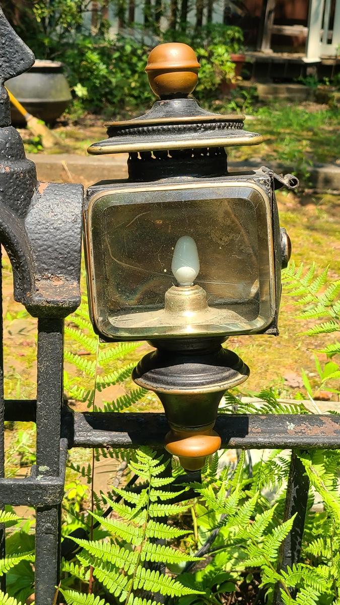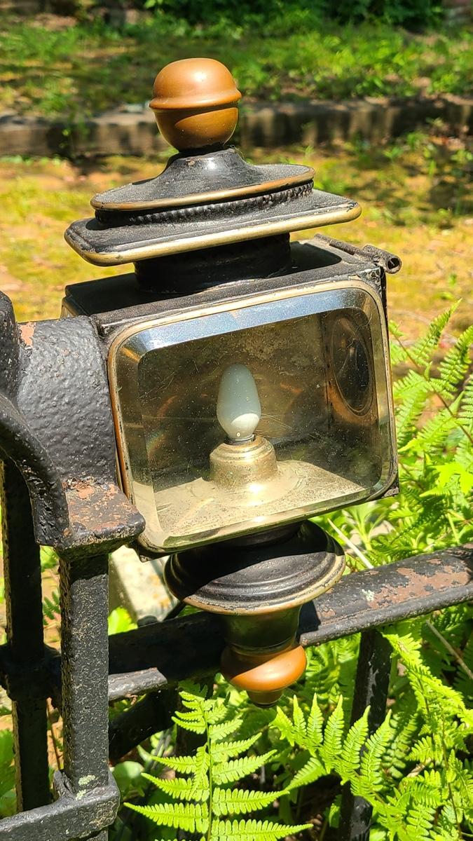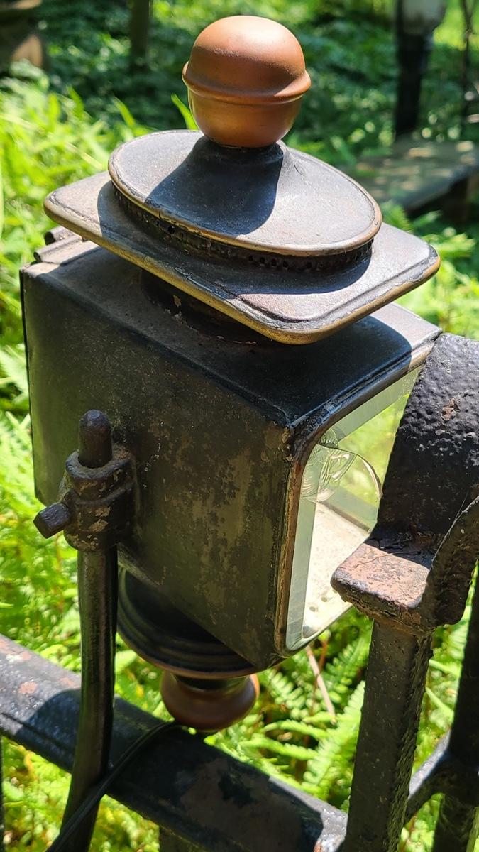 This is a such a unique piece of history. This would have been mounted on a carriage and it has the cast iron arm attached to mount to wall. This was wired to use in the home, and was mounted to a wood antique beam and cast a soft glow of light. It has original glass (side panel is broken but intact), side red glass, copper and black metal frame, and cast iron parts. Fun piece to own and a statement piece! Pictures are the best representation of the item in the lot, the condition of the items in the lot, and the size if measurements were taken. All items are sold as-is, since they are pre-owned and antiques. We are not experts and do our best to describe and pictures have been taken from every angle. Thank you for looking and have fun bidding.