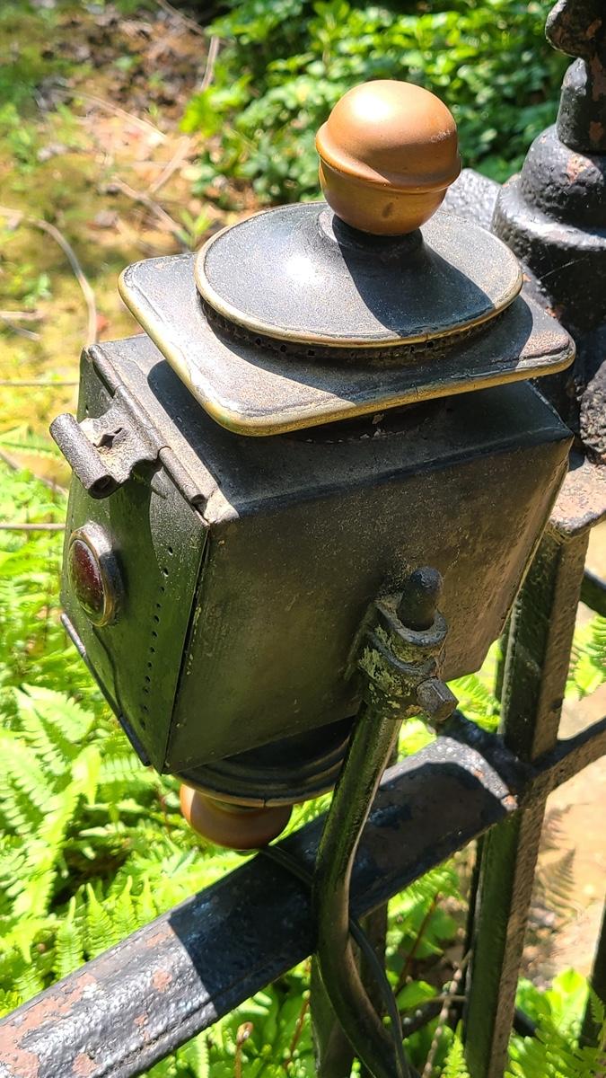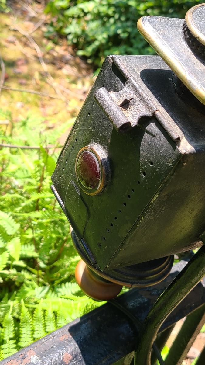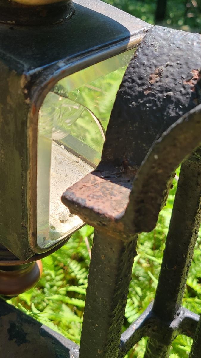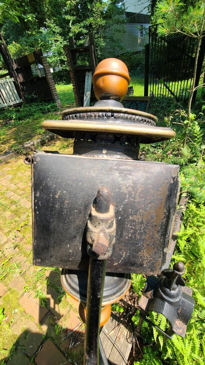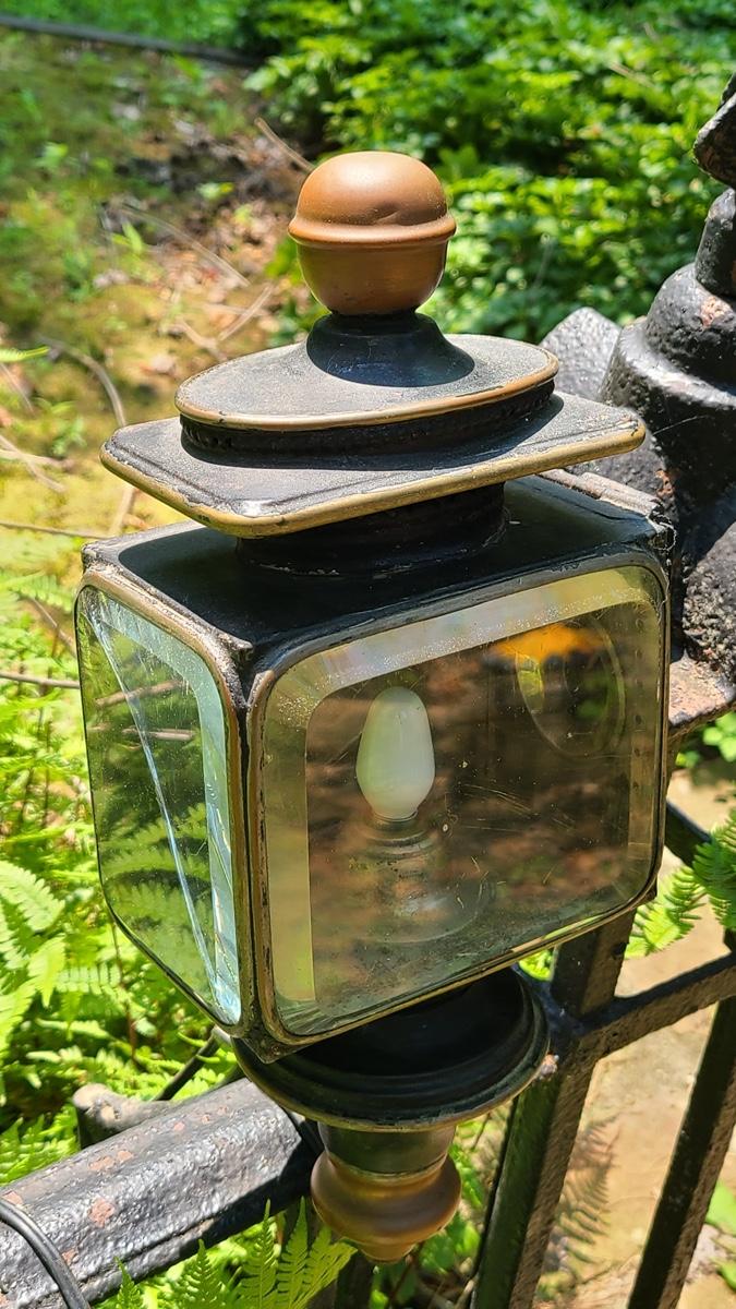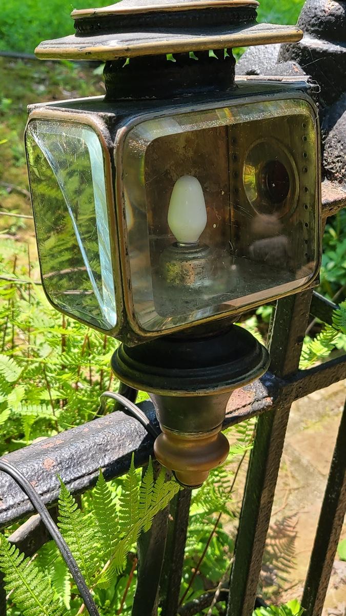 This is a such a unique piece of history. This would have been mounted on a carriage and it has the cast iron arm attached to mount to wall. This was wired to use in the home, and was mounted to a wood antique beam and cast a soft glow of light. It has original glass (side panel is broken but intact), side red glass, copper and black metal frame, and cast iron parts. Fun piece to own and a statement piece! Pictures are the best representation of the item in the lot, the condition of the items in the lot, and the size if measurements were taken. All items are sold as-is, since they are pre-owned and antiques. We are not experts and do our best to describe and pictures have been taken from every angle. Thank you for looking and have fun bidding.