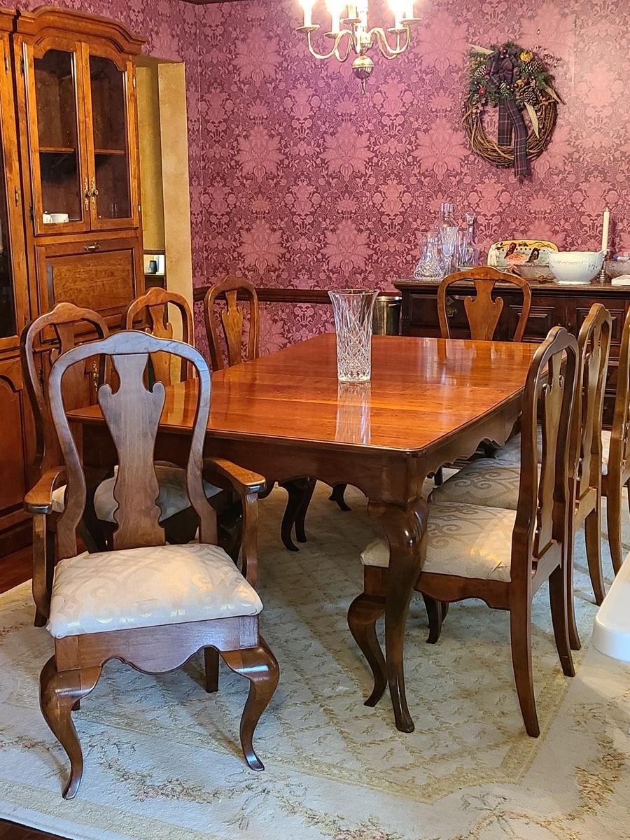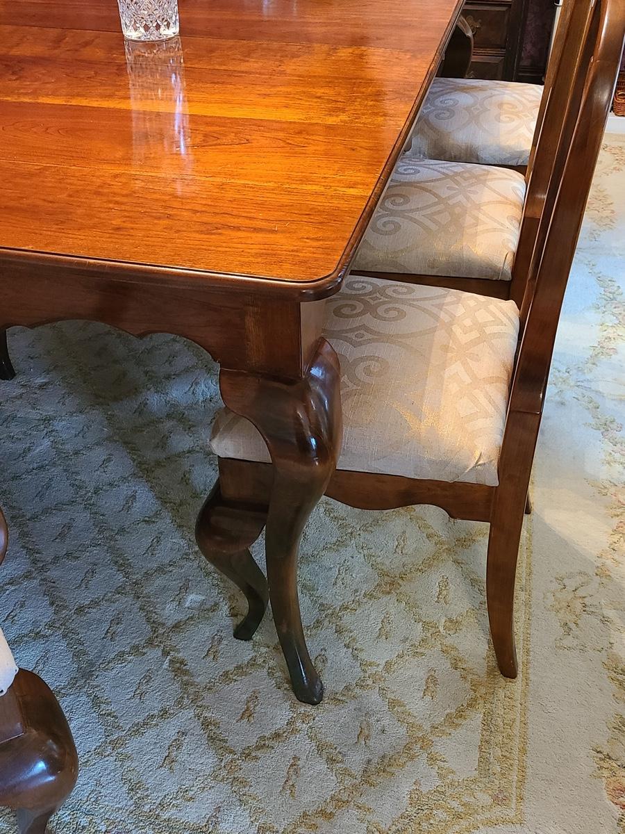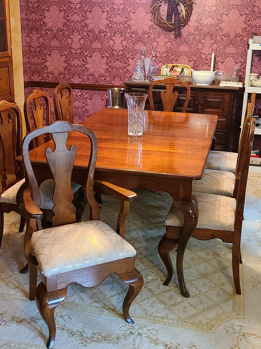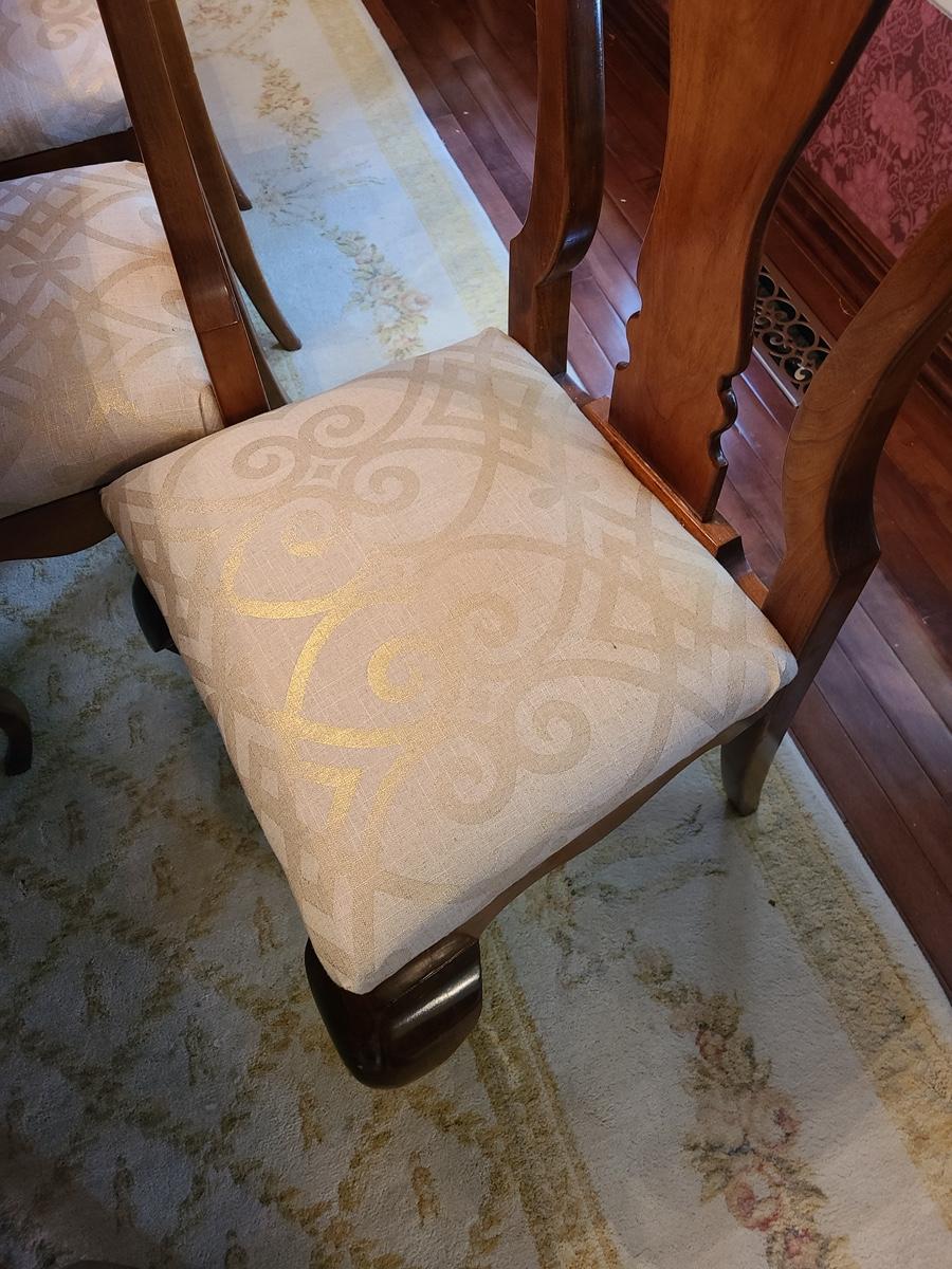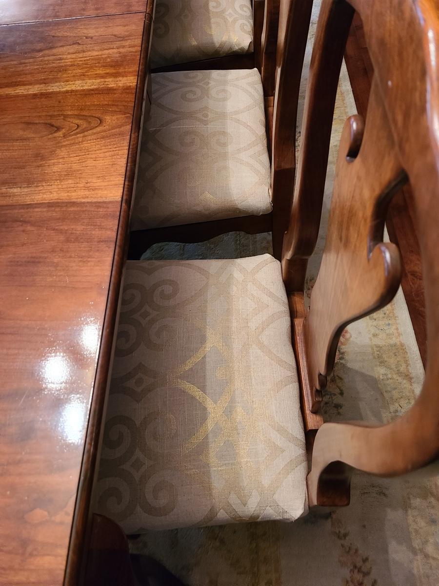 This dining room table is gorgeous and comes with two leaves, and table covers. The chairs have been recovered with gold accent fabric and are gorgeous as stand alone pieces or with the table. One or two show minor wear. Please see all pictures as they are the best representation of the items in the lot, the condition of the lot, and will show measurements if taken. If purchasing furniture you must be able to move yourself with your own help, and truck.