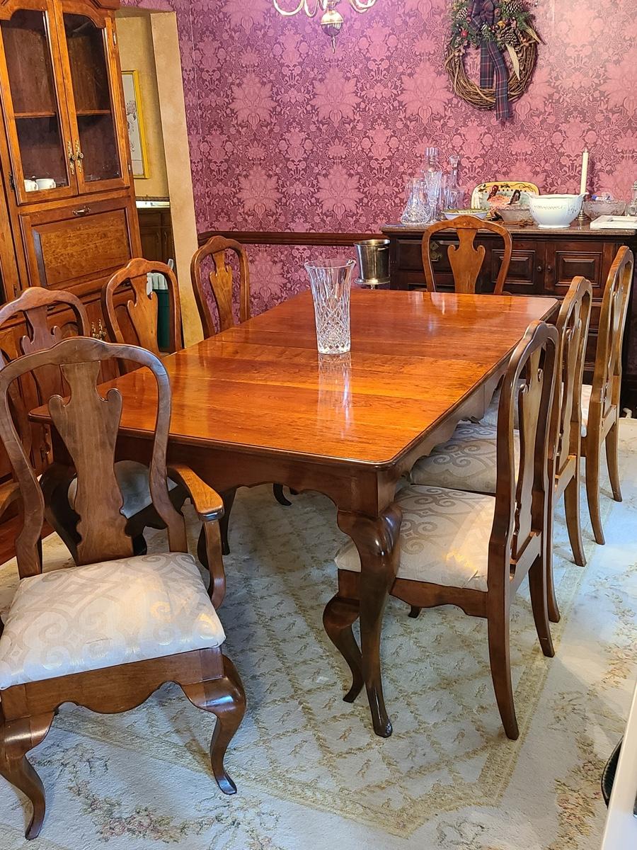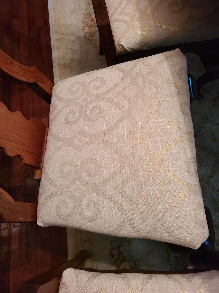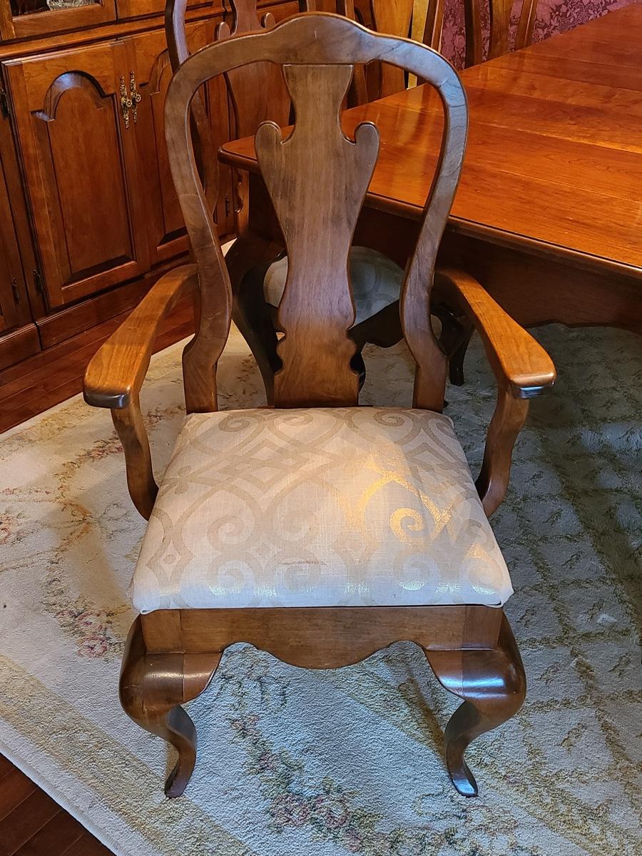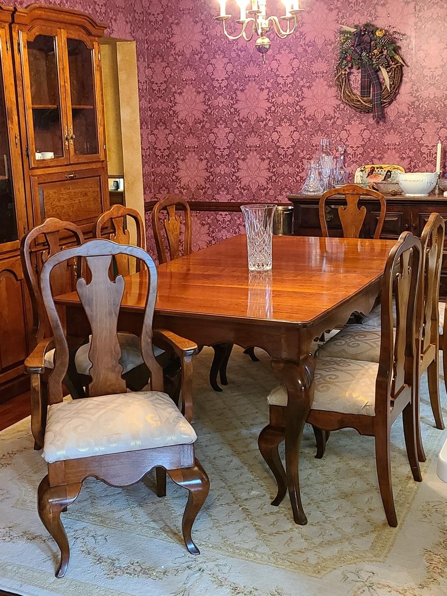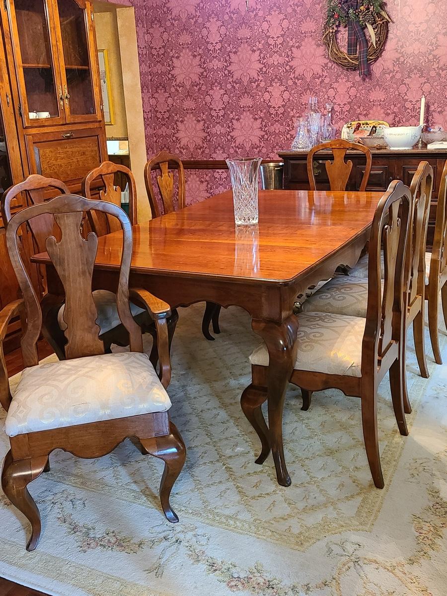 This dining room table is gorgeous and comes with two leaves, and table covers. The chairs have been recovered with gold accent fabric and are gorgeous as stand alone pieces or with the table. One or two show minor wear. Please see all pictures as they are the best representation of the items in the lot, the condition of the lot, and will show measurements if taken. If purchasing furniture you must be able to move yourself with your own help, and truck.