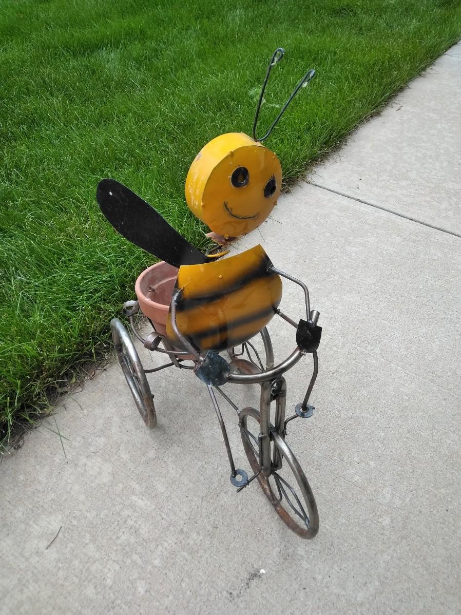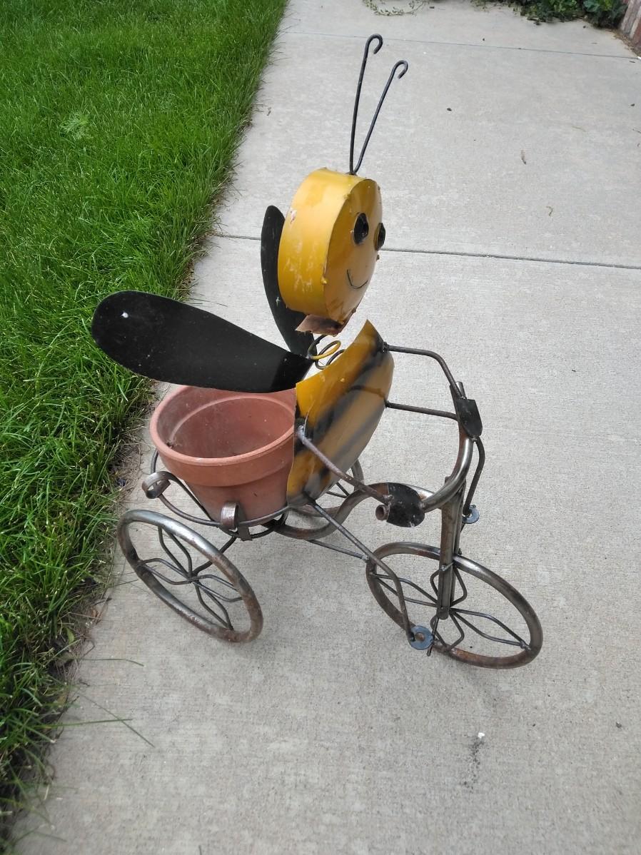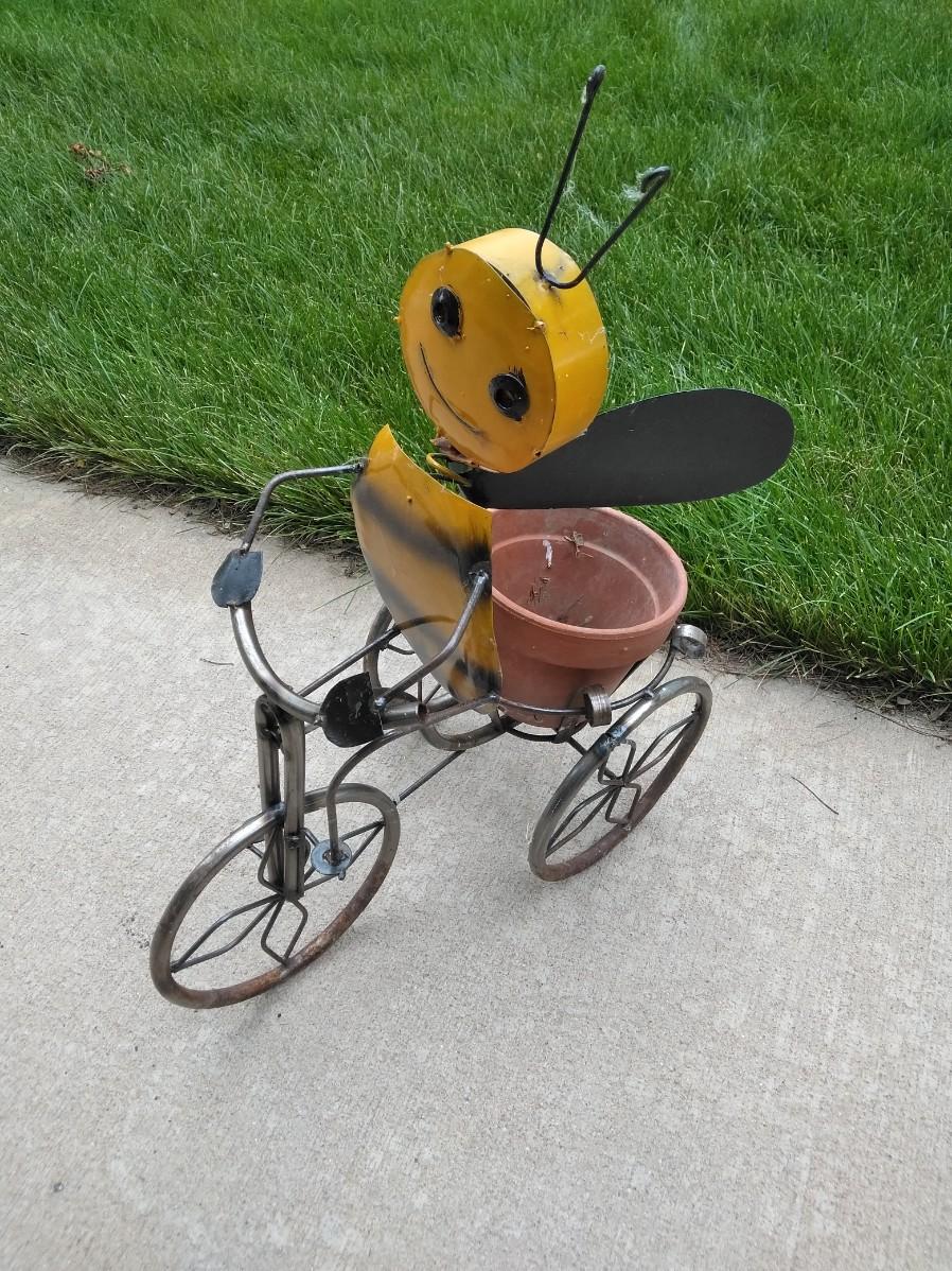 LIGHT WEIGHT METAL BUMBLE BEE ON A TRIKE PLANTER.