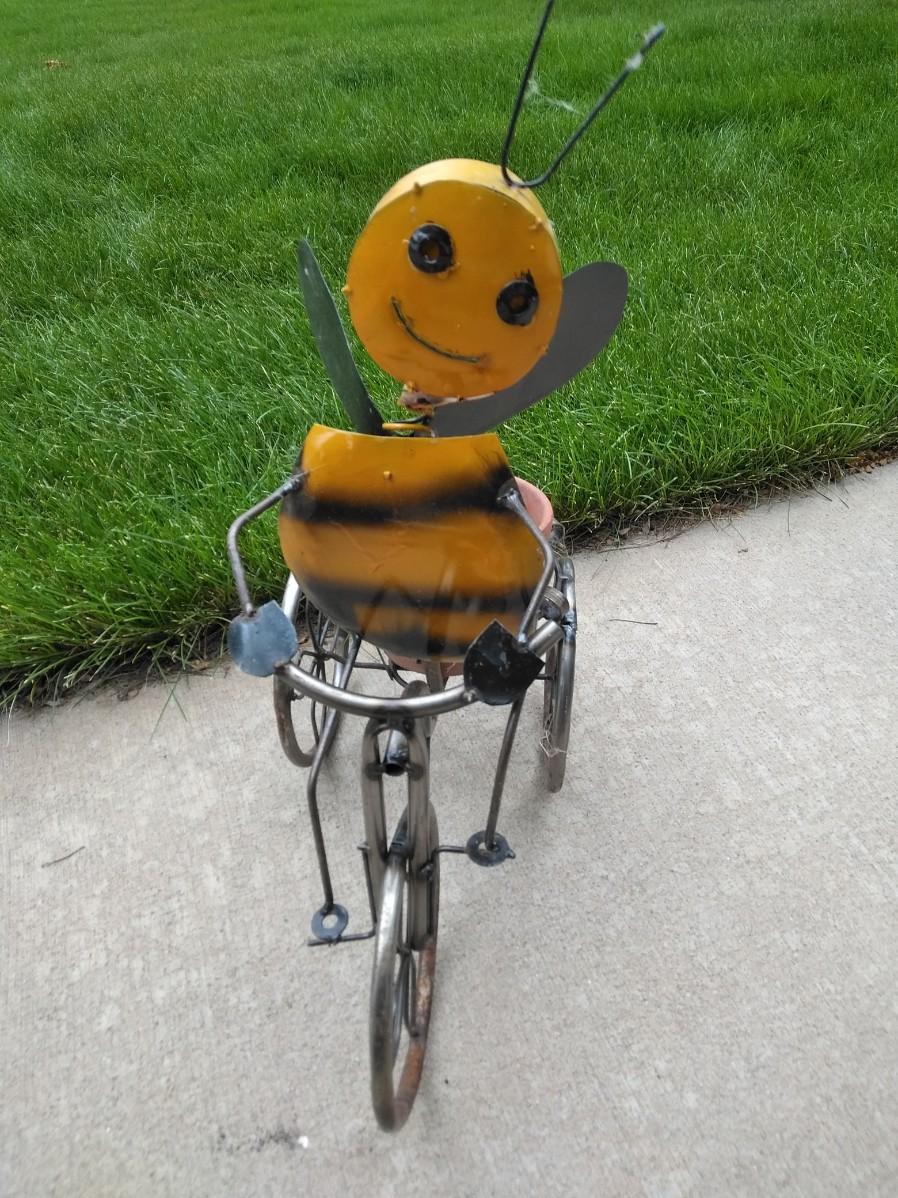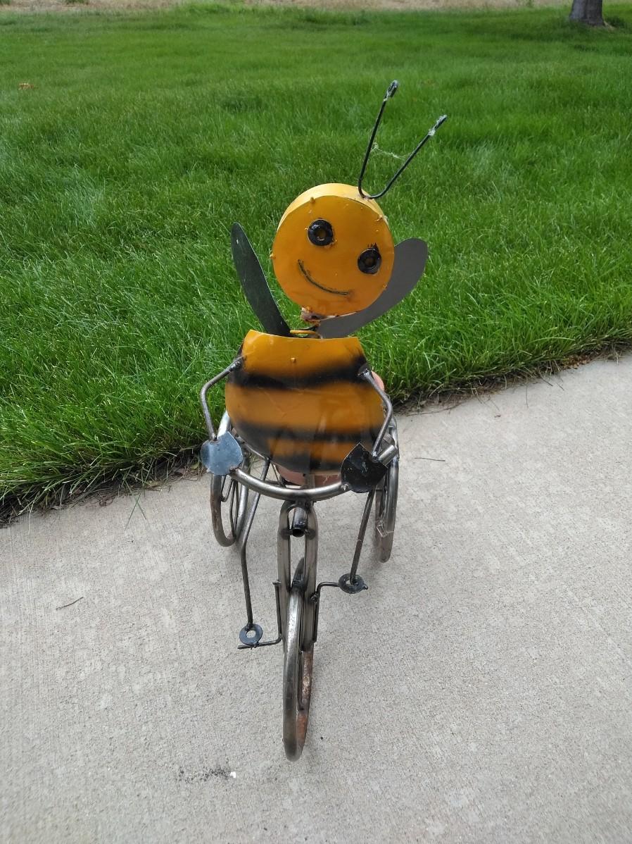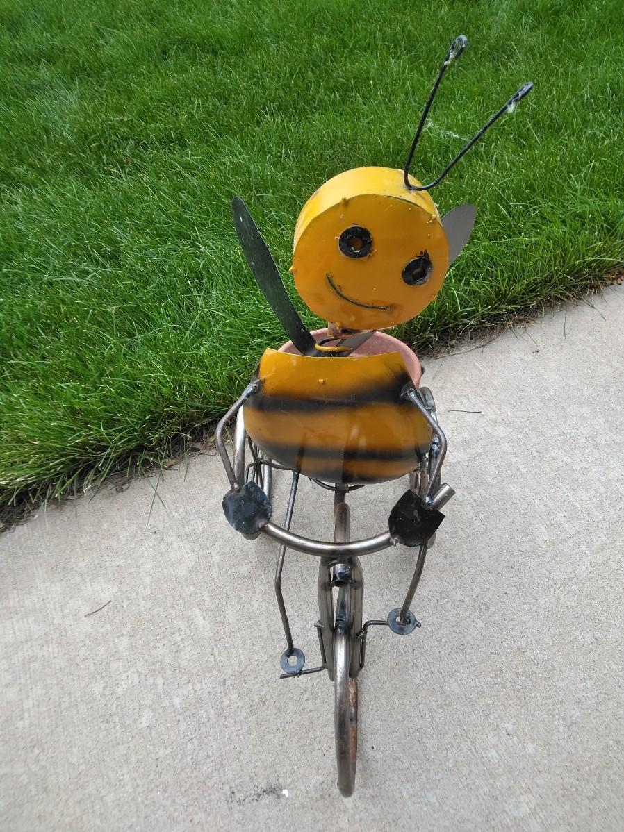 LIGHT WEIGHT METAL BUMBLE BEE ON A TRIKE PLANTER.