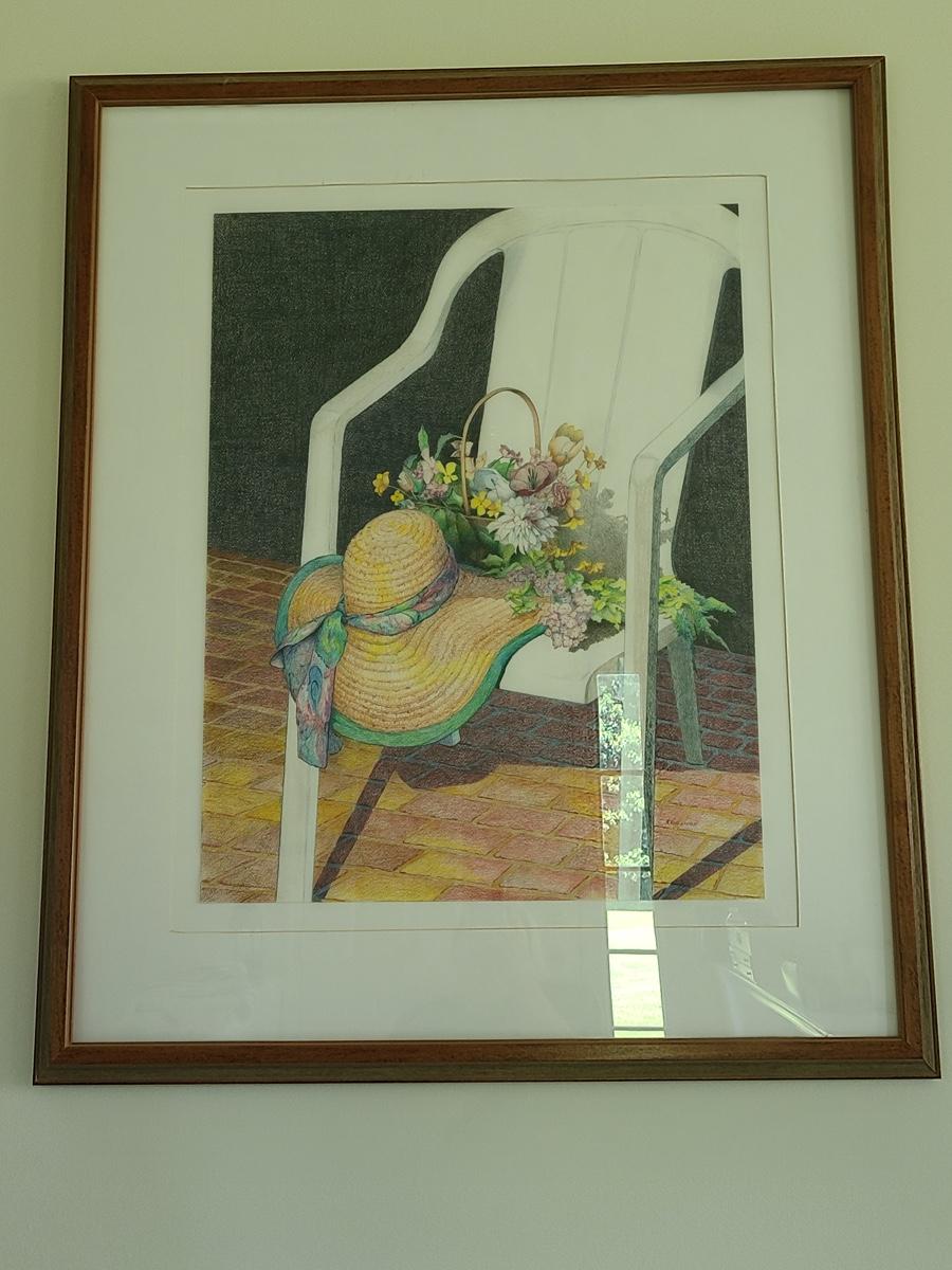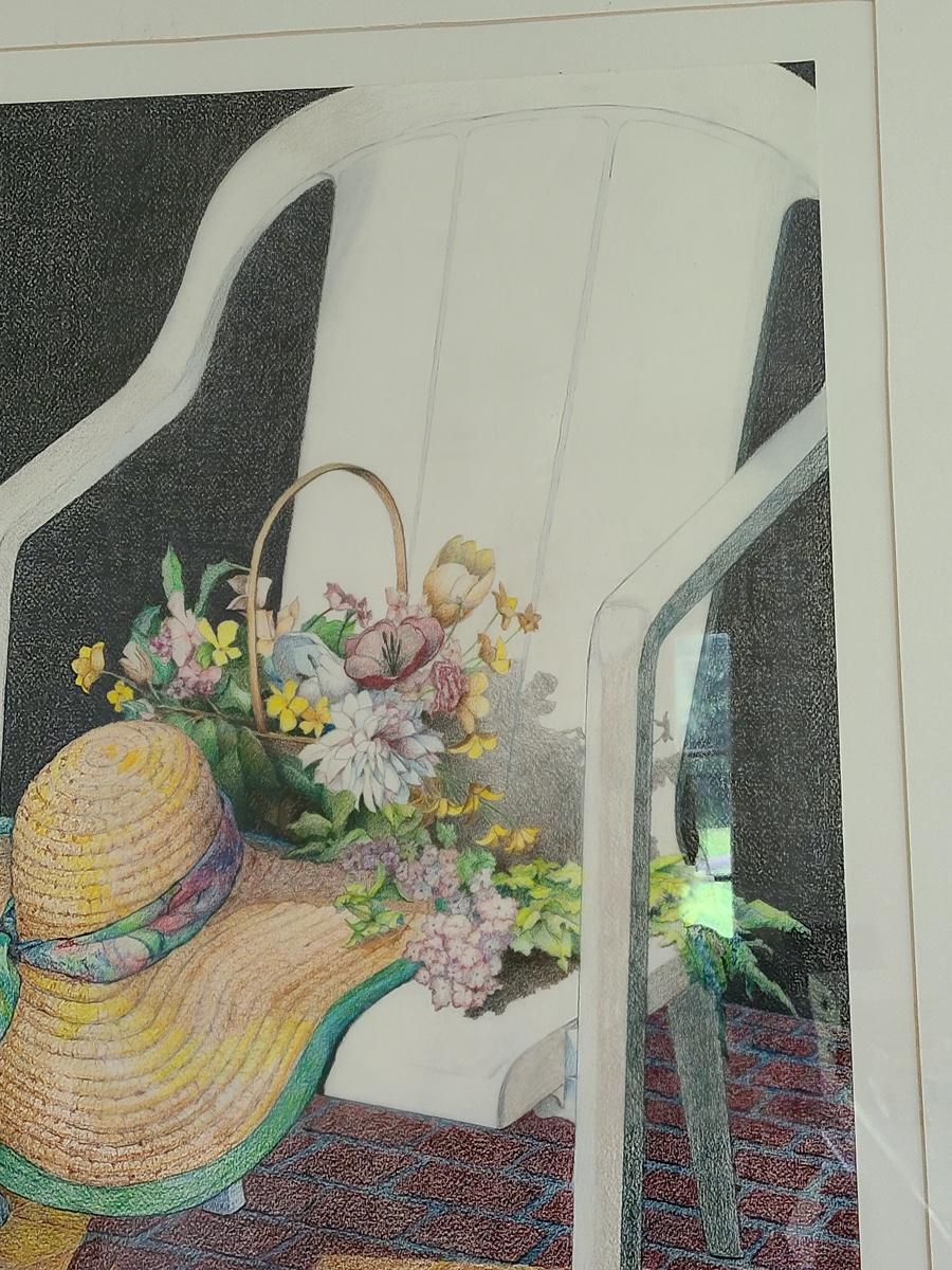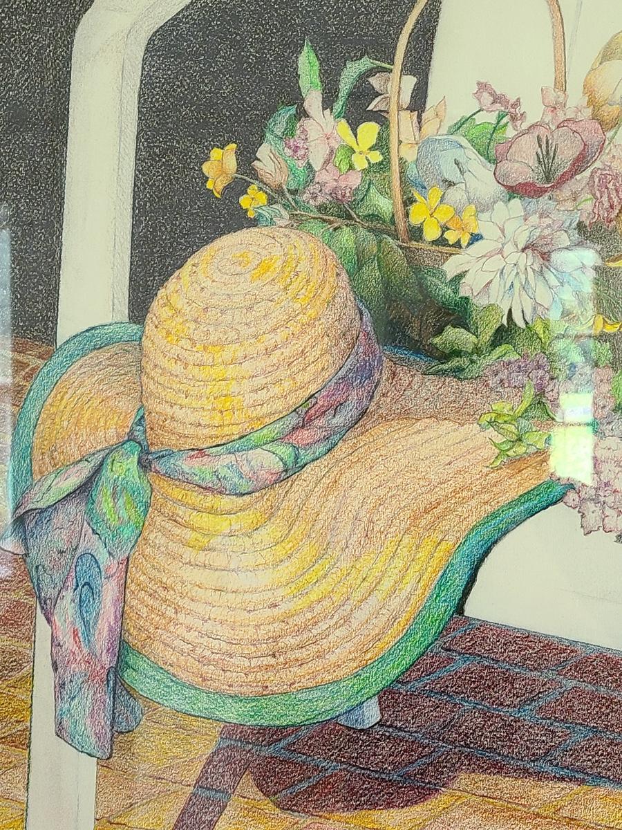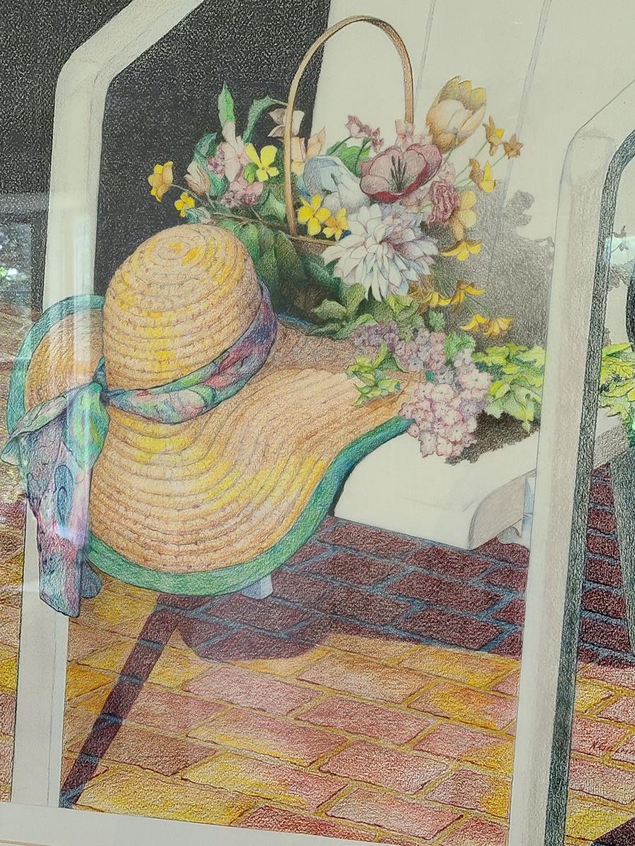 This is a beautiful pencil drawing of sunhat and flowers on white porch chair. The colors are lovely and this would accent any room perfectly. Please see all pictures for content of the lot, condition of the lot, and measurements if taken. Pictures are the best representation of the items listed and items are untested unless indicated in description. Thank you for looking and have fun bidding![
