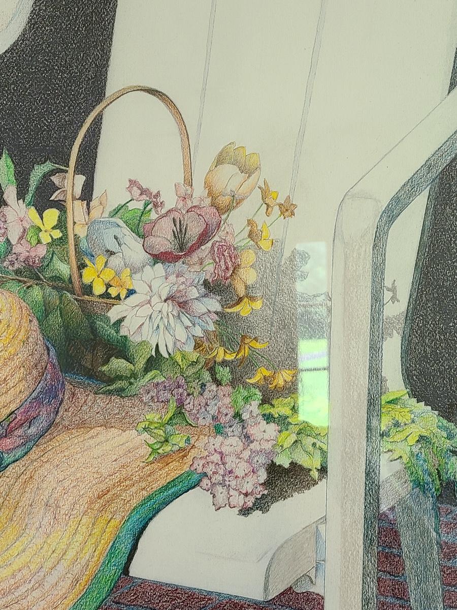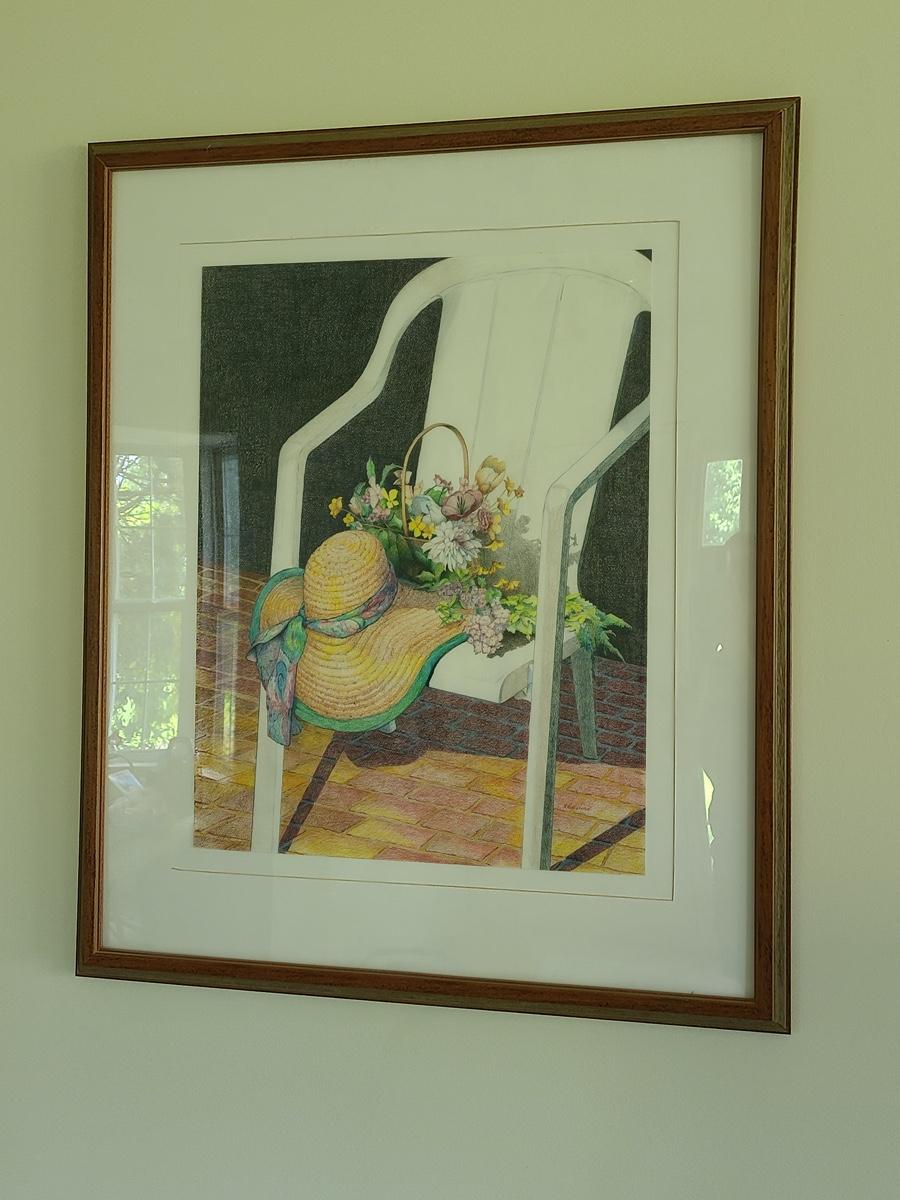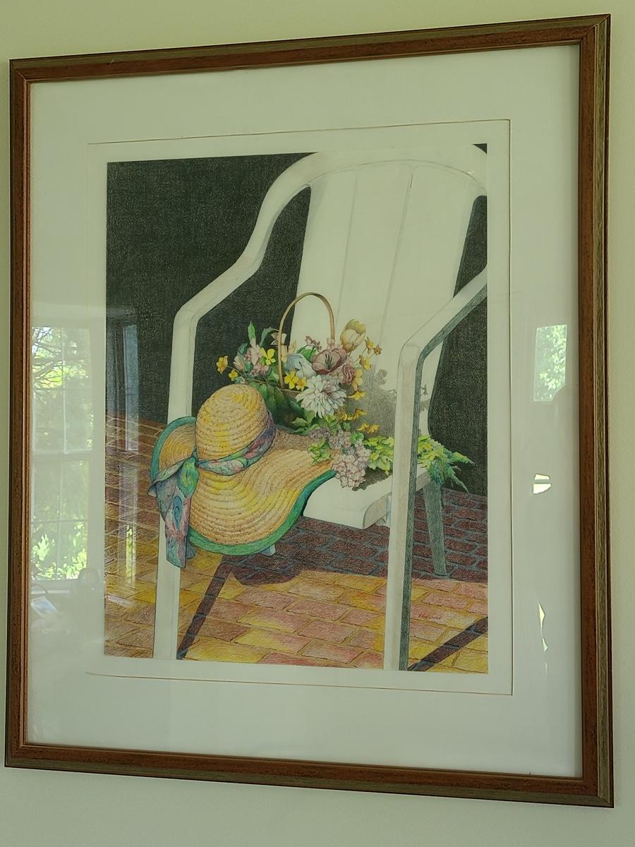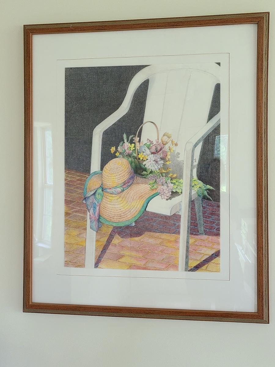 This is a beautiful pencil drawing of sunhat and flowers on white porch chair. The colors are lovely and this would accent any room perfectly. Please see all pictures for content of the lot, condition of the lot, and measurements if taken. Pictures are the best representation of the items listed and items are untested unless indicated in description. Thank you for looking and have fun bidding![
