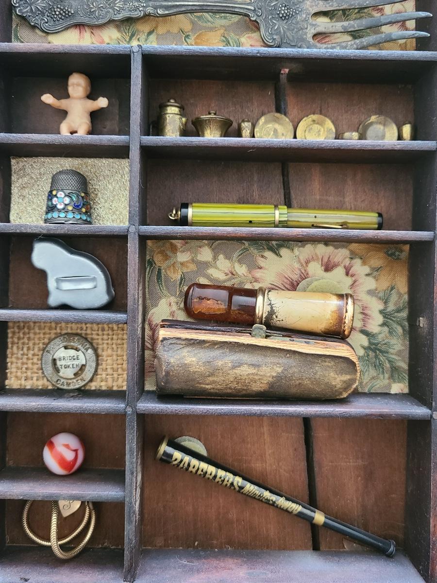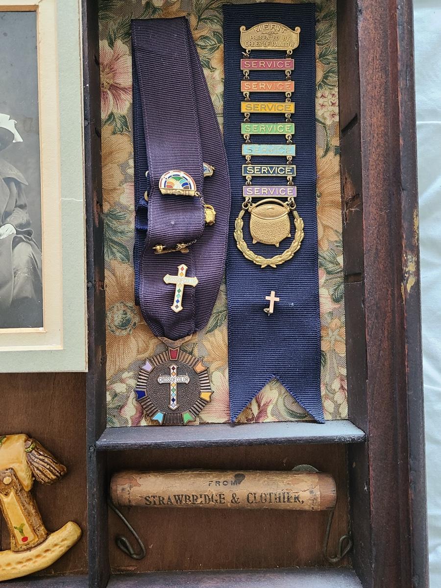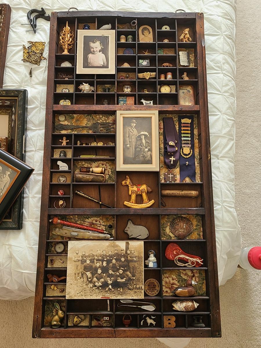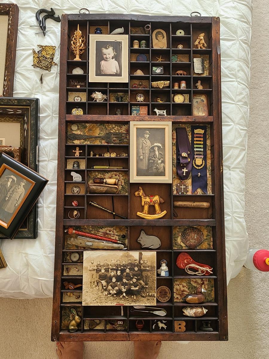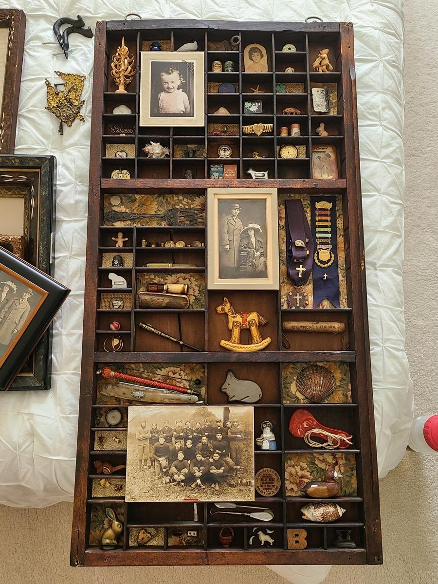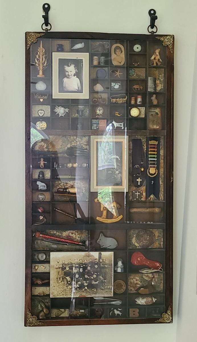 16x33 inches tall. This is an amazing collection of antique collectibles & pictures of family momento's including: mini fountain pen, Order of the Rainbow medals, Binky Toy Teether, pipe parts, jewelry, Girls Scouts, pocket watches, Chester Ford Badge and More. This has been wall mounted and has a glass cover. Some of the items have velcro on back to keep in place, some a glue dot, and some are just sitting in section. Please see all pictures for content of the lot, condition of the lot, and measurements if taken. Pictures are the best representation of the items listed and items are untested unless indicated in description. Thank you for looking and have fun bidding![