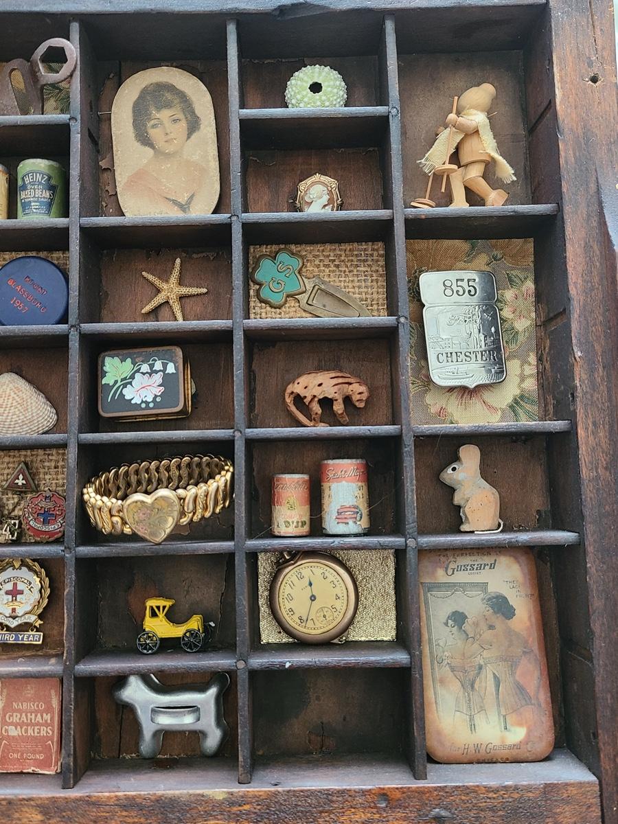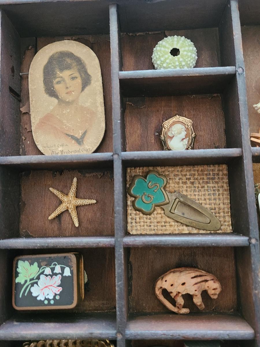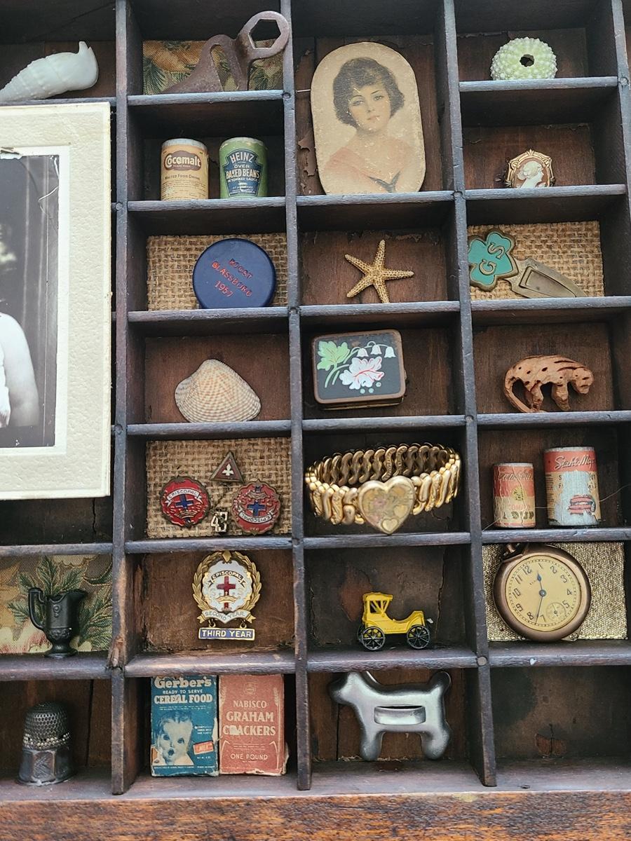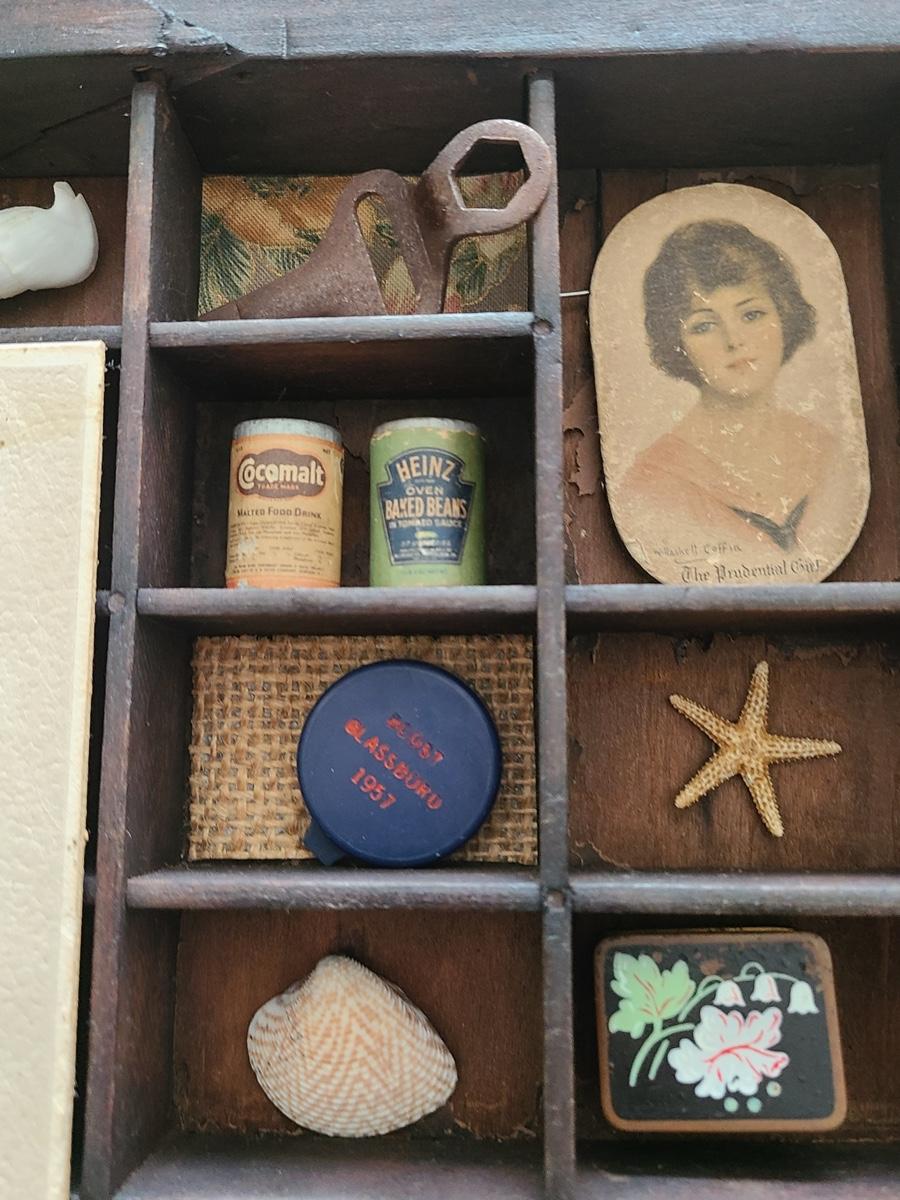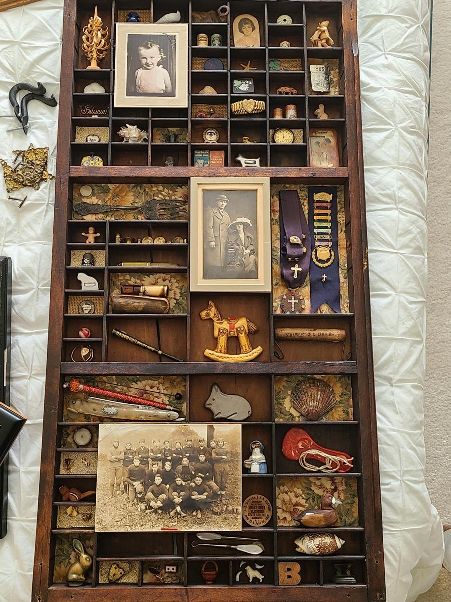 16x33 inches tall. This is an amazing collection of antique collectibles & pictures of family momento's including: mini fountain pen, Order of the Rainbow medals, Binky Toy Teether, pipe parts, jewelry, Girls Scouts, pocket watches, Chester Ford Badge and More. This has been wall mounted and has a glass cover. Some of the items have velcro on back to keep in place, some a glue dot, and some are just sitting in section. Please see all pictures for content of the lot, condition of the lot, and measurements if taken. Pictures are the best representation of the items listed and items are untested unless indicated in description. Thank you for looking and have fun bidding![