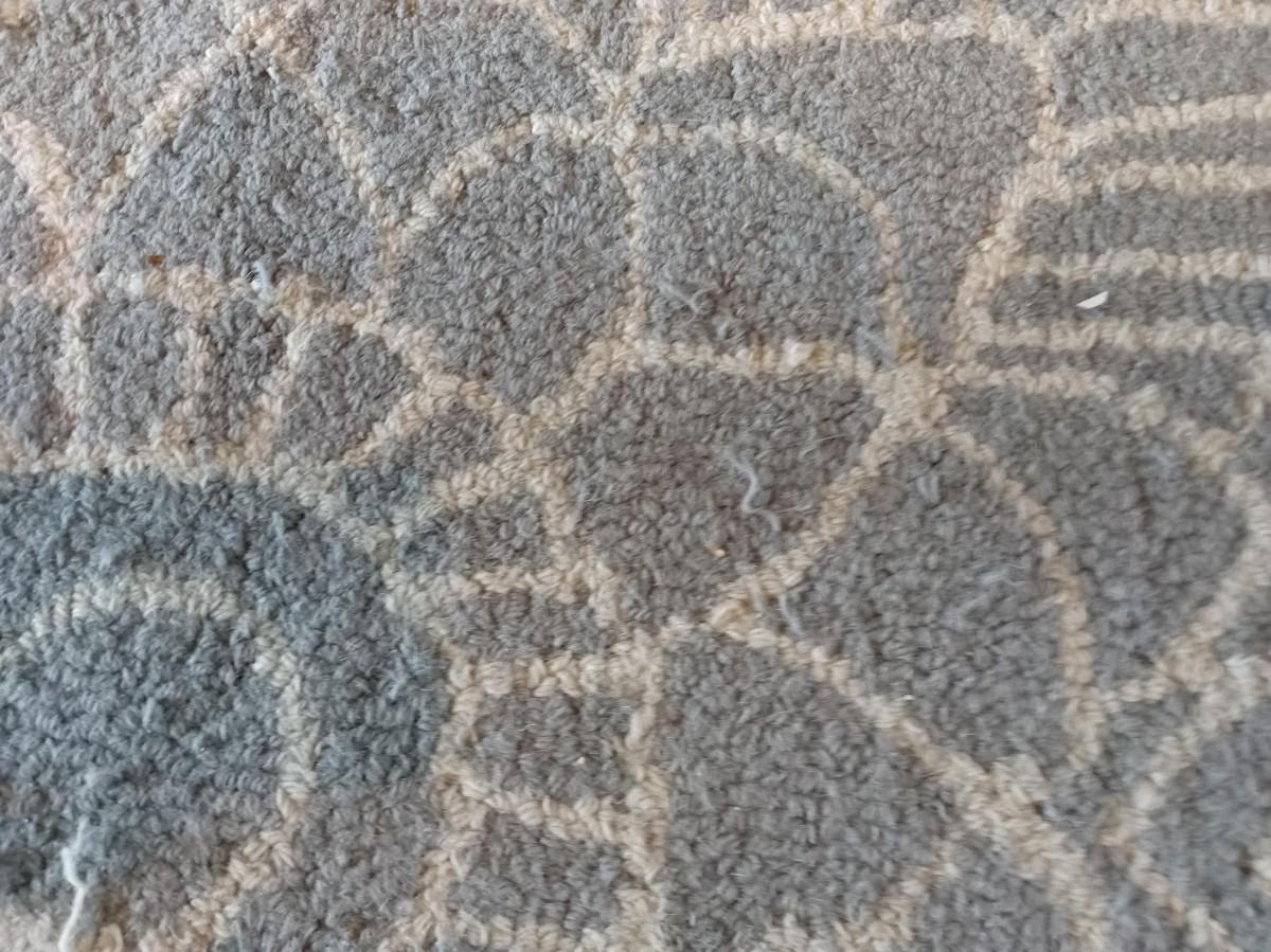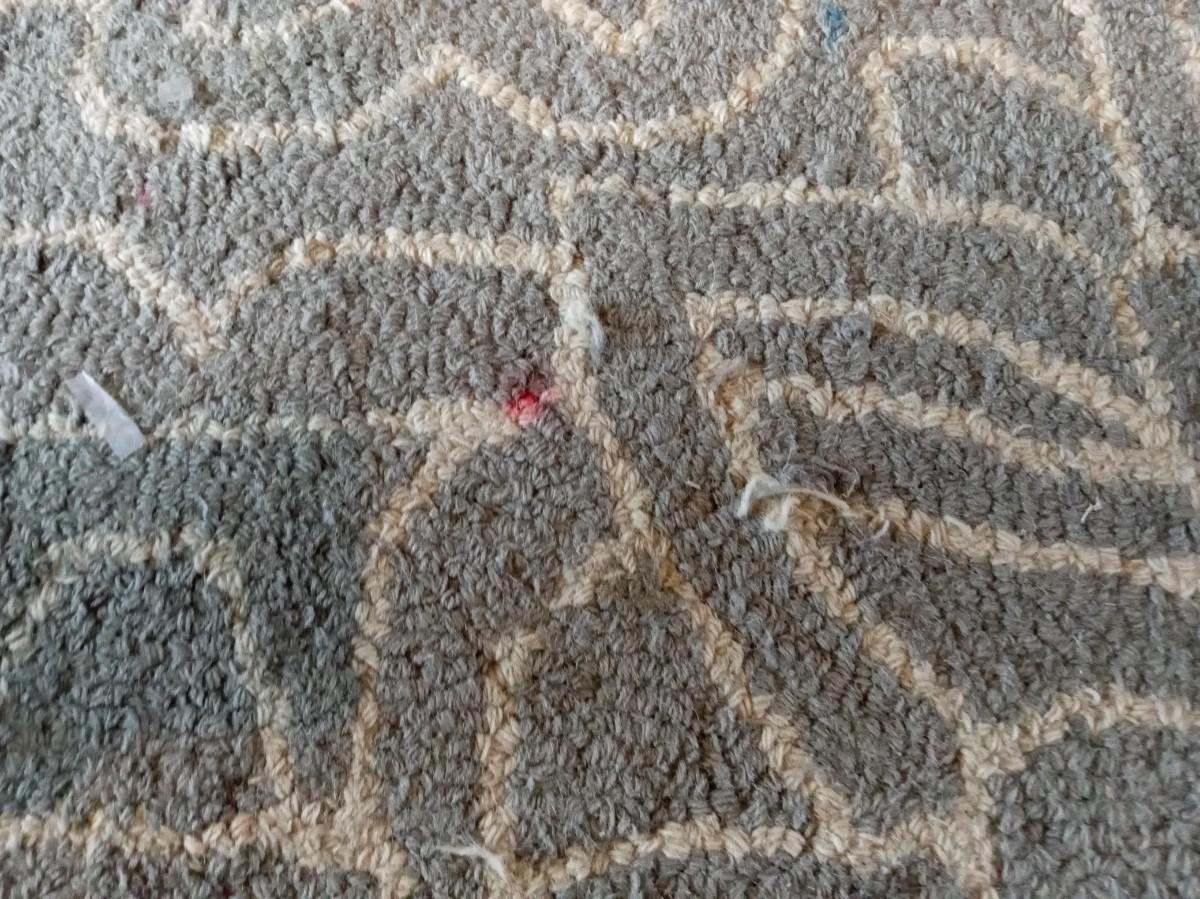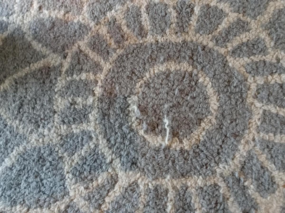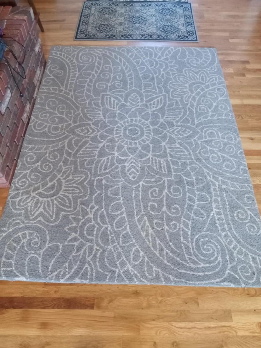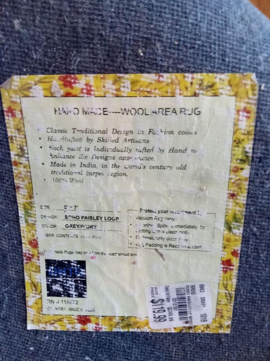 THE WOOL AREA RUG IS 5' X 7' IT HAS SOME SNAGS AND A FAINT RED SPOT THE SIZE OF A NICKEL