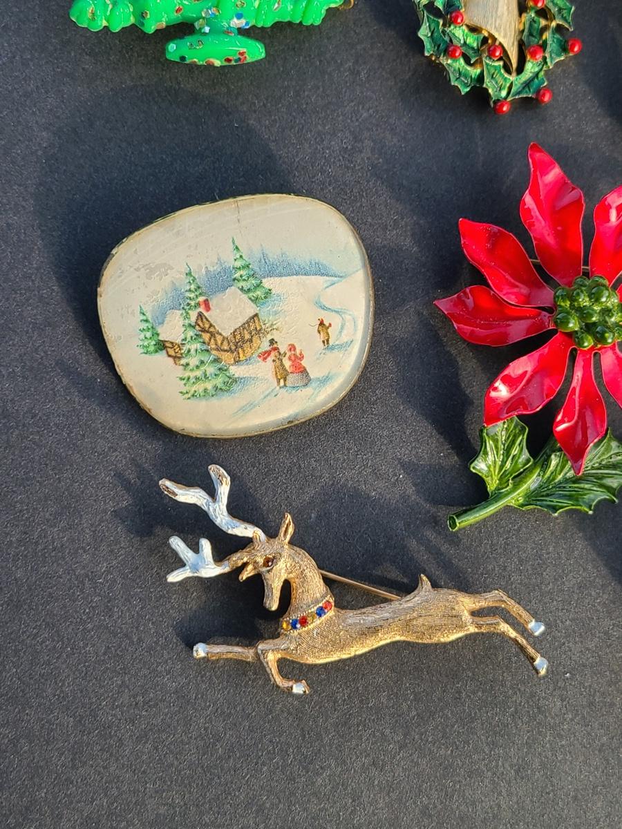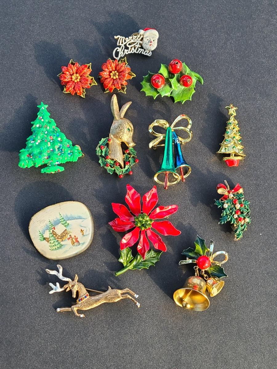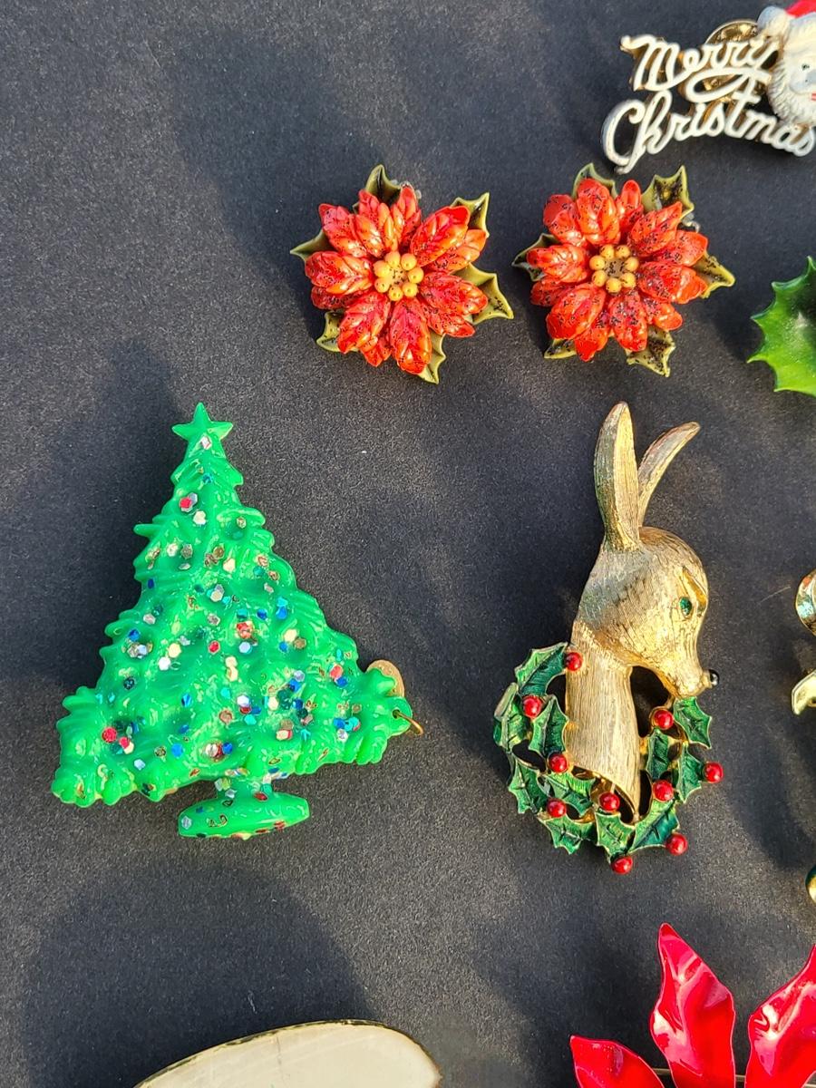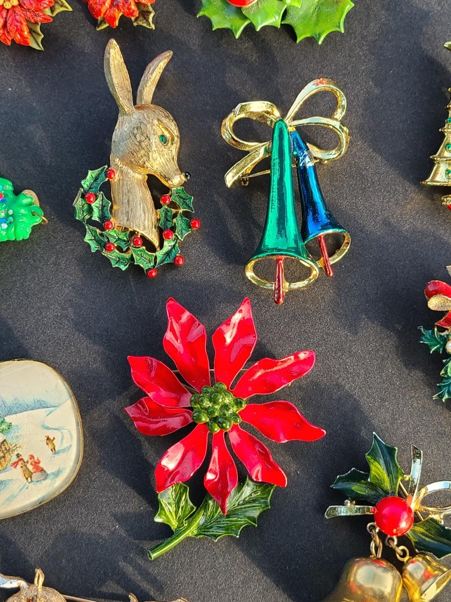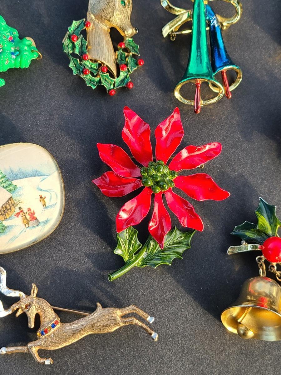 Lot 501: Vintage Holiday Brooches: Rudolph, Santa, Poinsettia and More