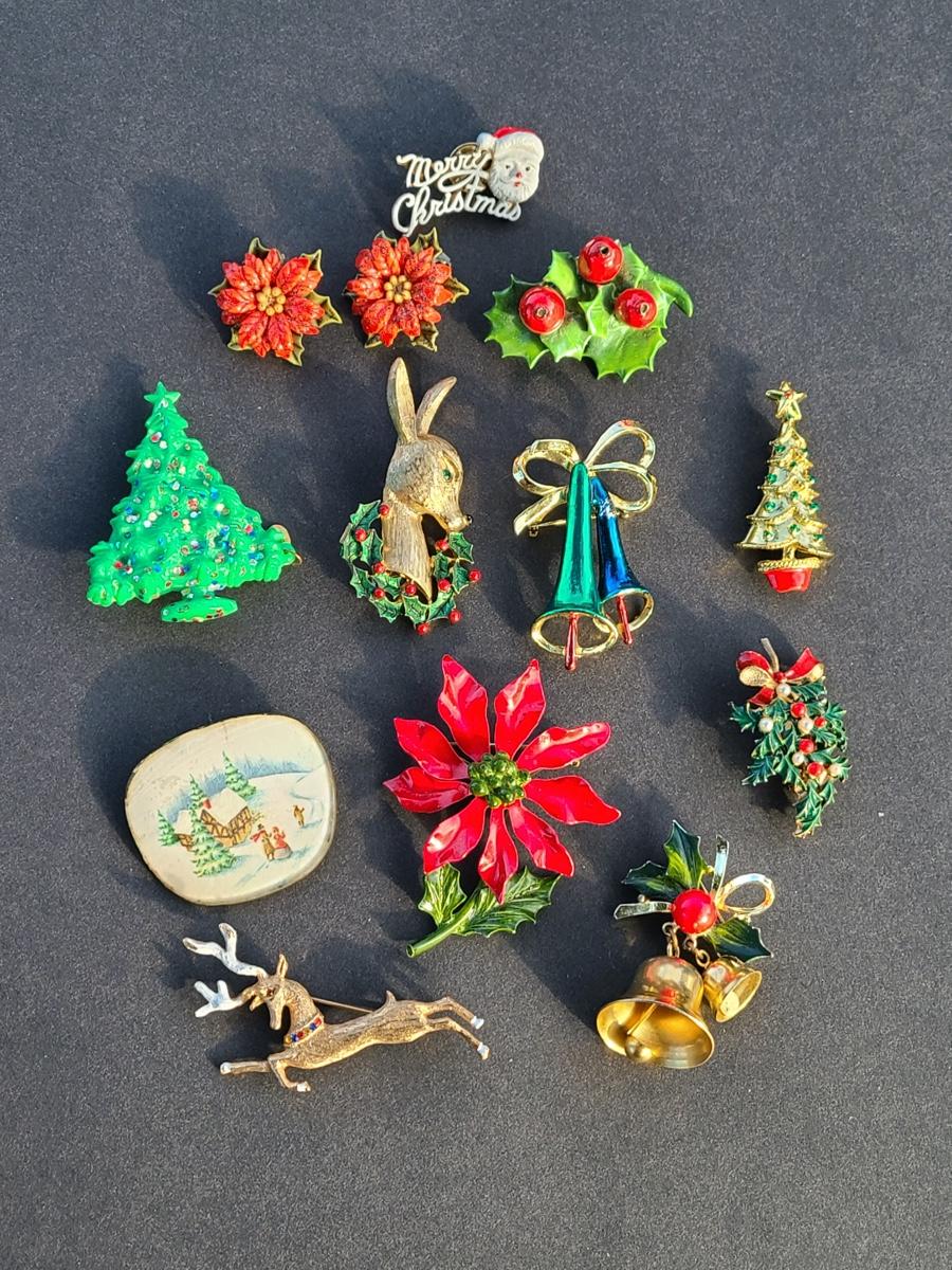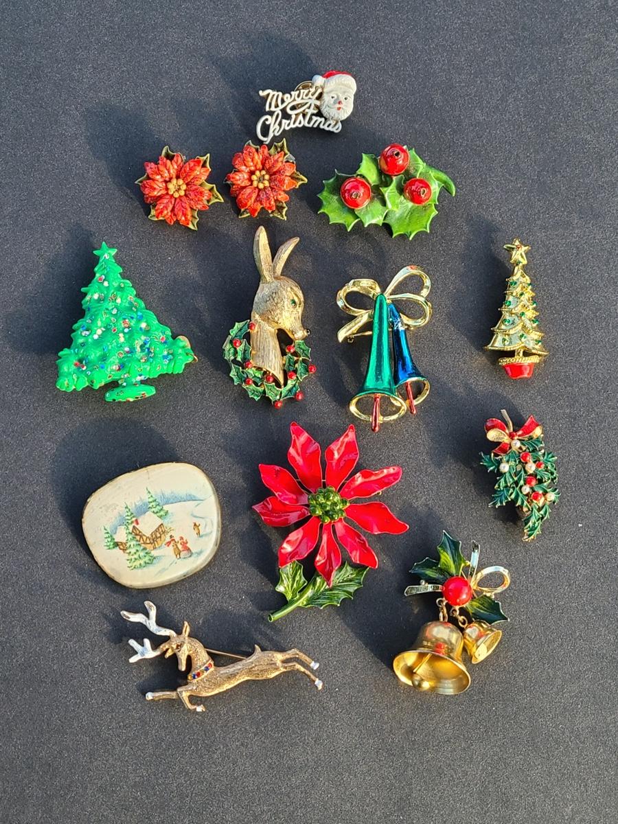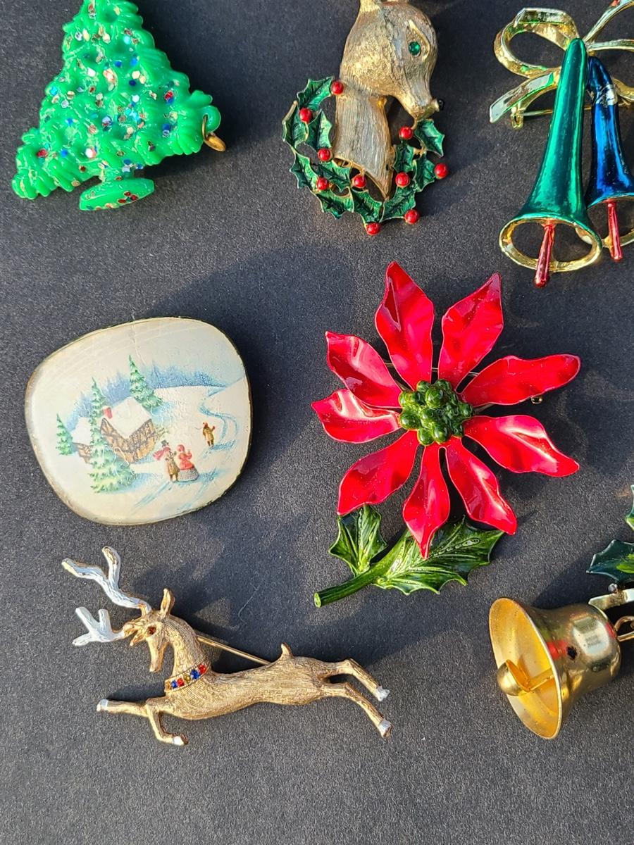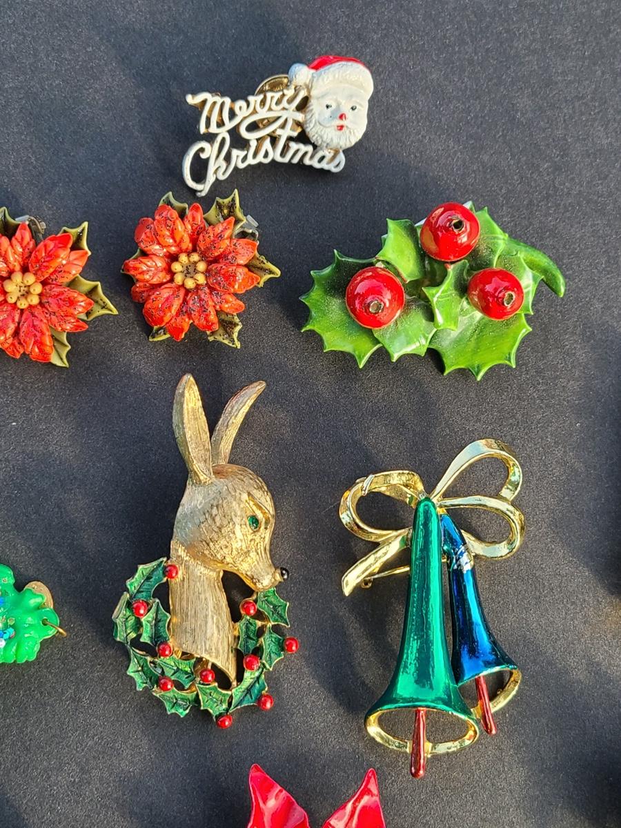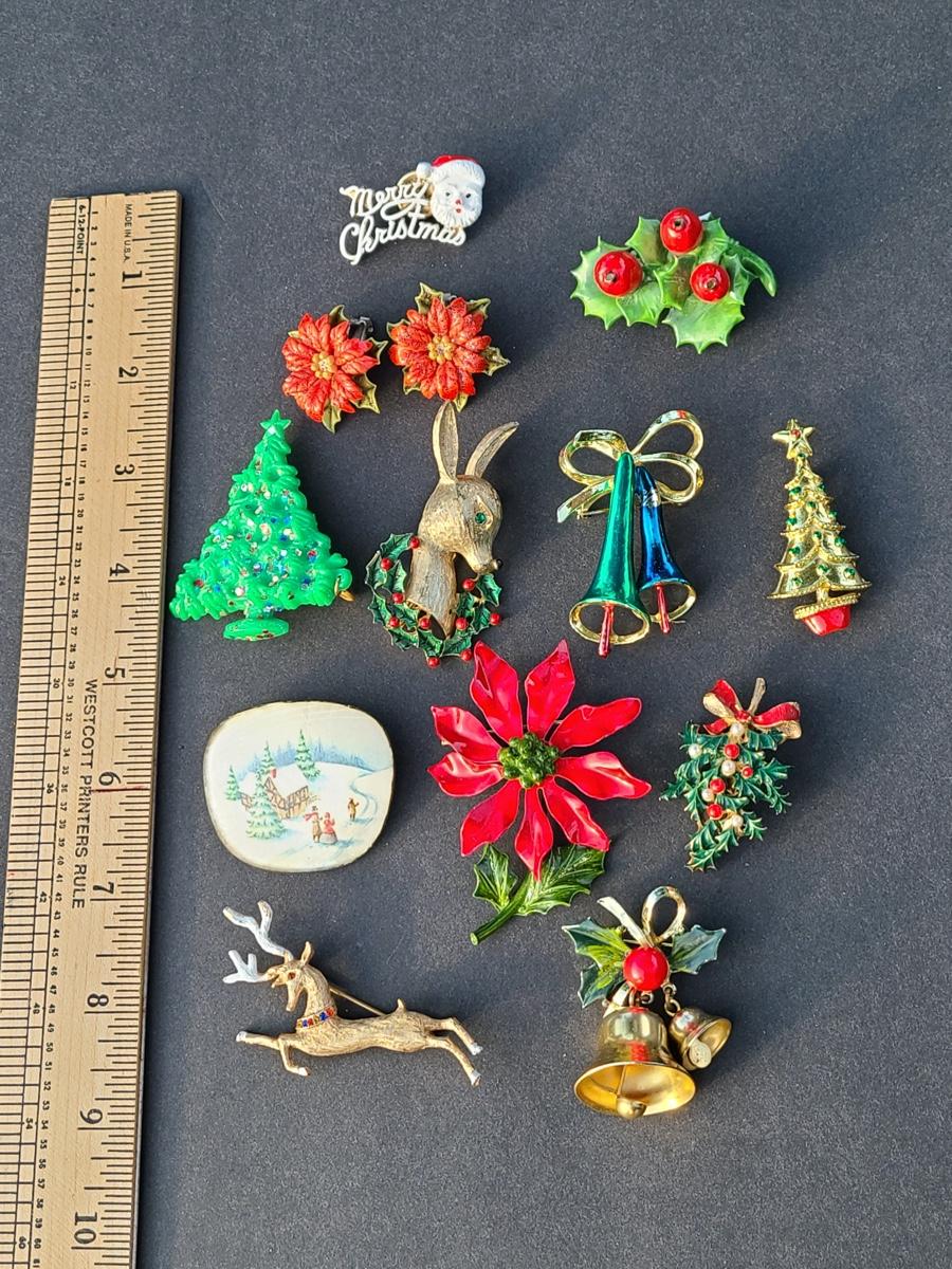 Lot 501: Vintage Holiday Brooches: Rudolph, Santa, Poinsettia and More