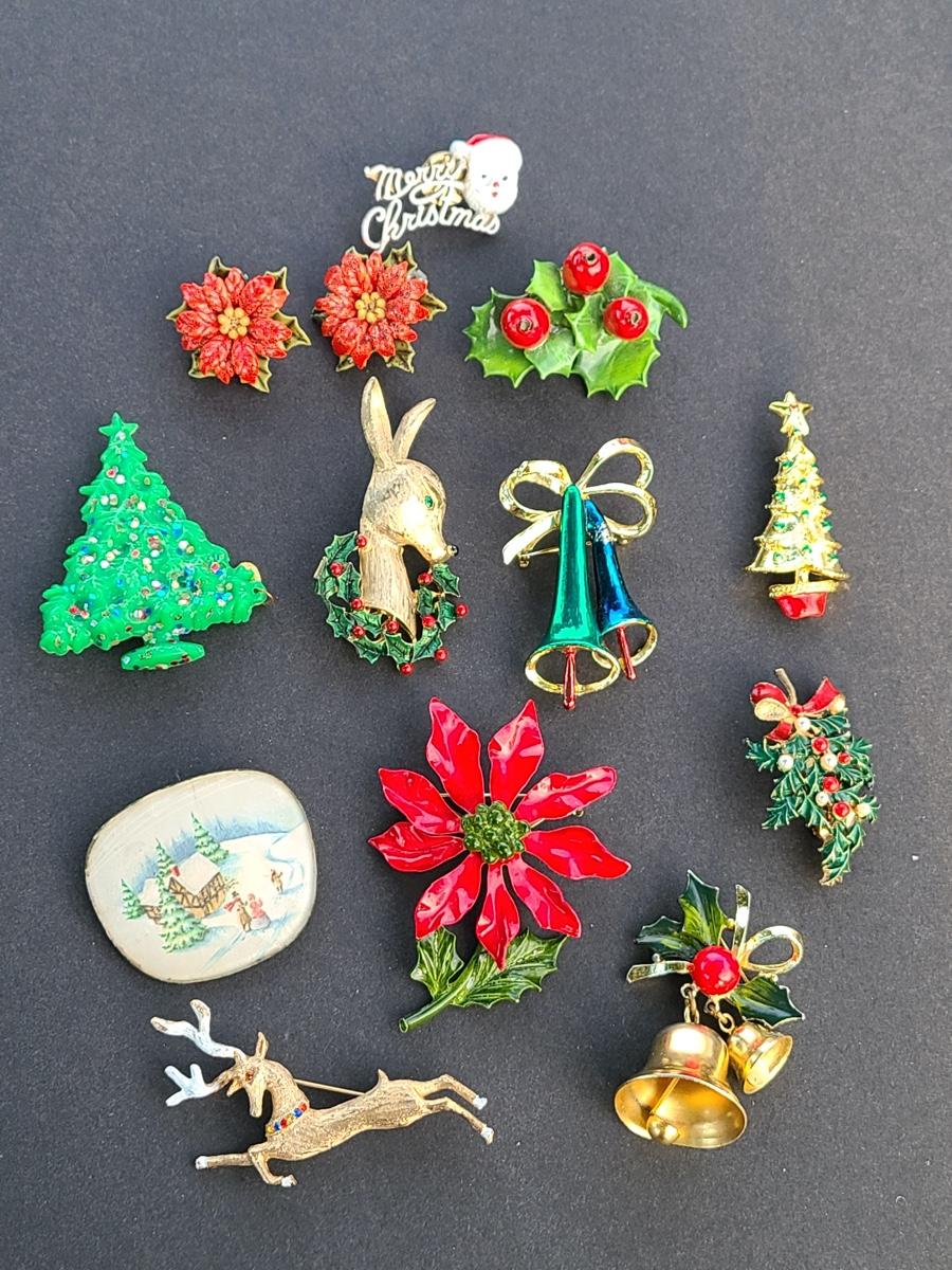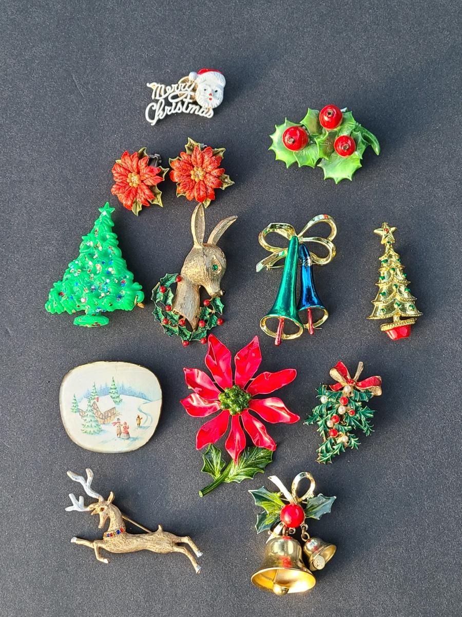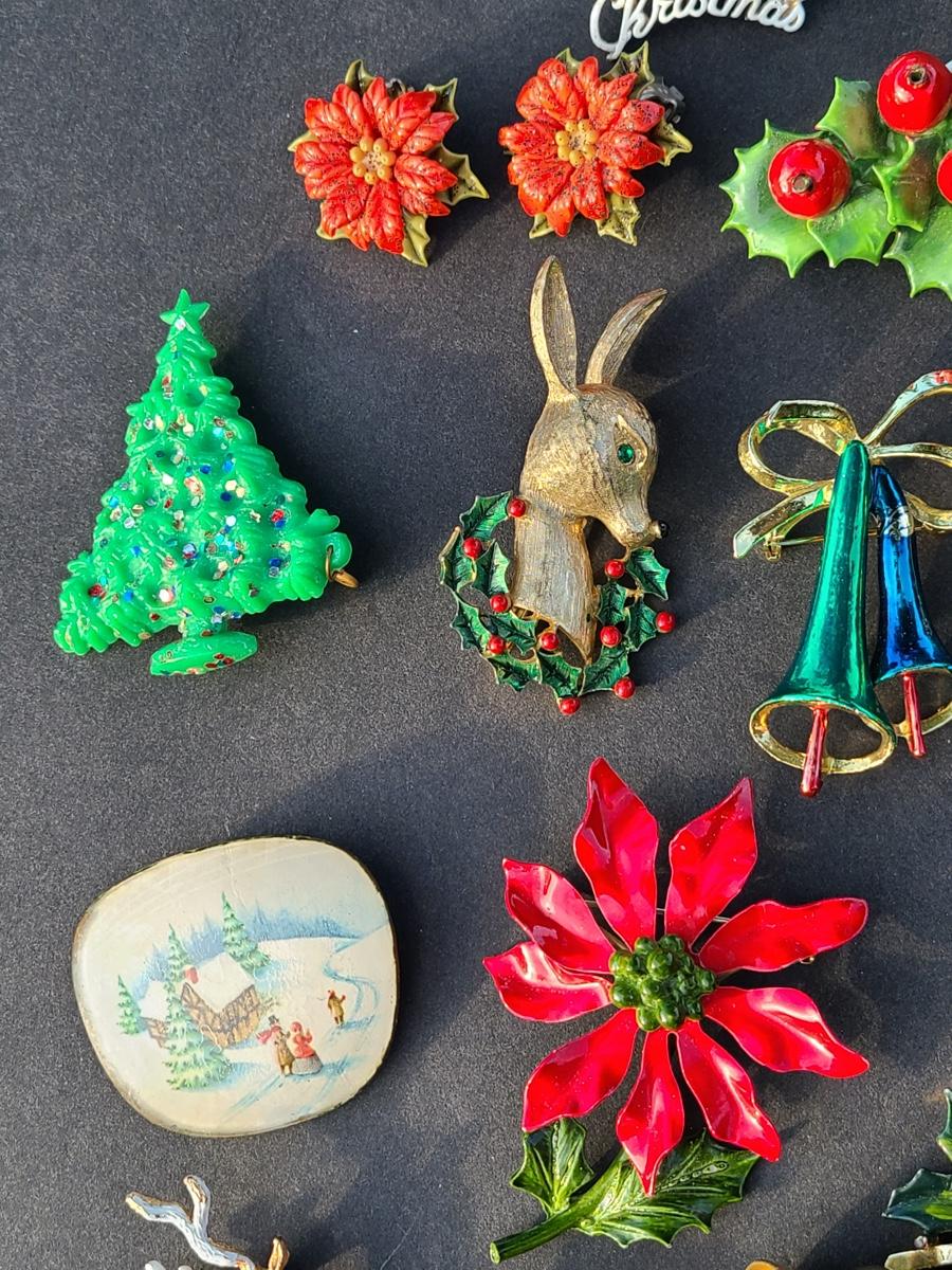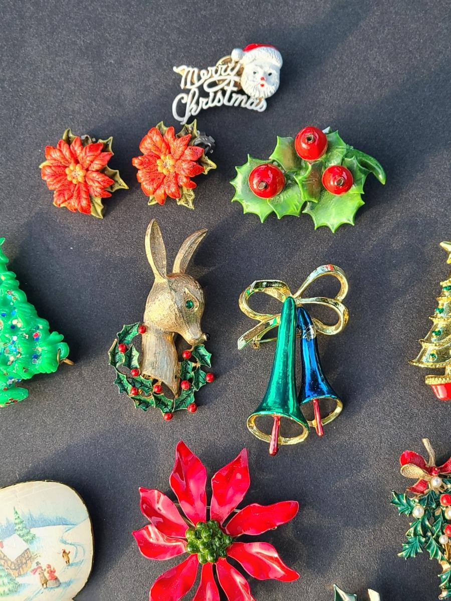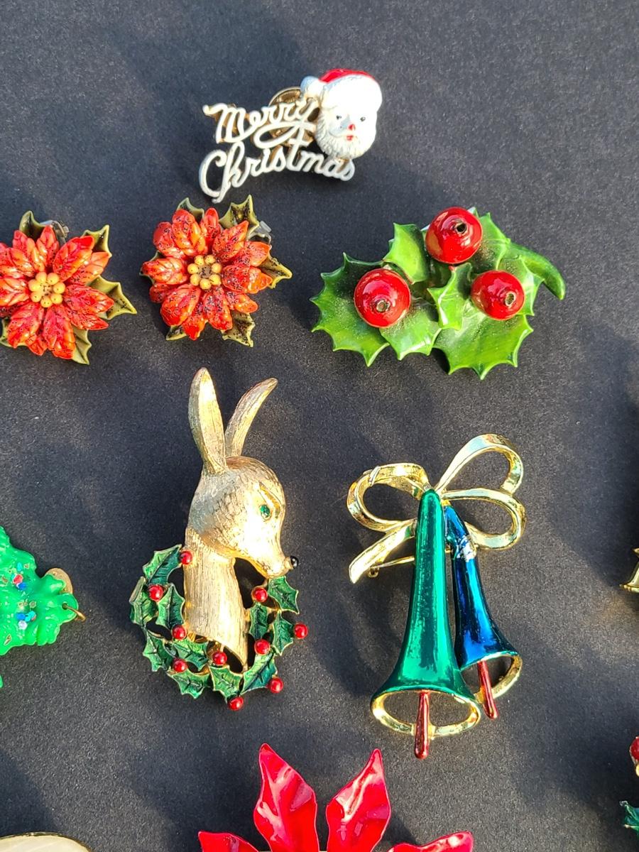 Lot 501: Vintage Holiday Brooches: Rudolph, Santa, Poinsettia and More