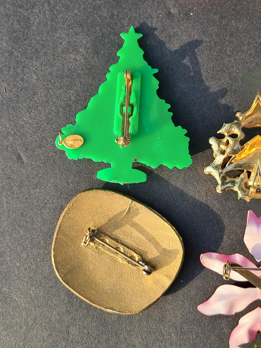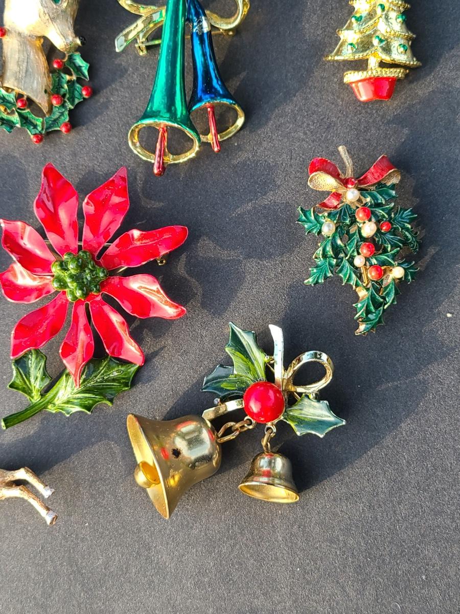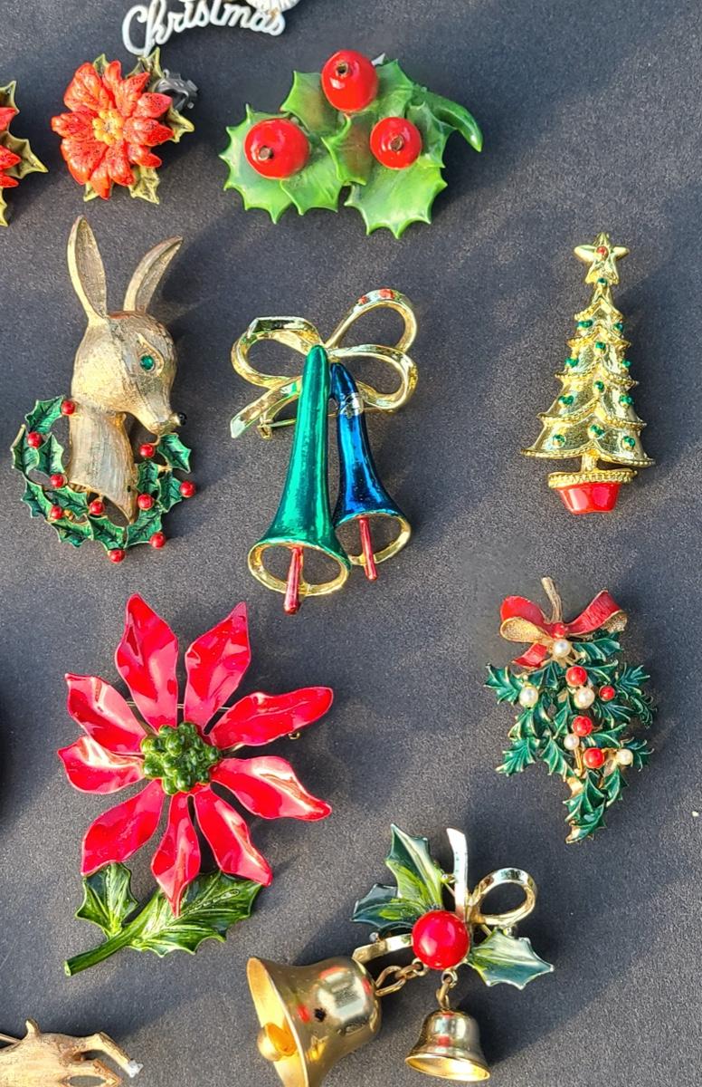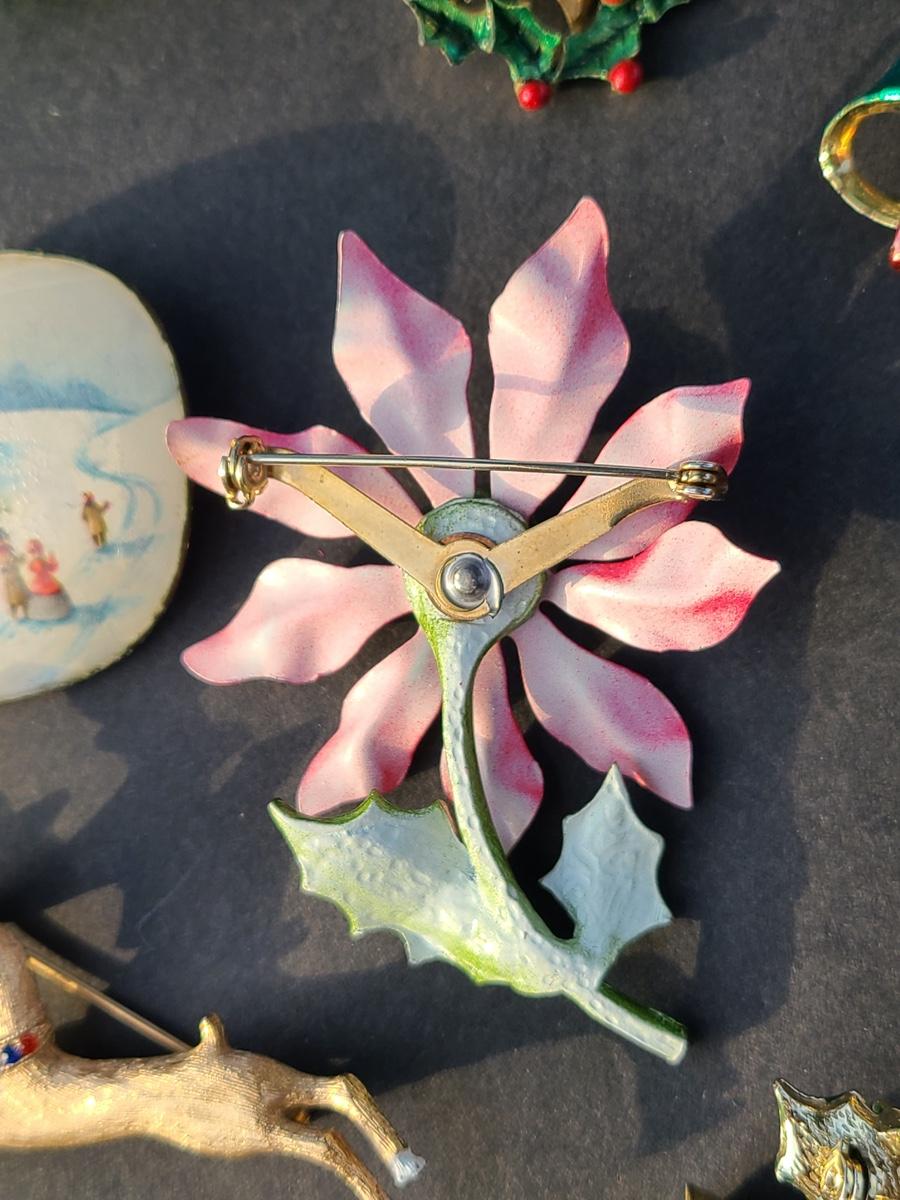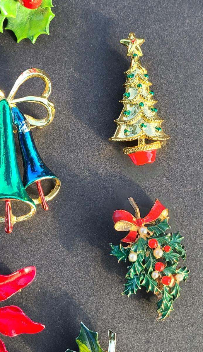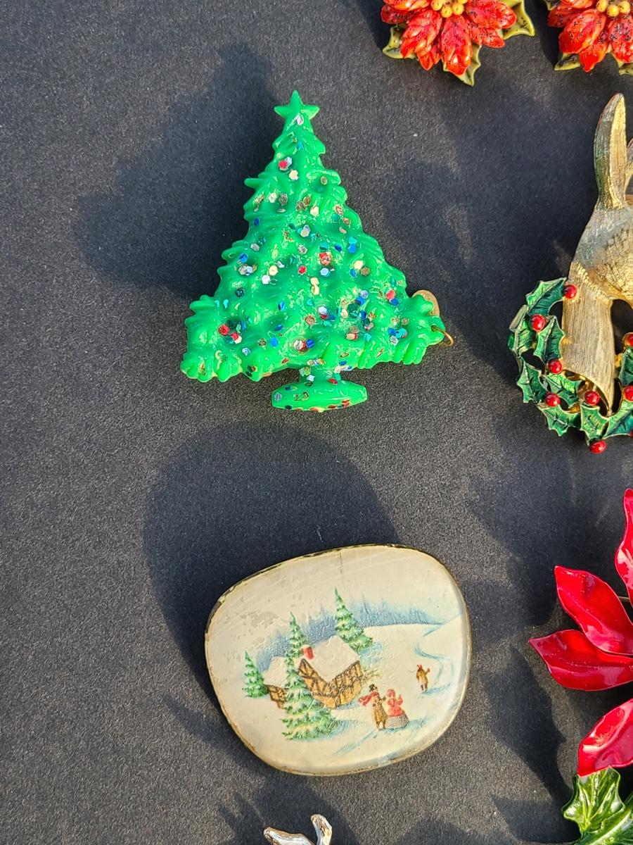 Lot 501: Vintage Holiday Brooches: Rudolph, Santa, Poinsettia and More