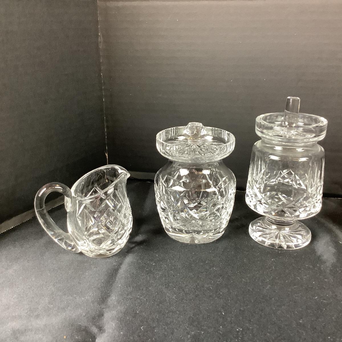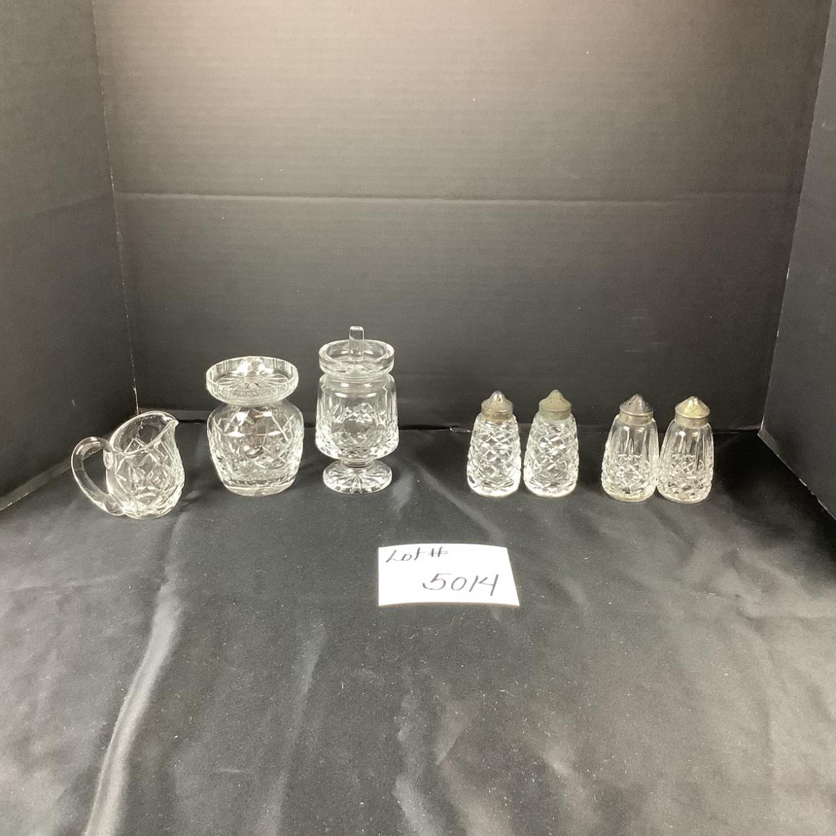 Lot 5014. Waterford Salt/Pepper Sets, Creamer, Mustard Jar, Jam Jar