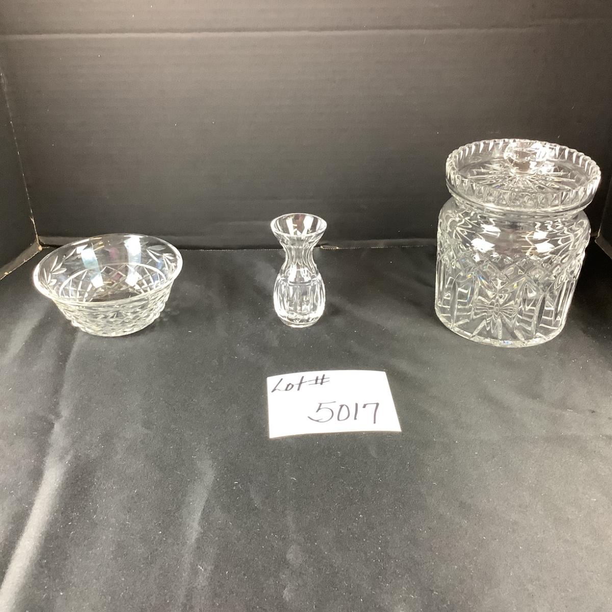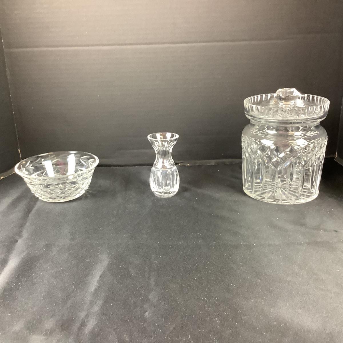 Lot. 5017. Waterford Biscuit Barrel with Lid, Violet Vase and  Crystal Bowl