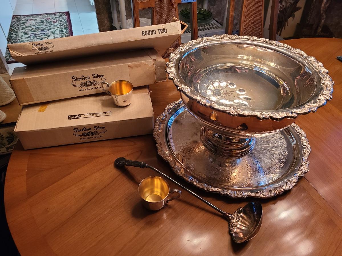 Lot 501D: Huge Sheridan Punch Bowl Set (Silver-plate with Gold Tone Cups)