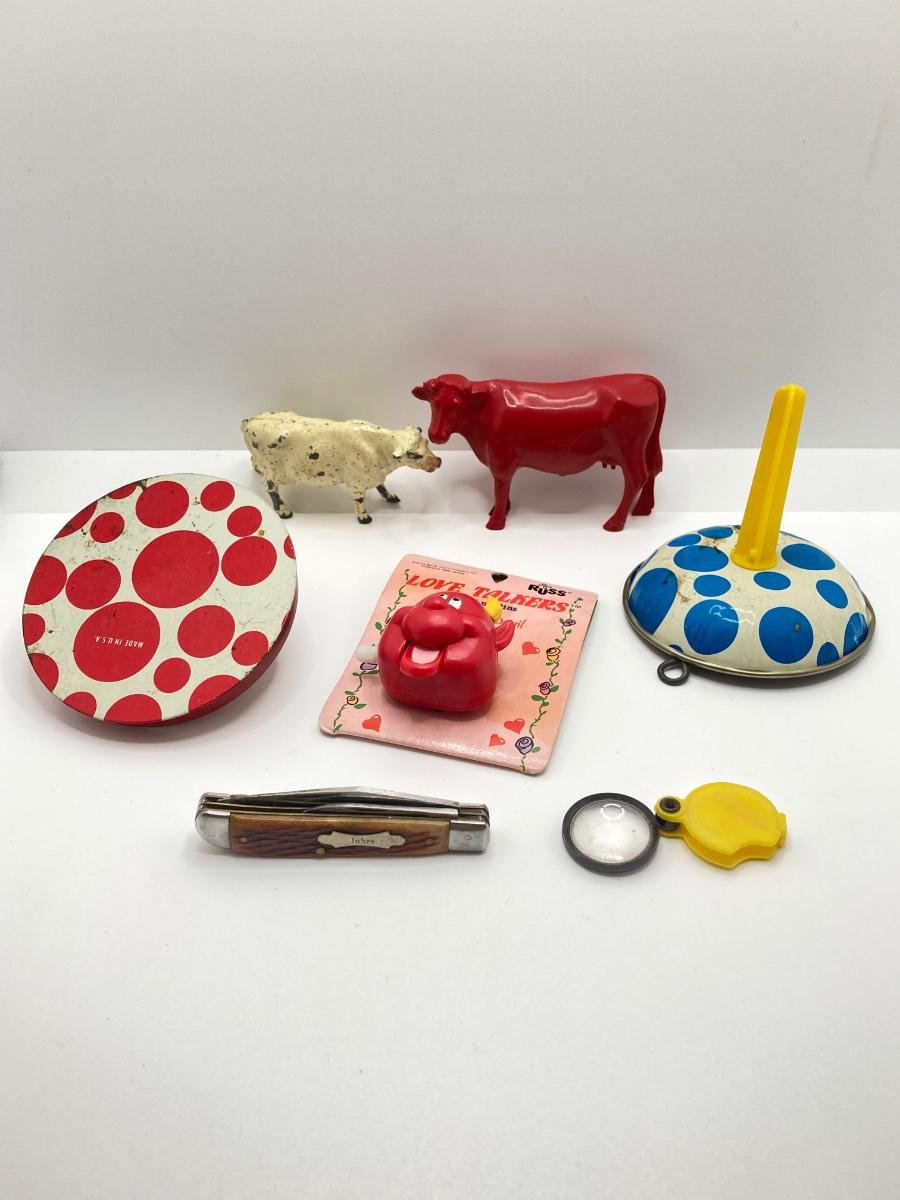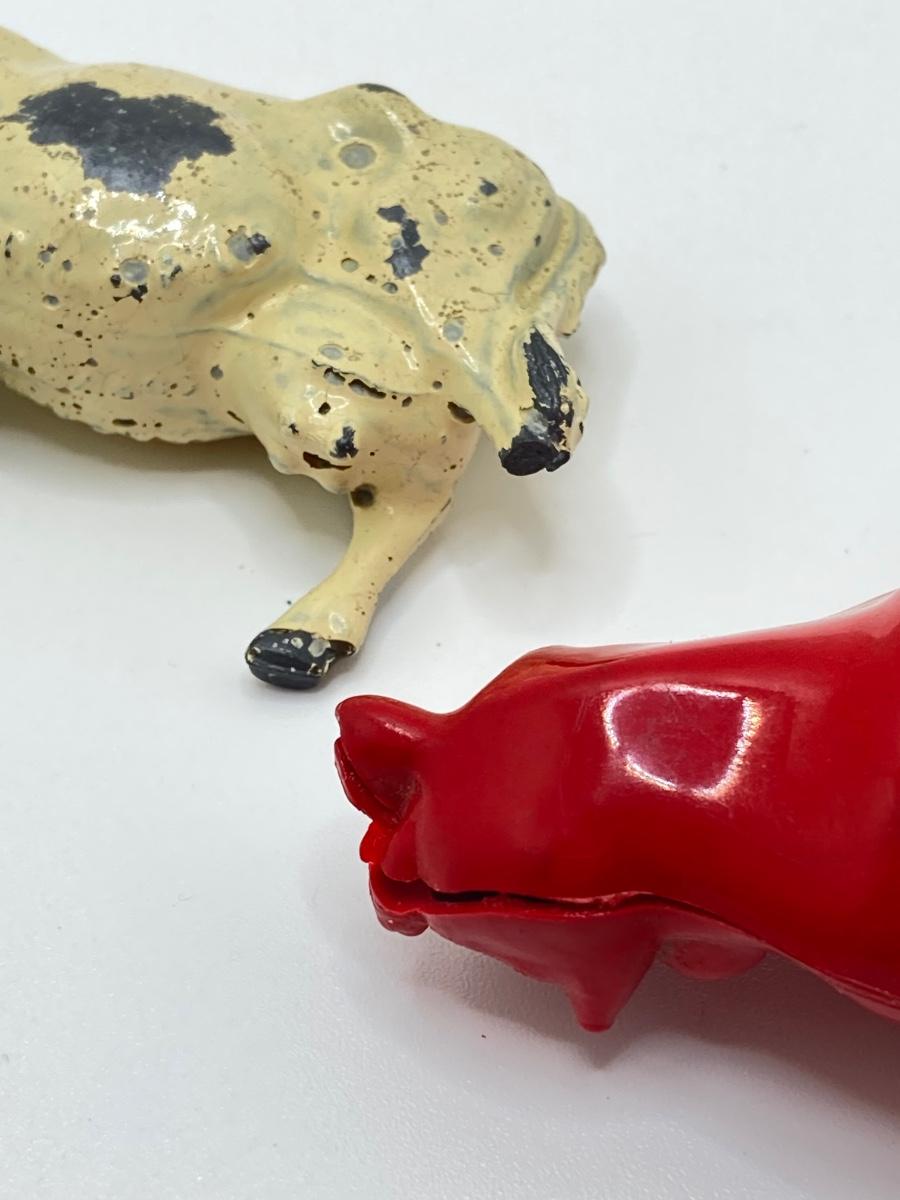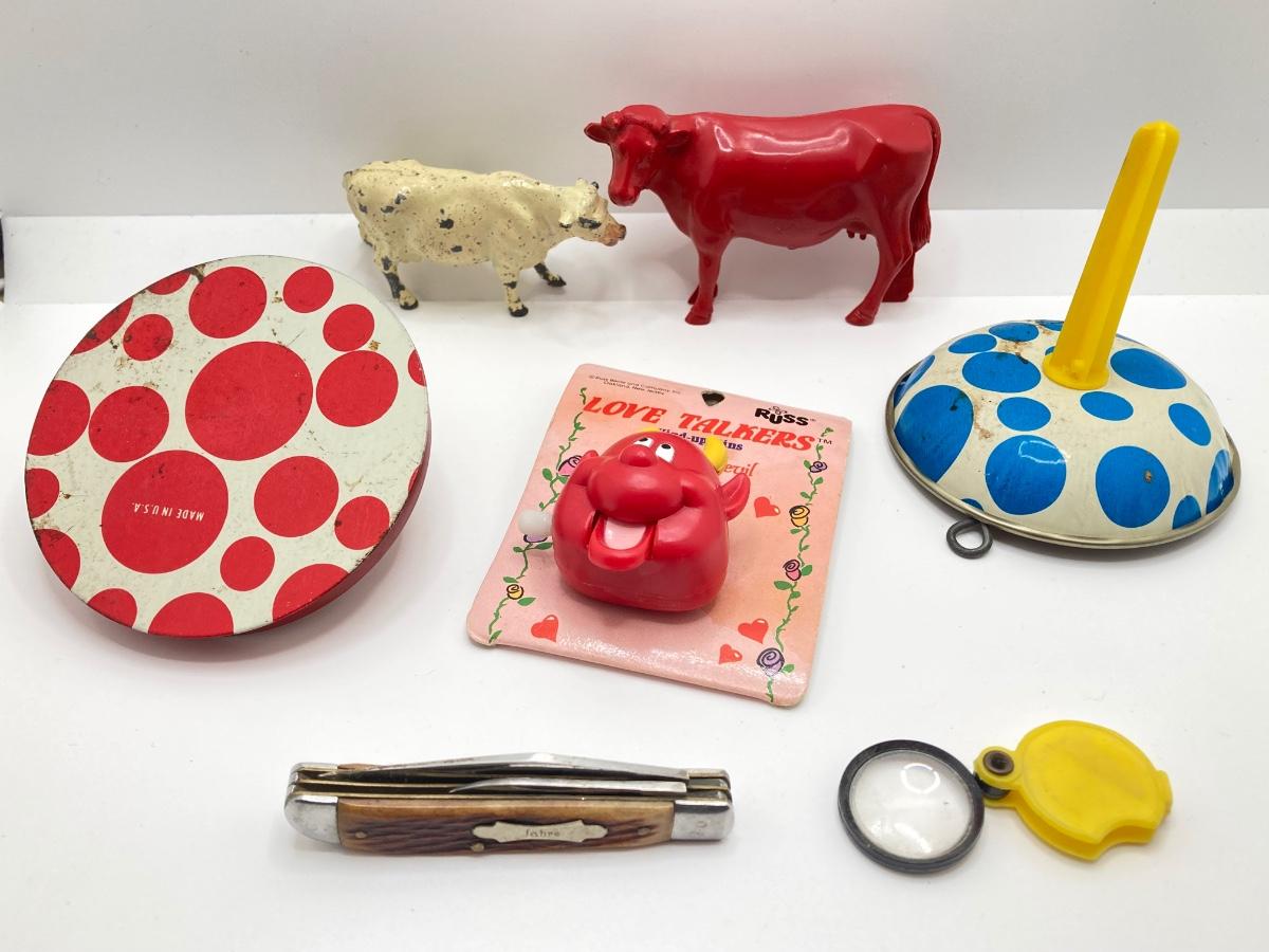 Lot 502: Vintage Toys / Noise Makers, Animal Figurines (Metal and Plastic), Sabre Pocket Knife and More