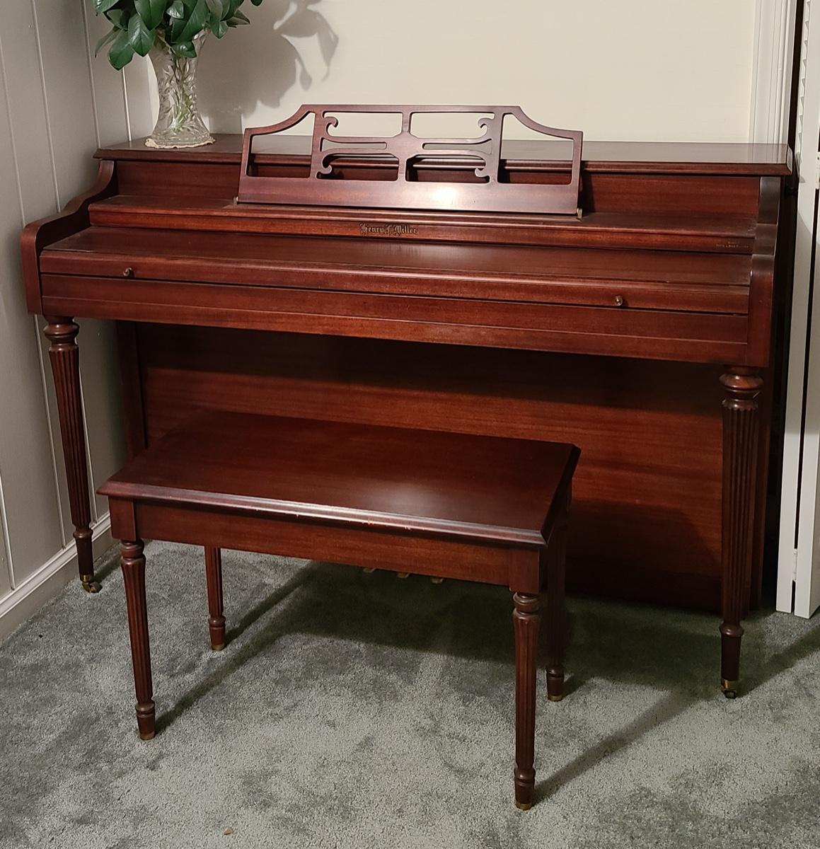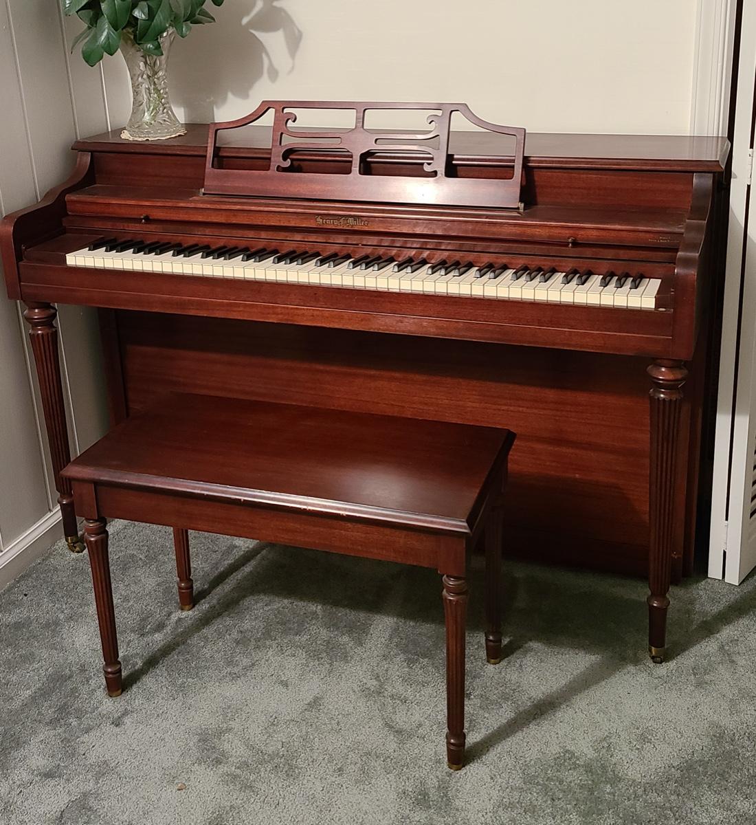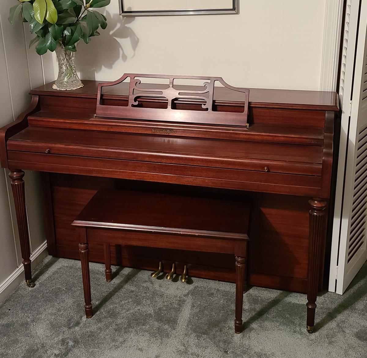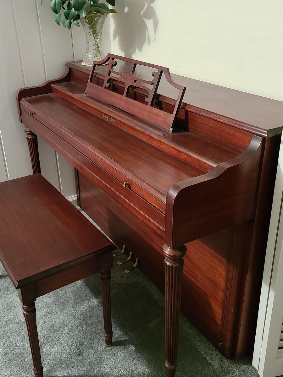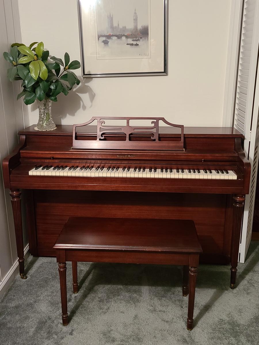 57x24x38 inches tall. Lovely vintage piano with bench. This will need to be tuned. YOU WILL NEED TO MOVE YOURSELF, OFF FIRST FLOOR, DOWN TWO STEPS, DOWN SIDEWALK TO DRIVEWAY. Please see all pictures as they are the best representation of the items. The pictures show condition, measurements if taken, and what is included in the lot. Due to the large amount that we photograph and the time frame, we are not always able to take measurements. All items unless noted, are pre-owned and have been used. If you purchased furniture, you must bring help. We do not allow one person to carry large furniture out on their own. Bring help, tools and a truck for the safety of our client’s homes, and your personal safety. Company policy. Thank you.