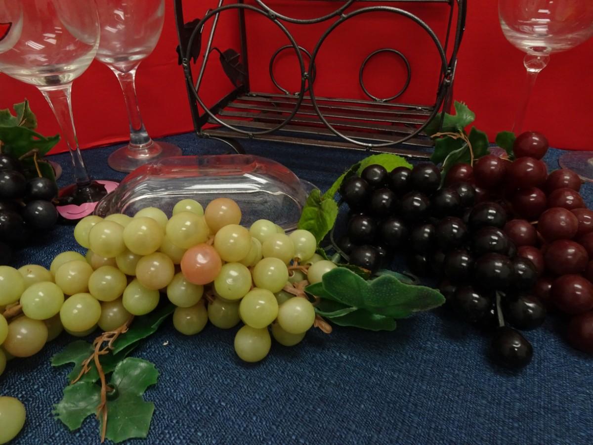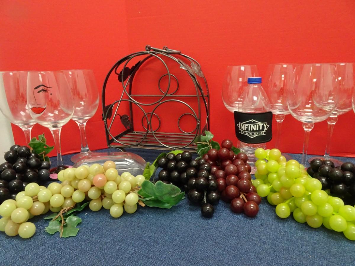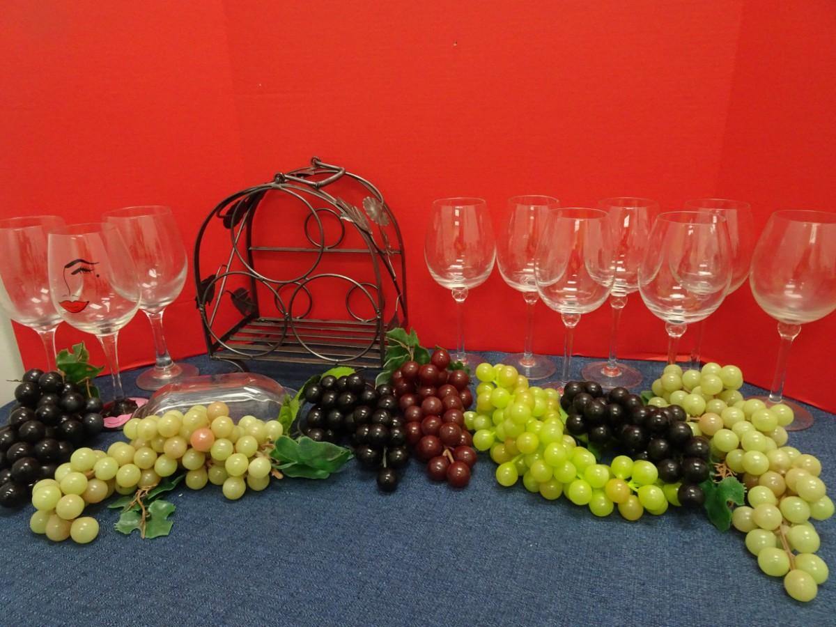 TABLE TOP WINE BOTTLE RACK, WINE GLASSES AND RUBBER GRAPES