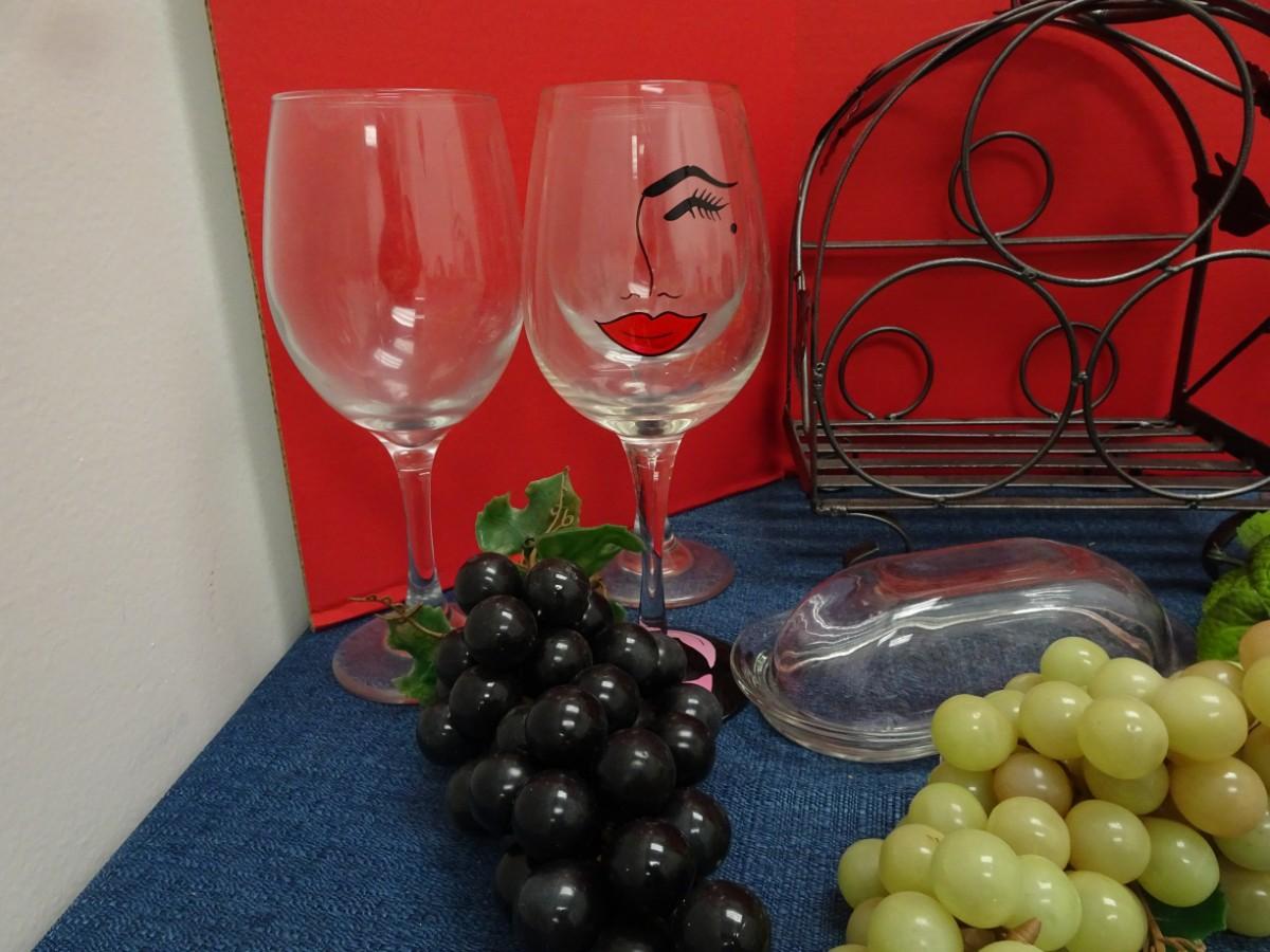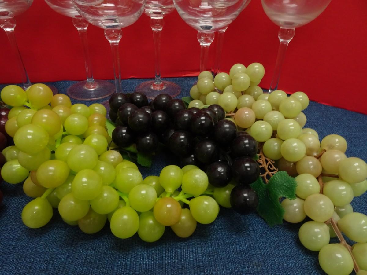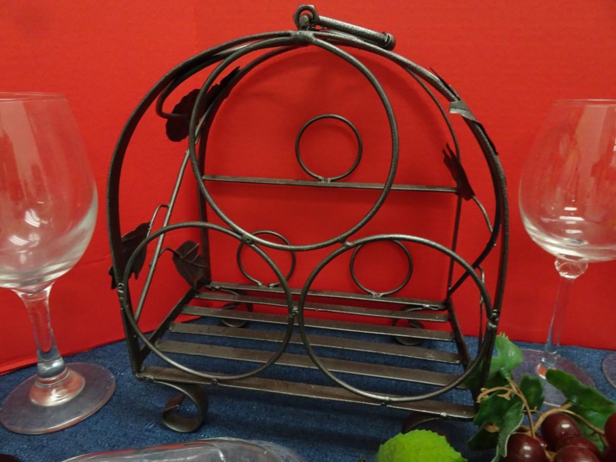 TABLE TOP WINE BOTTLE RACK, WINE GLASSES AND RUBBER GRAPES