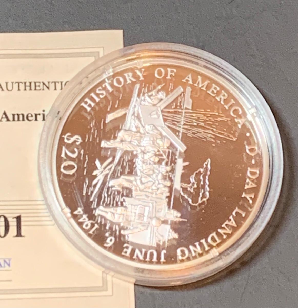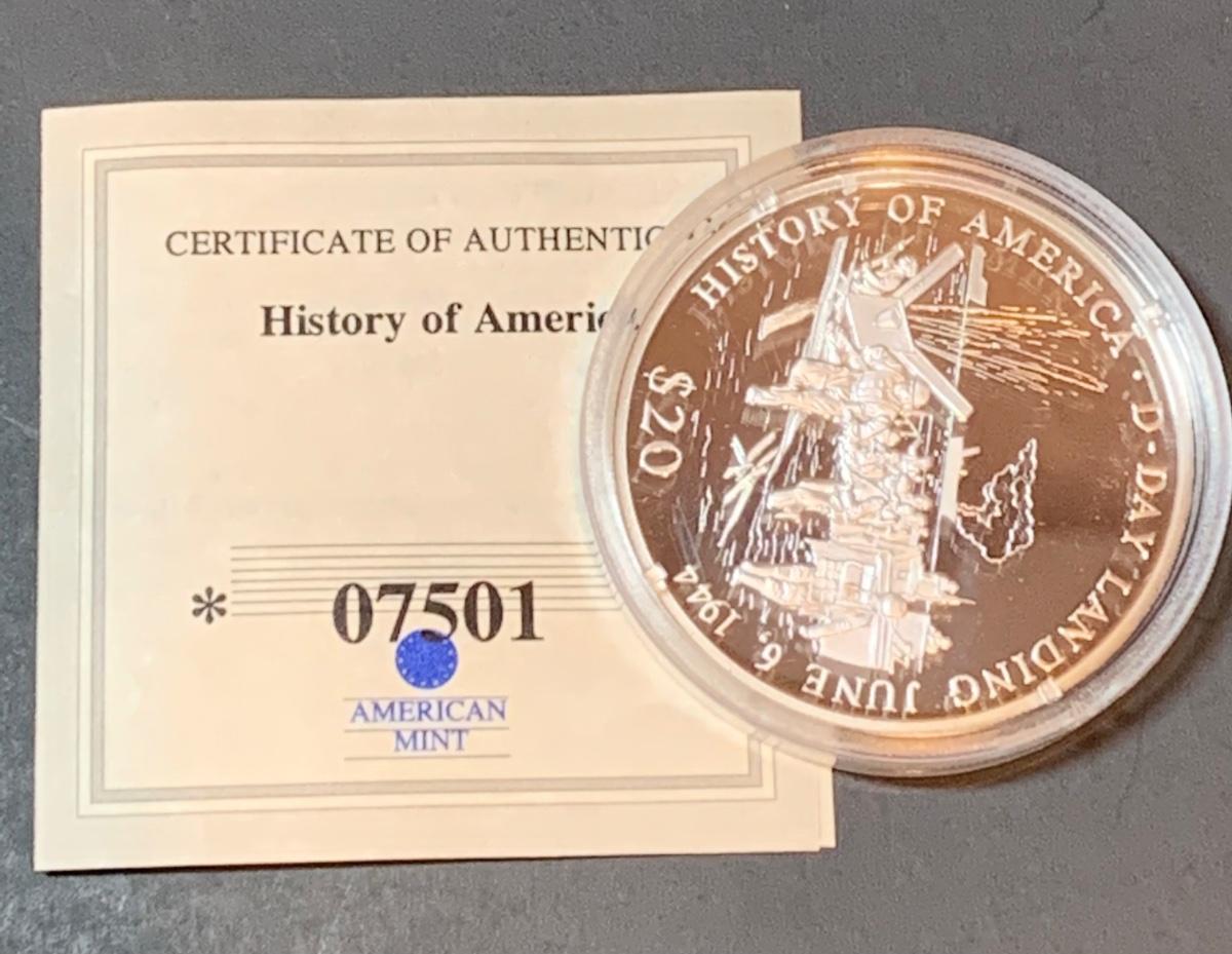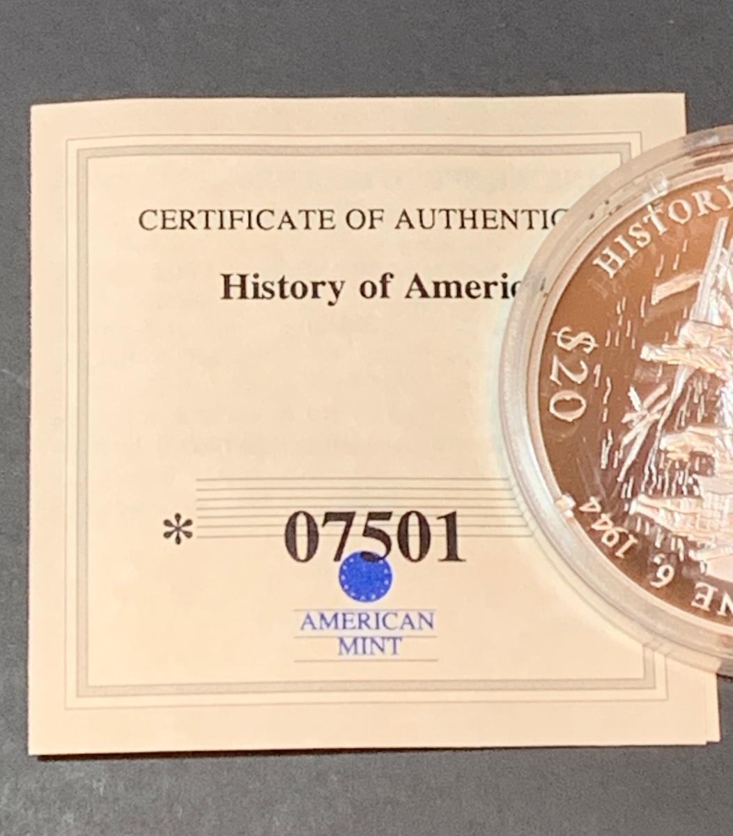 Collectible History of America D-Day commemorative proof coin with COA , .999 silver, face value $20