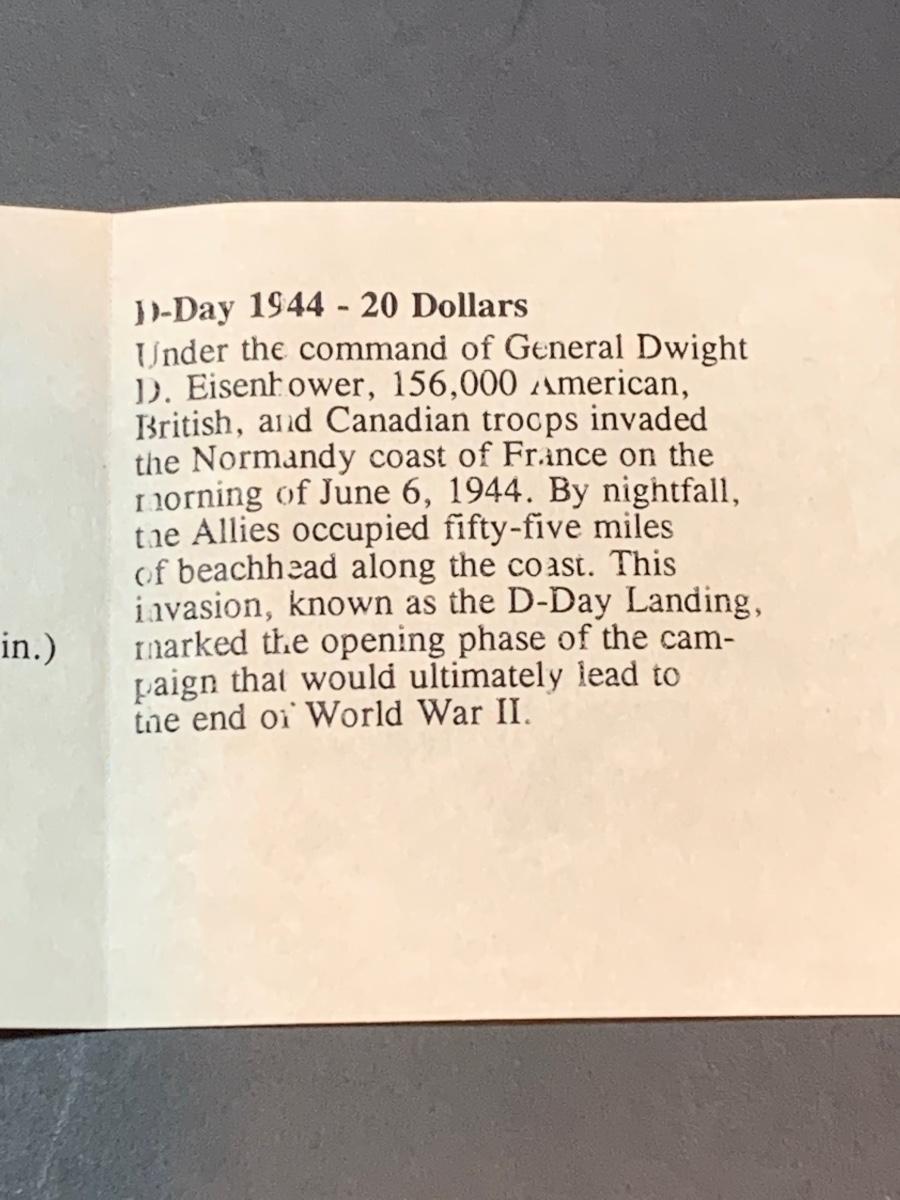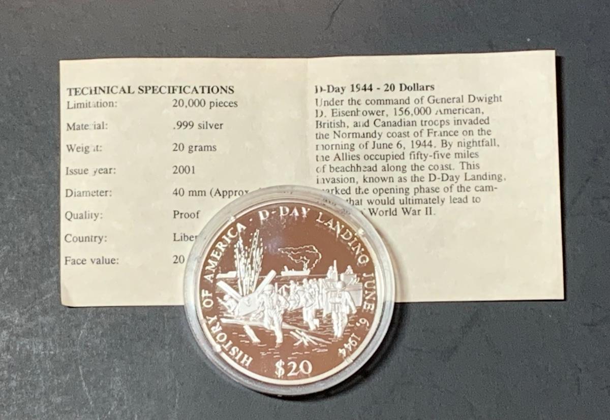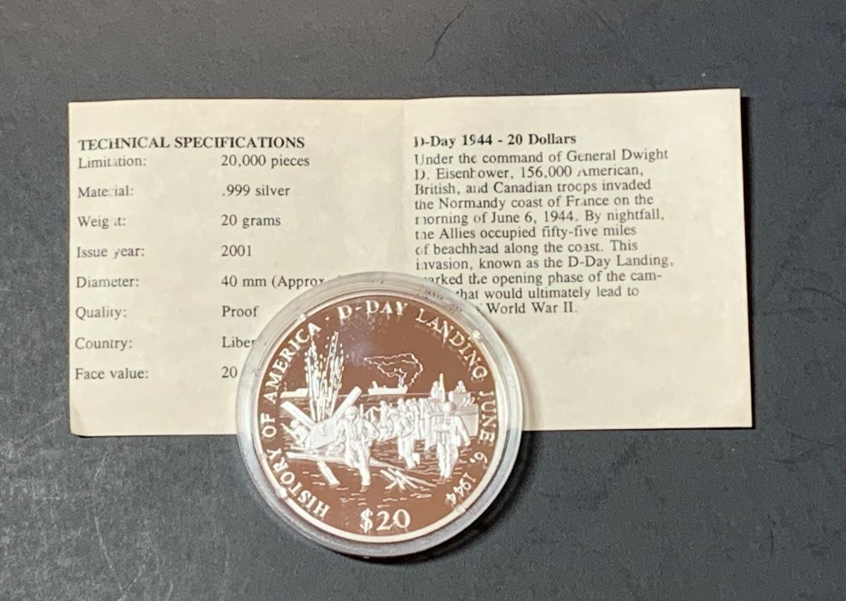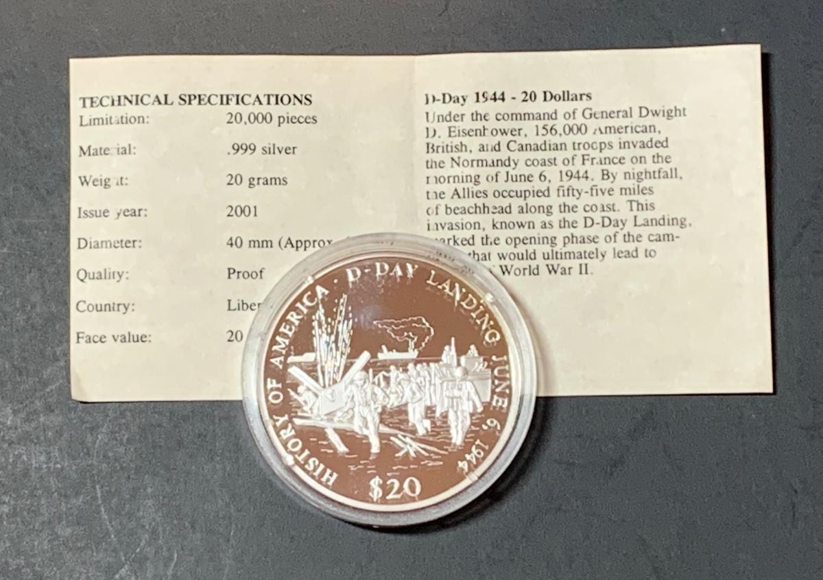 Collectible History of America D-Day commemorative proof coin with COA , .999 silver, face value $20