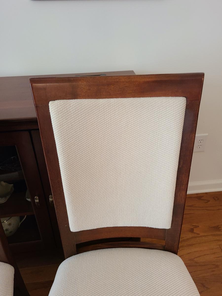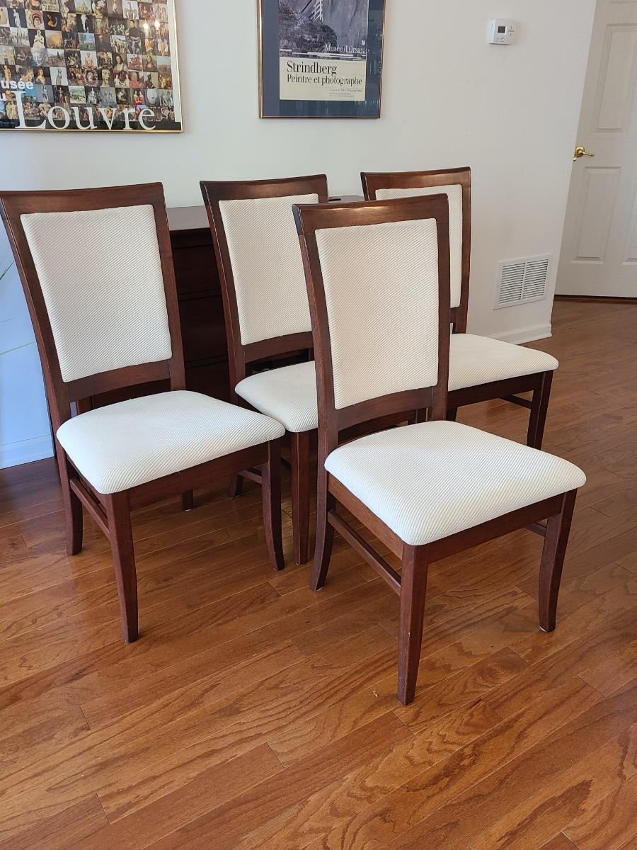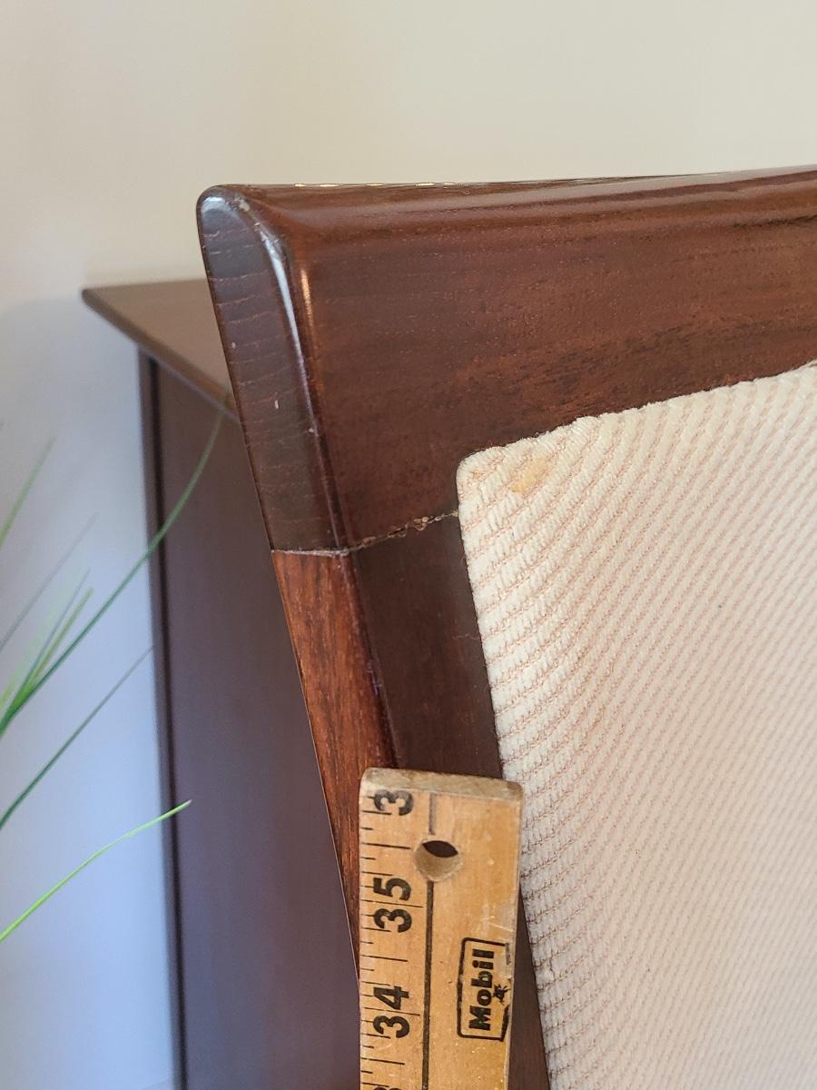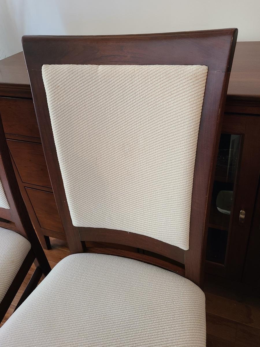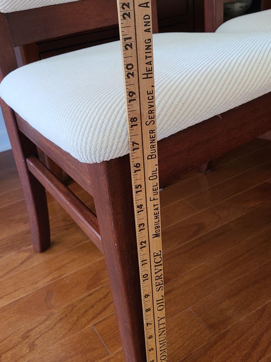 Vintage set of Benny Linden Design chairs made in Thailand. Benny Linden is known for his MCM dining sets and teak chairs. These are more of a cherry in color, and have a fabric seat on chair and back. Solid in form, and sleek design. The fabric shows minimal wear for their age! Lot is for four chairs only. Please see all pictures as they are the best representation of the items. The pictures show condition, measurements if taken, and what is included in the lot. Due to the large amount that we photograph and the time frame, we are not always able to take measurements. All items unless noted, are pre-owned and have been used. If you purchased furniture, you must bring help. We do not allow one person to carry large furniture out on their own. Bring help, tools and a truck for the safety of our client’s homes, and your personal safety. Any damages that result to the property including walls, and floors due to moving of the furniture will be charged to the buyer. Company policy. Thank you.