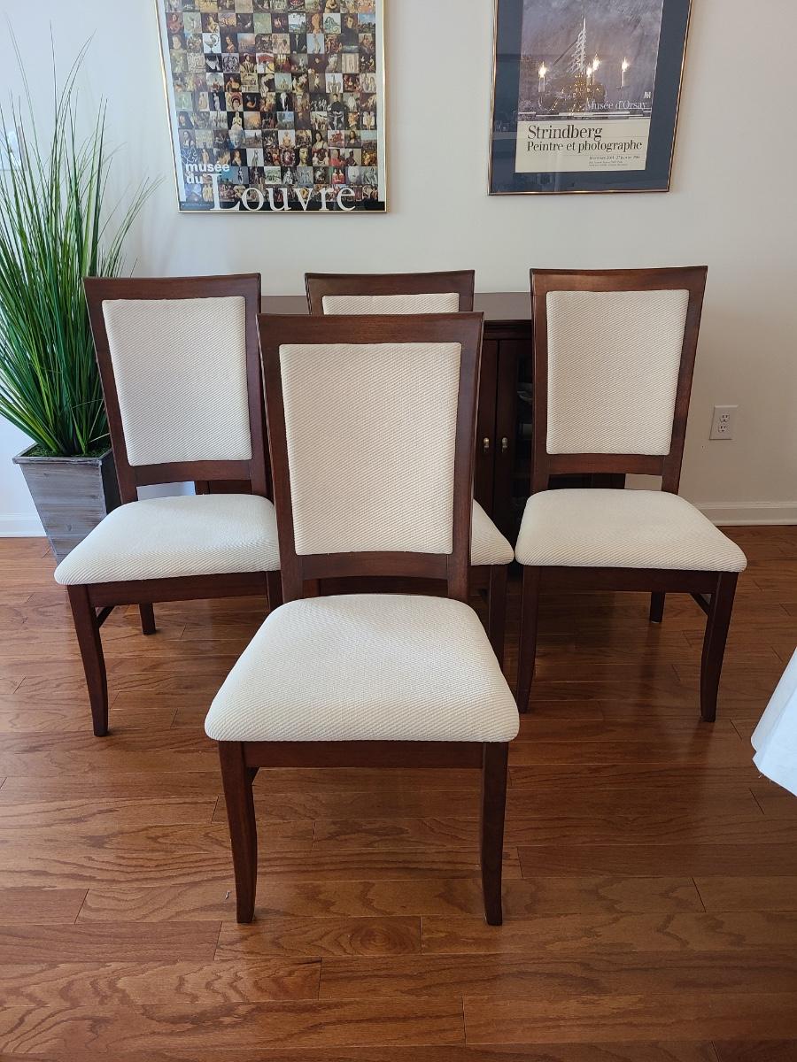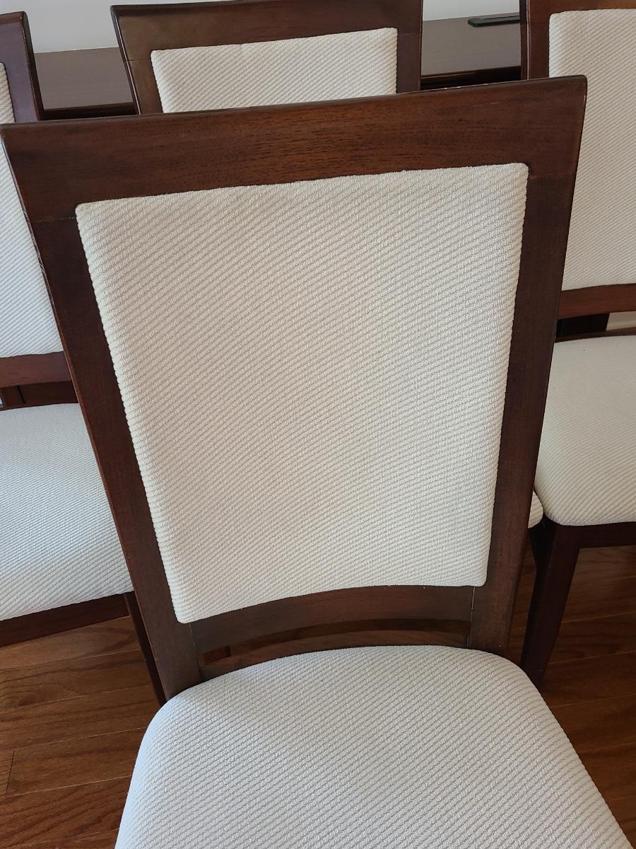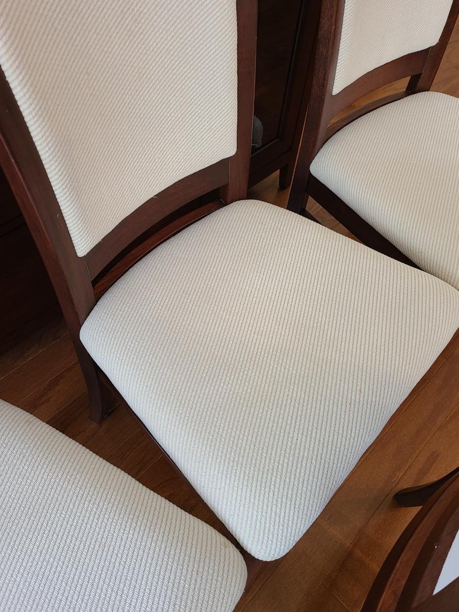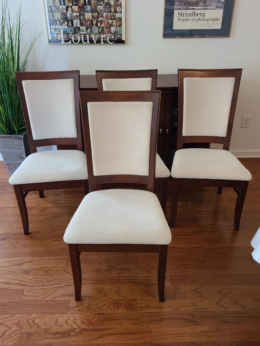 Vintage set of Benny Linden Design chairs made in Thailand. Benny Linden is known for his MCM dining sets and teak chairs. These are more of a cherry in color, and have a fabric seat on chair and back. Solid in form, and sleek design. The fabric shows minimal wear for their age! Lot is for four chairs only. Please see all pictures as they are the best representation of the items. The pictures show condition, measurements if taken, and what is included in the lot. Due to the large amount that we photograph and the time frame, we are not always able to take measurements. All items unless noted, are pre-owned and have been used. If you purchased furniture, you must bring help. We do not allow one person to carry large furniture out on their own. Bring help, tools and a truck for the safety of our client’s homes, and your personal safety. Any damages that result to the property including walls, and floors due to moving of the furniture will be charged to the buyer. Company policy. Thank you.