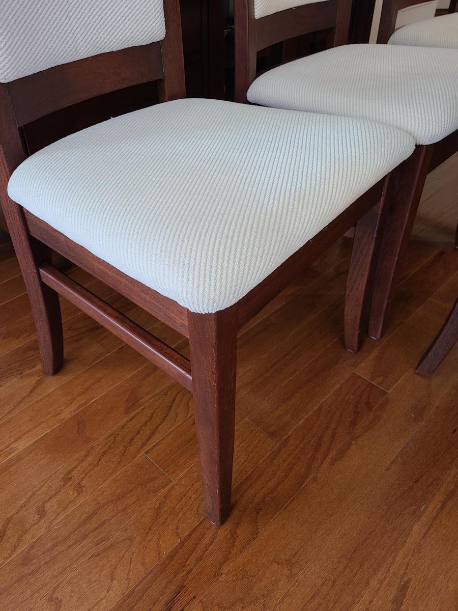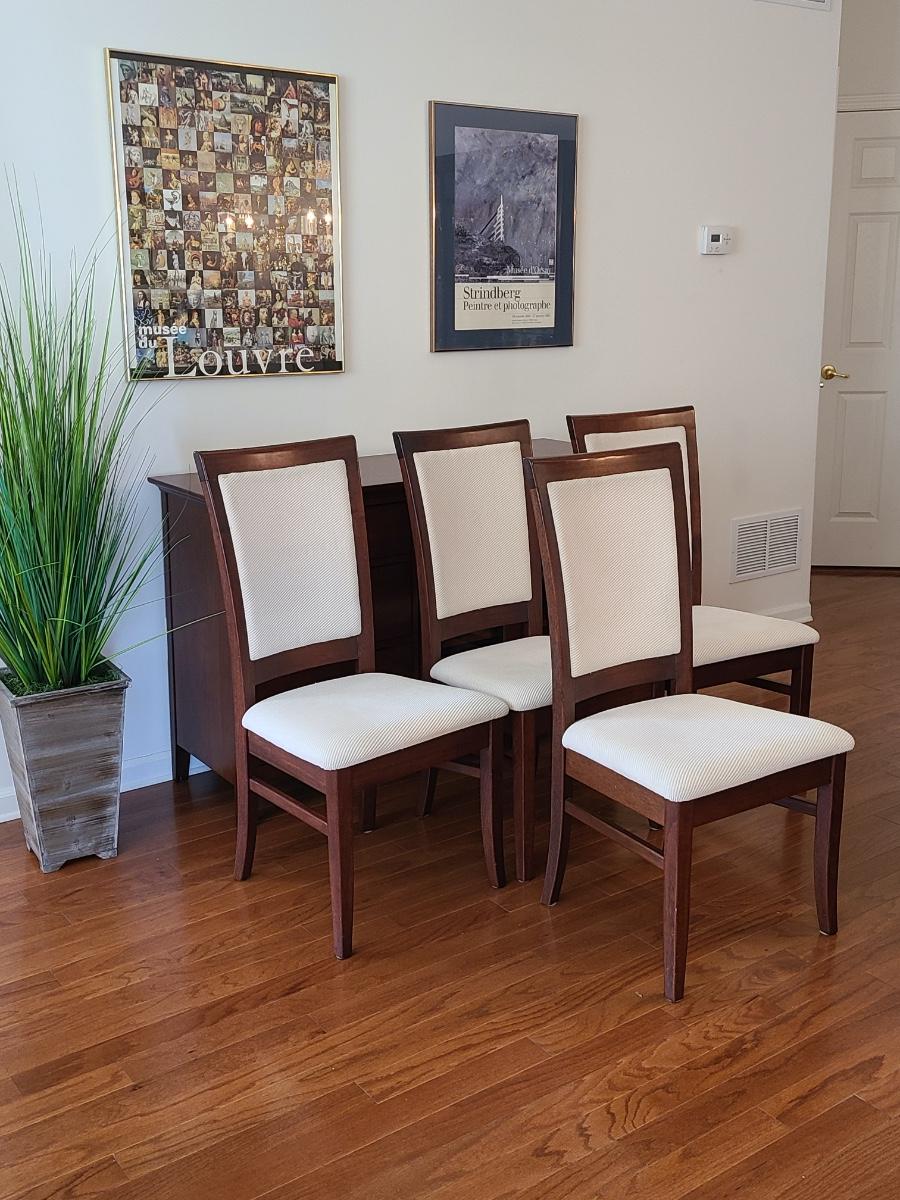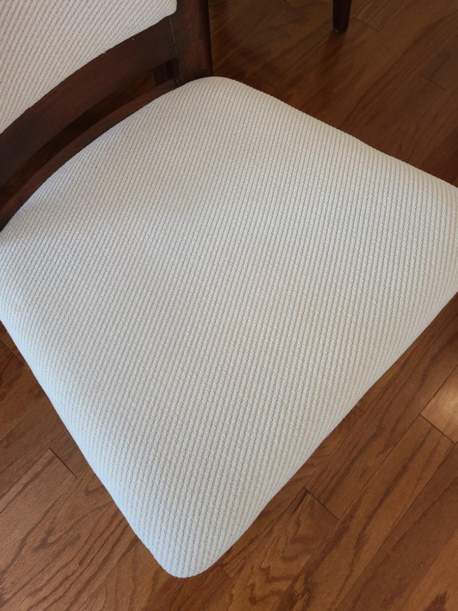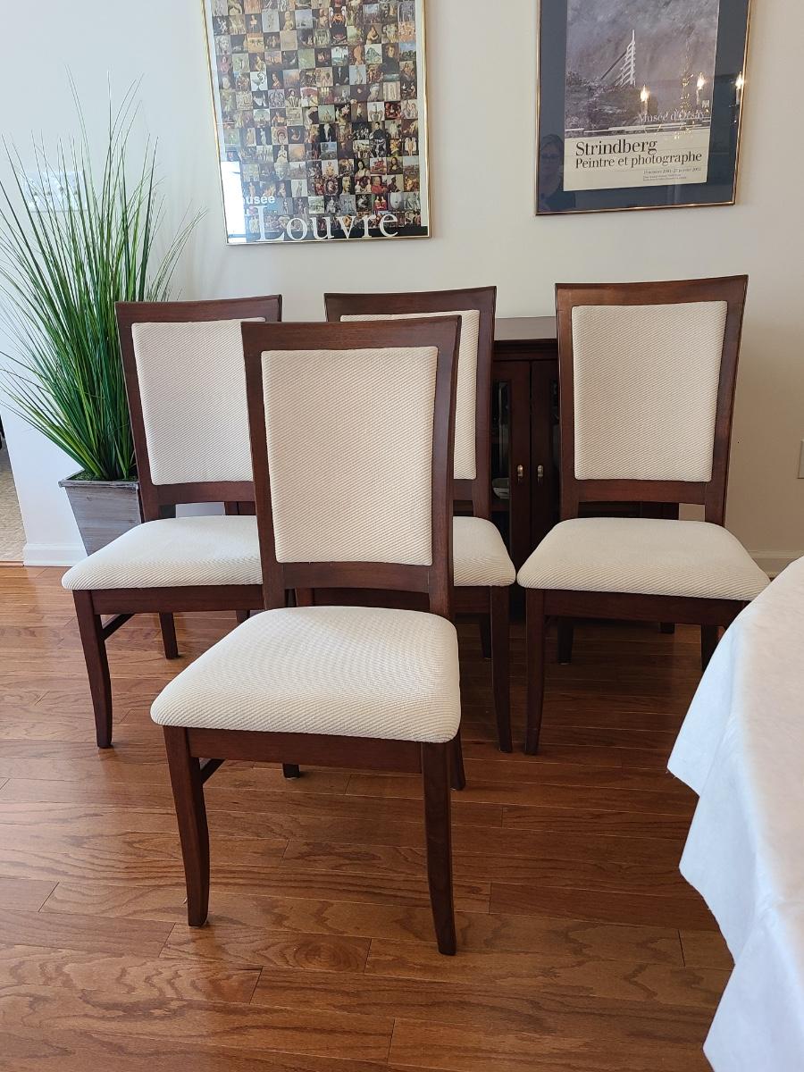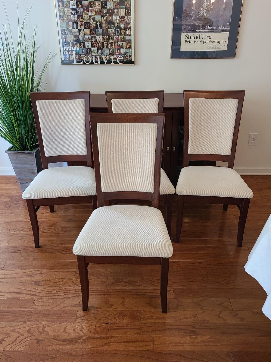 Vintage set of Benny Linden Design chairs made in Thailand. Benny Linden is known for his MCM dining sets and teak chairs. These are more of a cherry in color, and have a fabric seat on chair and back. Solid in form, and sleek design. The fabric shows minimal wear for their age! Lot is for four chairs only. Please see all pictures as they are the best representation of the items. The pictures show condition, measurements if taken, and what is included in the lot. Due to the large amount that we photograph and the time frame, we are not always able to take measurements. All items unless noted, are pre-owned and have been used. If you purchased furniture, you must bring help. We do not allow one person to carry large furniture out on their own. Bring help, tools and a truck for the safety of our client’s homes, and your personal safety. Any damages that result to the property including walls, and floors due to moving of the furniture will be charged to the buyer. Company policy. Thank you.