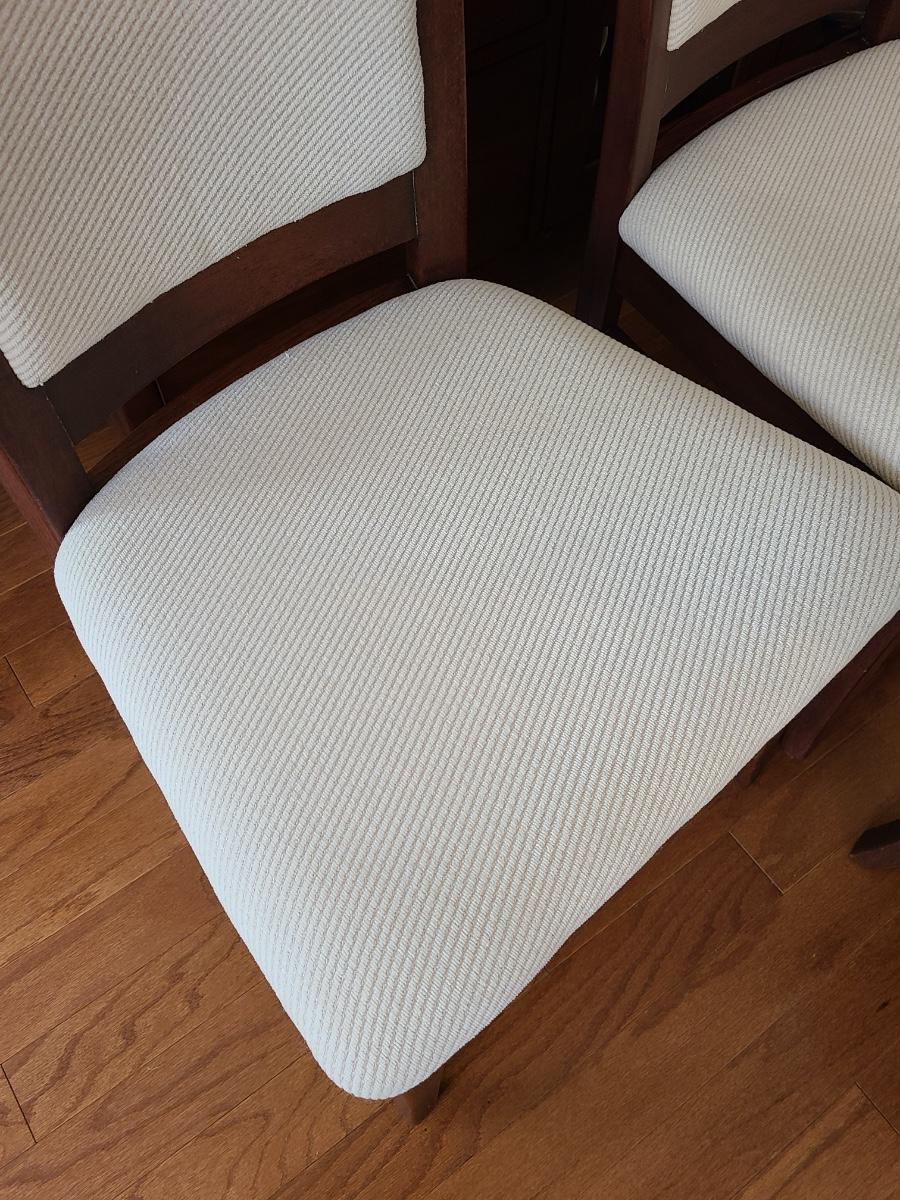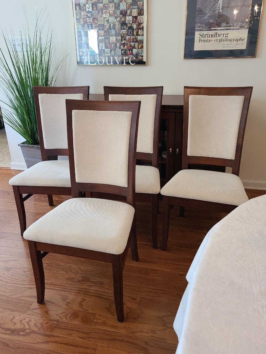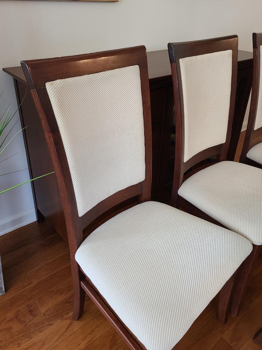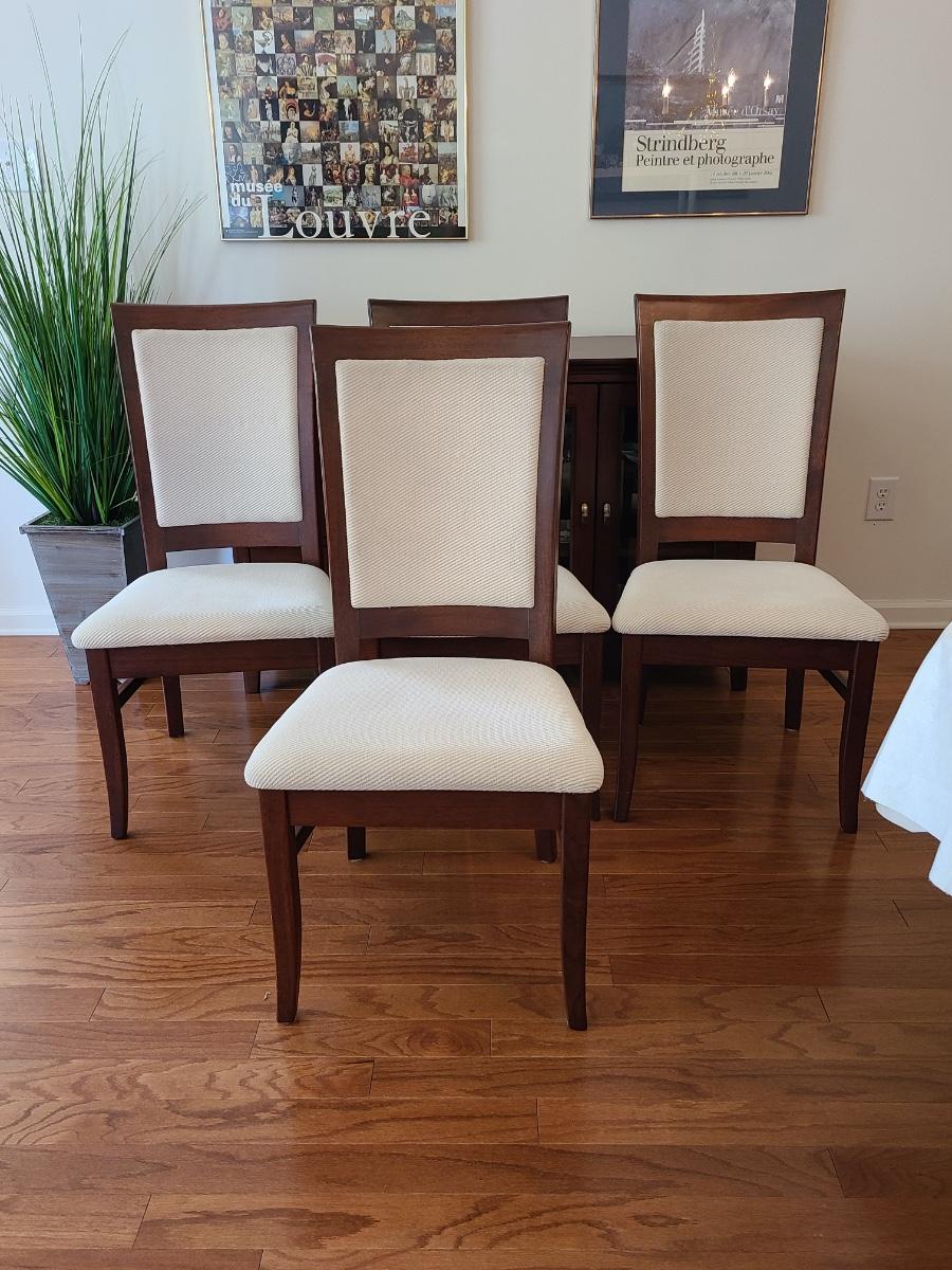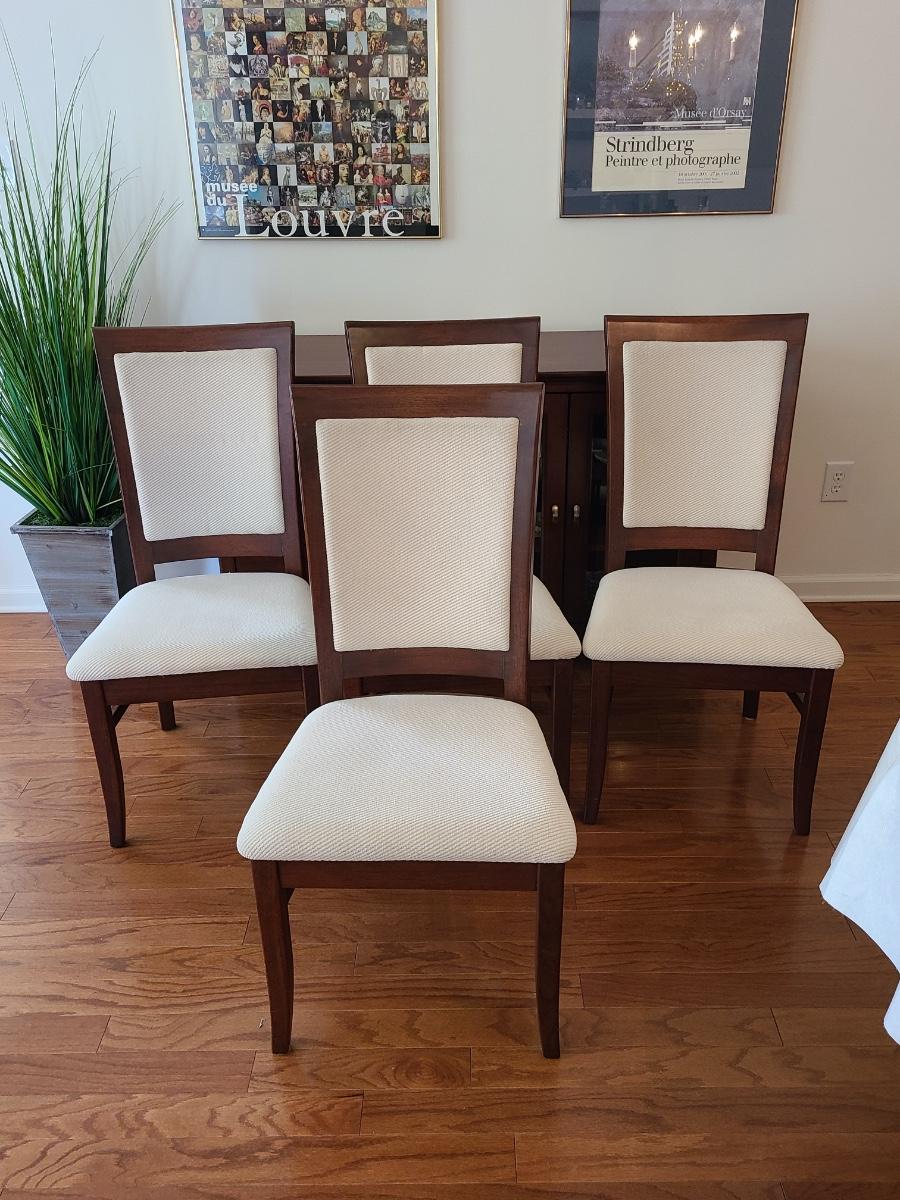 Vintage set of Benny Linden Design chairs made in Thailand. Benny Linden is known for his MCM dining sets and teak chairs. These are more of a cherry in color, and have a fabric seat on chair and back. Solid in form, and sleek design. The fabric shows minimal wear for their age! Lot is for four chairs only. Please see all pictures as they are the best representation of the items. The pictures show condition, measurements if taken, and what is included in the lot. Due to the large amount that we photograph and the time frame, we are not always able to take measurements. All items unless noted, are pre-owned and have been used. If you purchased furniture, you must bring help. We do not allow one person to carry large furniture out on their own. Bring help, tools and a truck for the safety of our client’s homes, and your personal safety. Any damages that result to the property including walls, and floors due to moving of the furniture will be charged to the buyer. Company policy. Thank you.