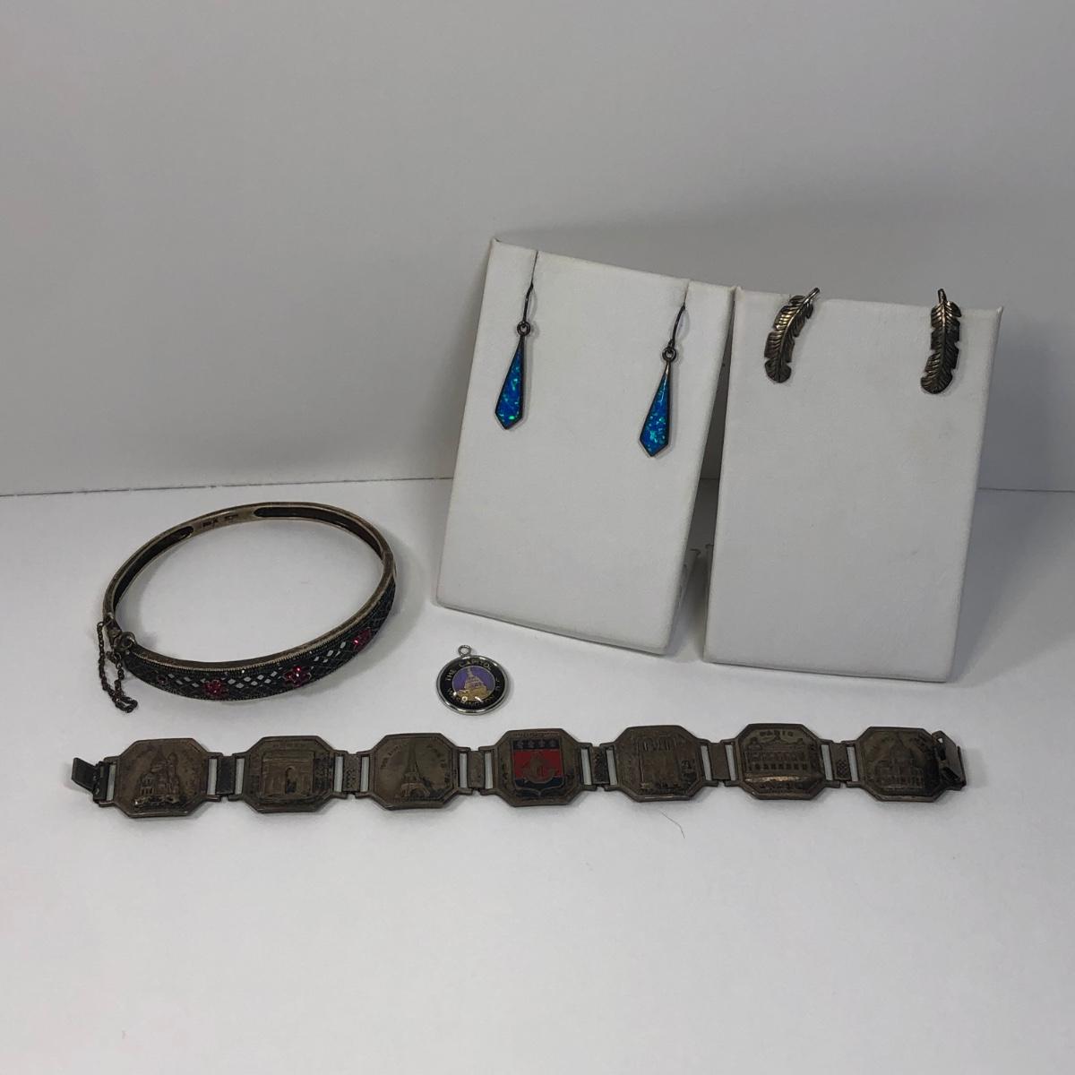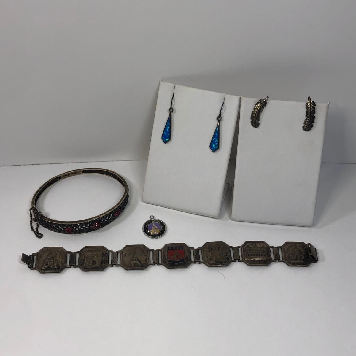 LOT 503M: 2 Pairs of Pierced Sterling Earrings, France Souvenir Bracelet, Sterling Washington DC Pendant/Charm & Sterling Cuff Bracelet