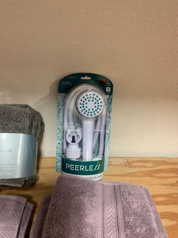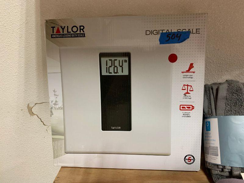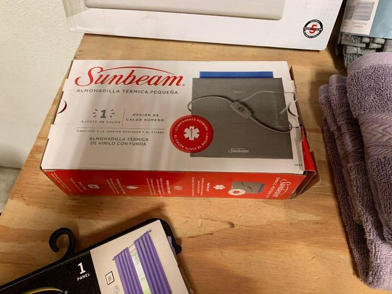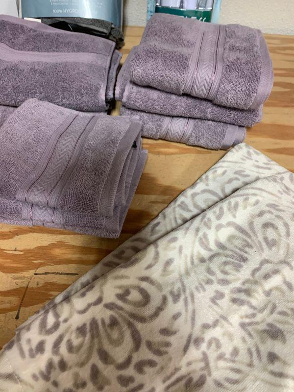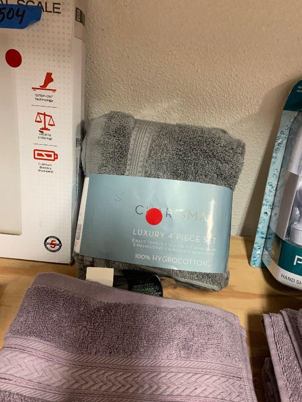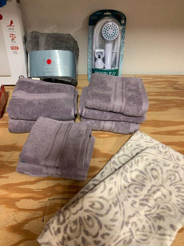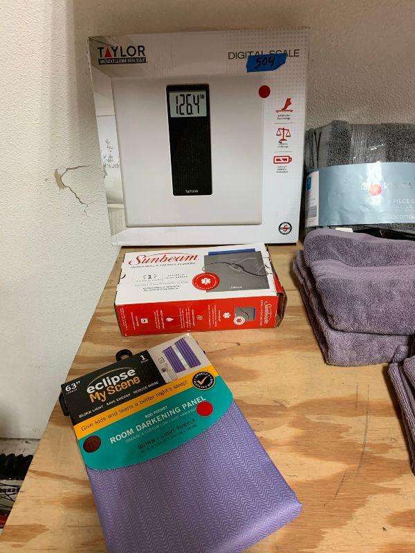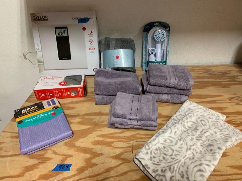 Towels and scale: 9 hand towels, 6 wash clothes, new shower head, shower curtain, small heating pad