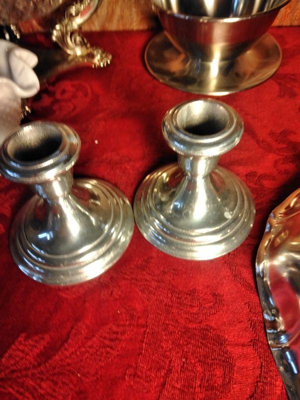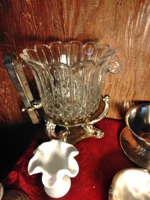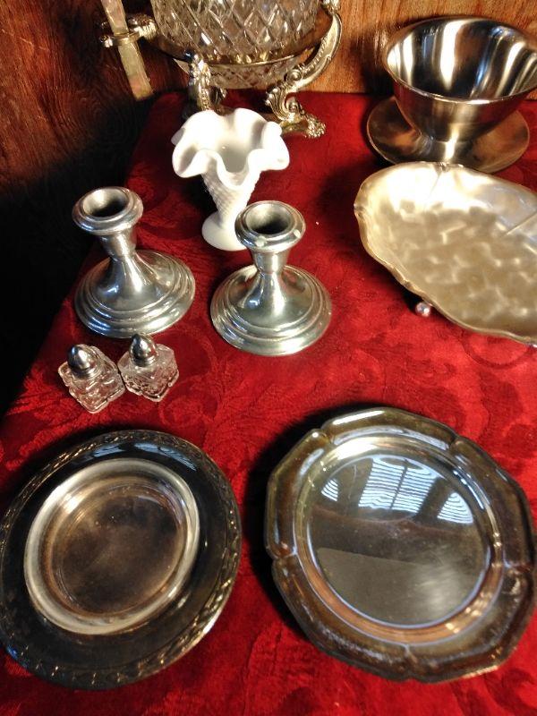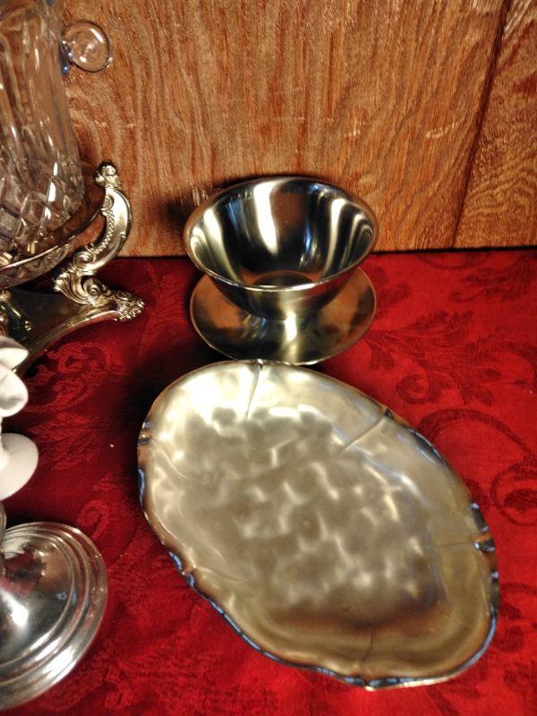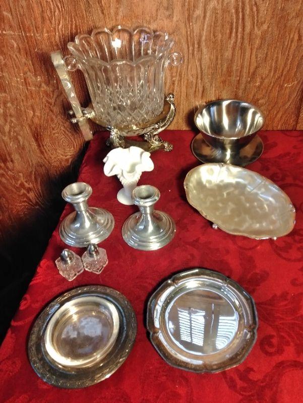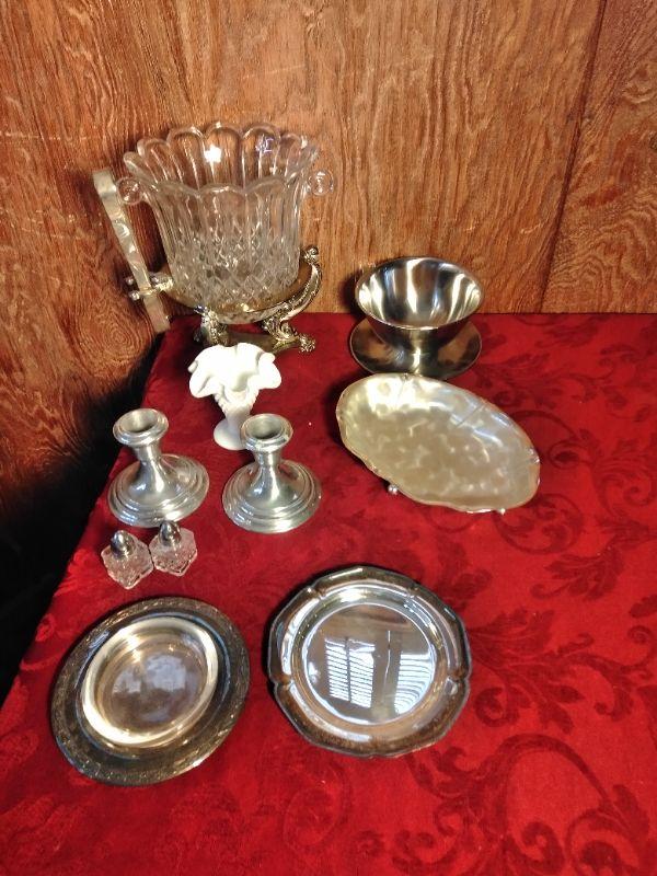 GODINGER ICE BUCKET WITH TONGS AND REMOVABLE GLASS BUCKET, ONEIDA BOWL WITH ATTACHED SAUCER, WMF- KORA MARKED OVAL TRAY, SMALL W.M. ROGERS MARKED DISH, TWO PEWTER CANDLE STICK HOLDERS, GLASS SALT AND PEPPER SHAKERS, AND MILK GLASS VASE.