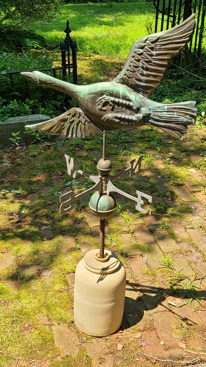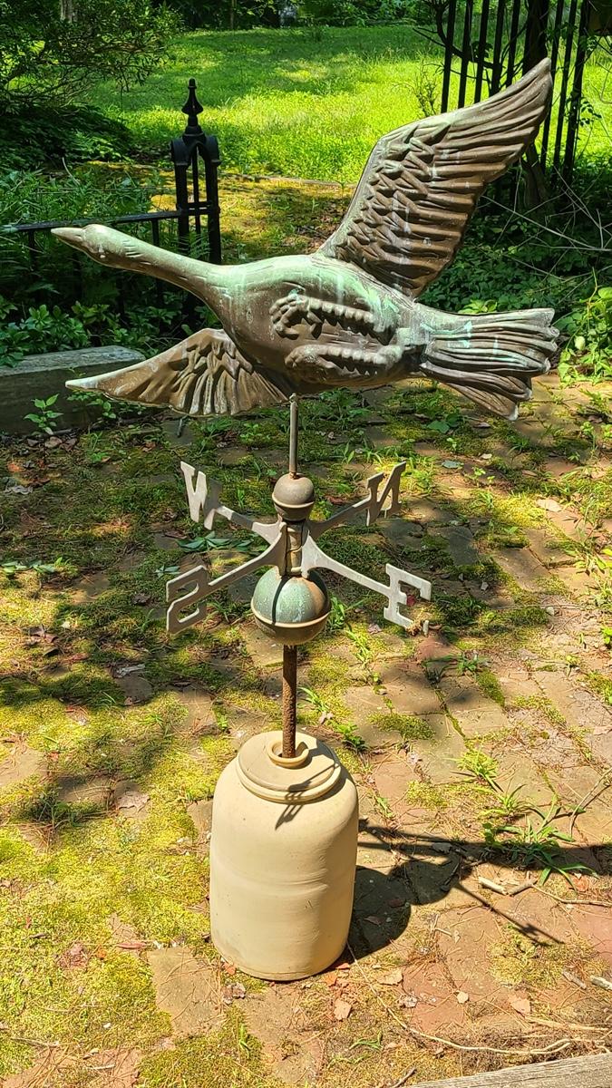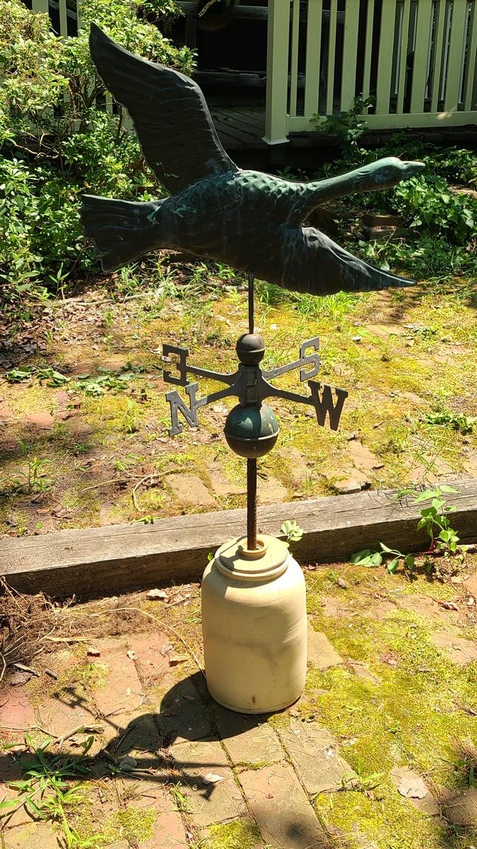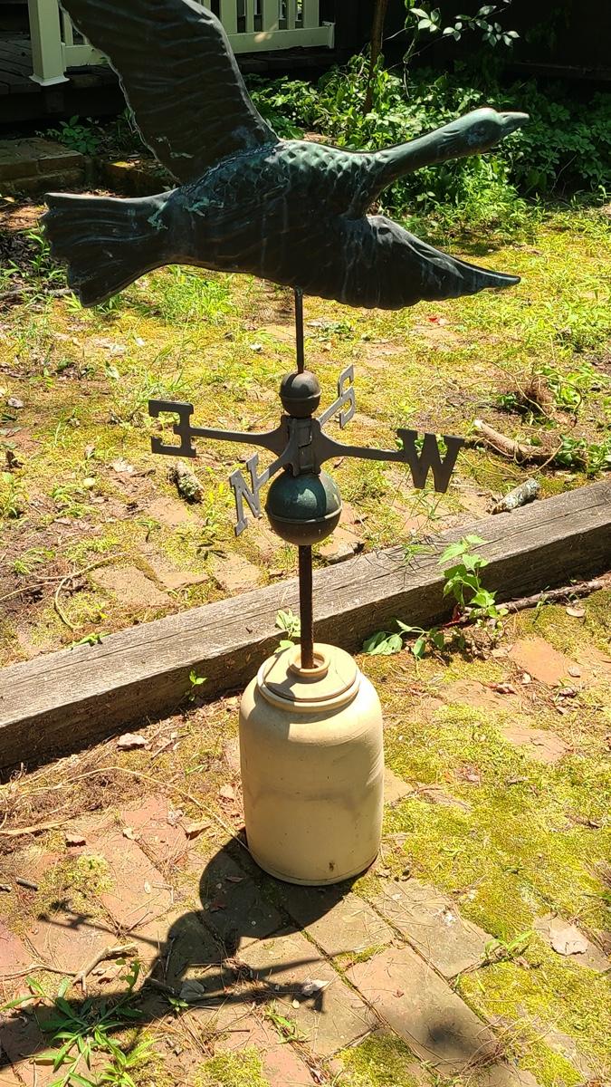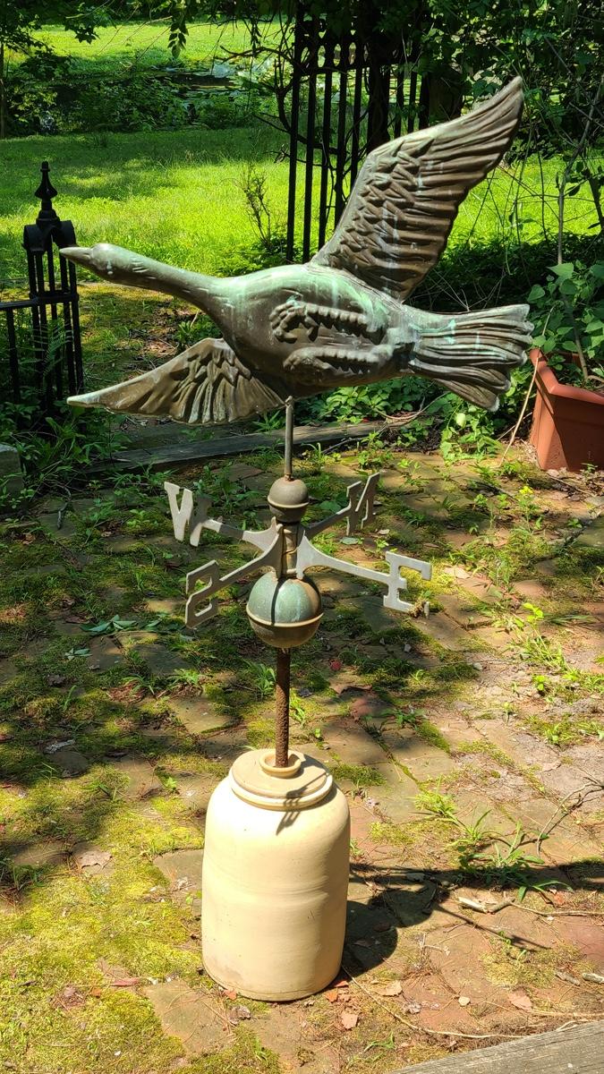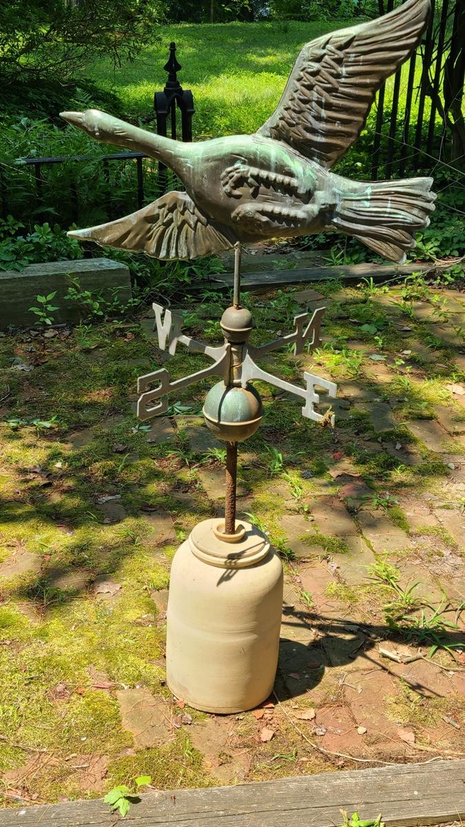 Vintage large goose weather ball on pole and crock. Incredible decor! The crock lid has a repaired break , and the crock would need sand or filler to hold the weather vane in place. The weather vane was kept on porch and has an amazing patina, and the crock was on outside porch and may need to be cleaned on the inside. This is as-is seen and may show wear from age and use. Please see pictures as they are the best representation of the item, the condition of the item, and the size of the item.