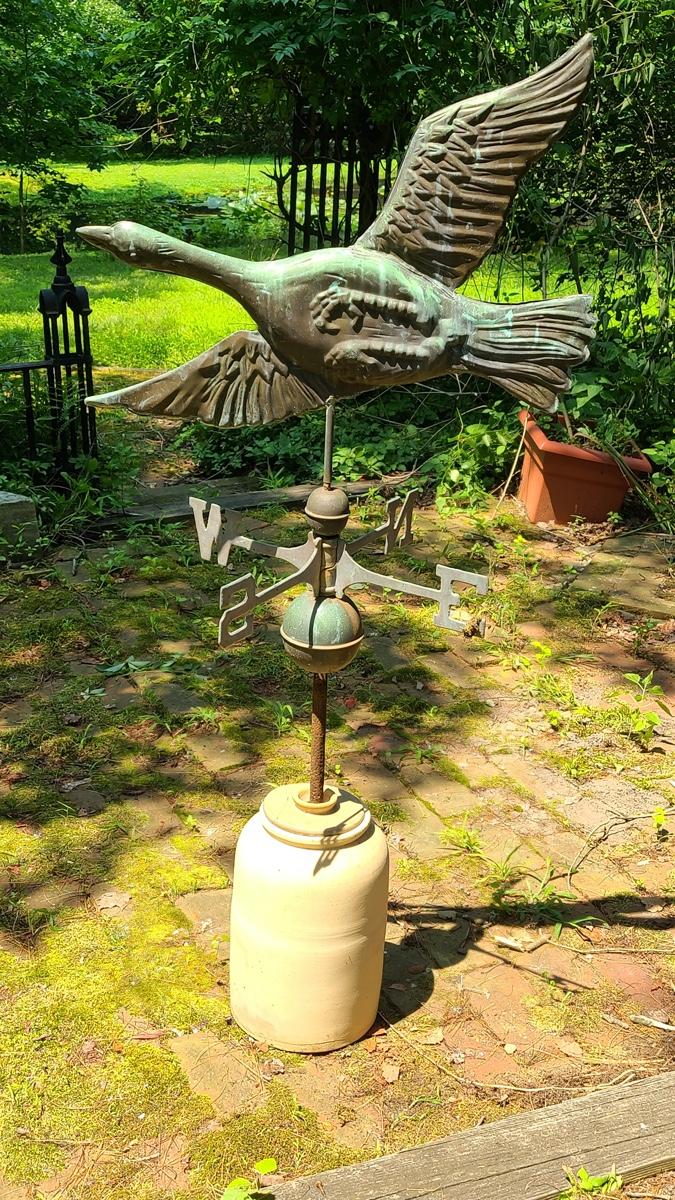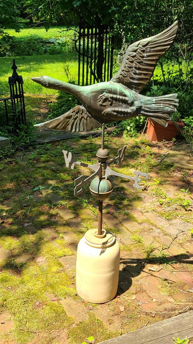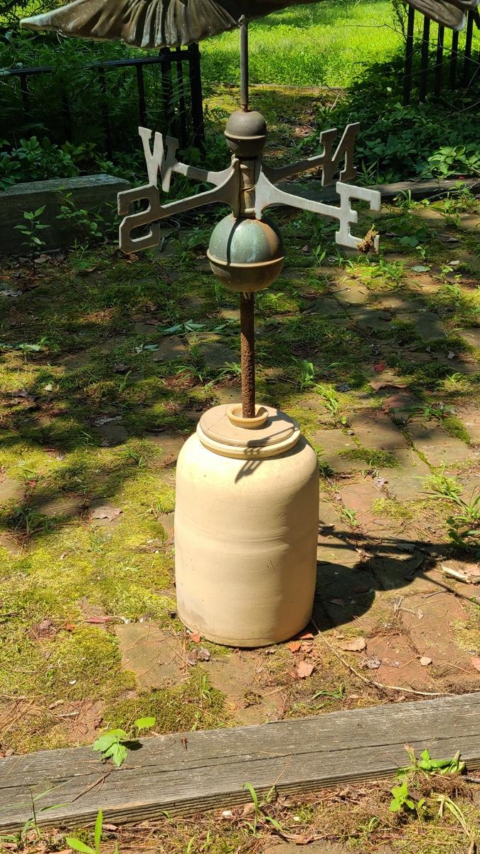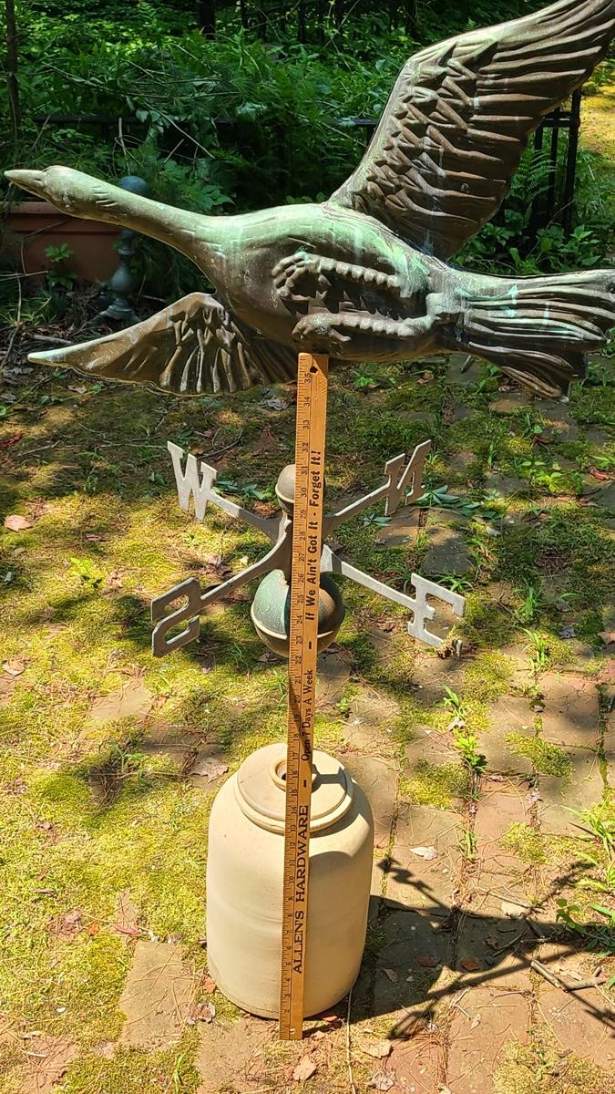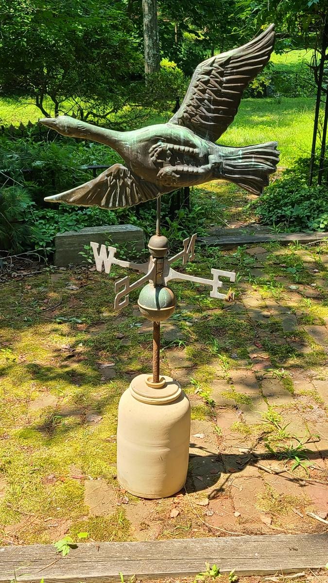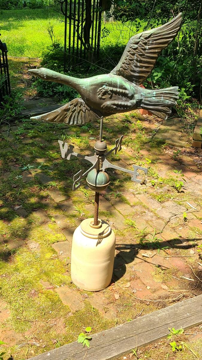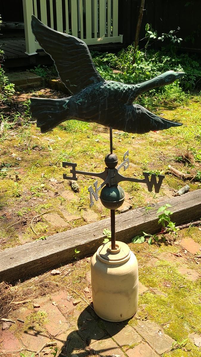 Vintage large goose weather ball on pole and crock. Incredible decor! The crock lid has a repaired break , and the crock would need sand or filler to hold the weather vane in place. The weather vane was kept on porch and has an amazing patina, and the crock was on outside porch and may need to be cleaned on the inside. This is as-is seen and may show wear from age and use. Please see pictures as they are the best representation of the item, the condition of the item, and the size of the item.
