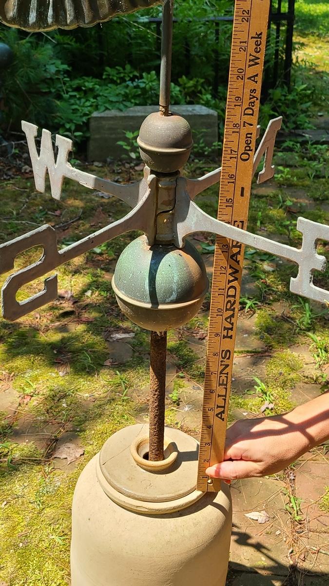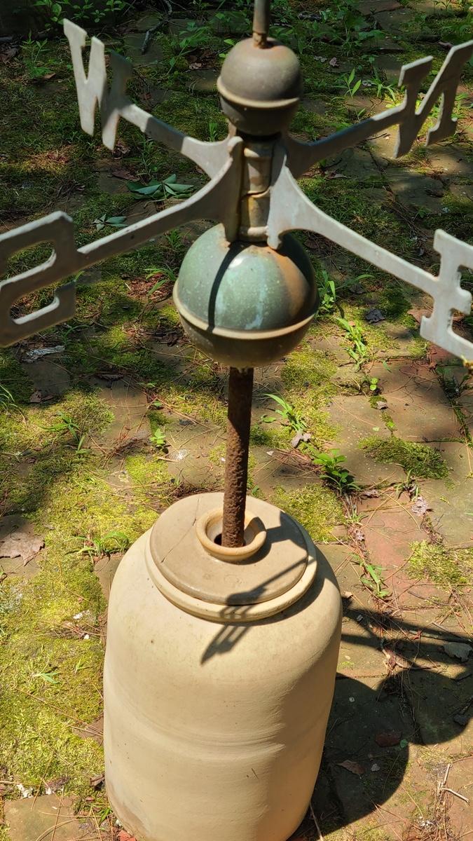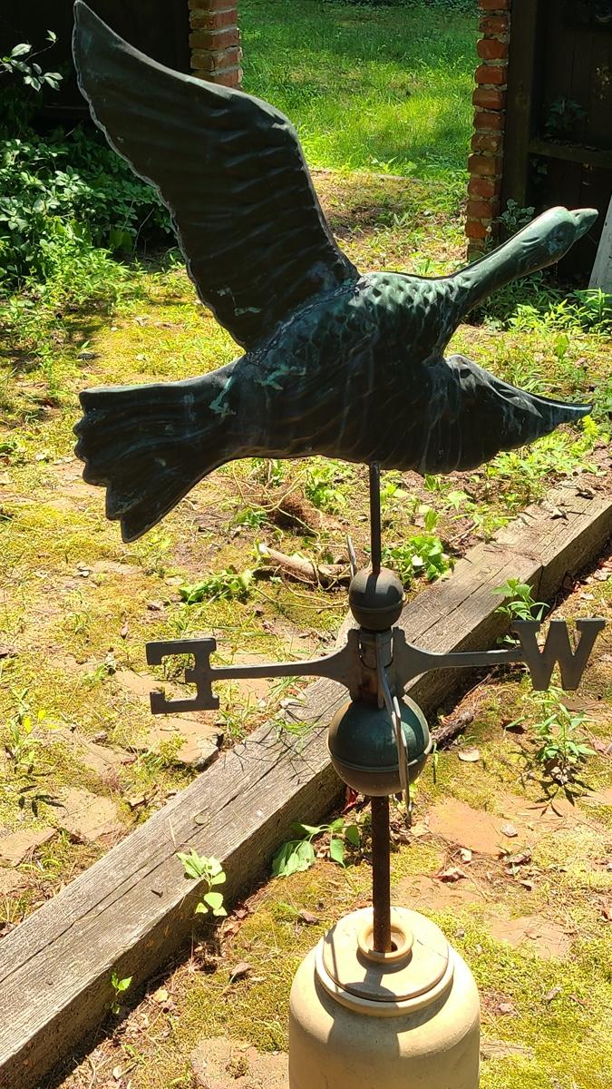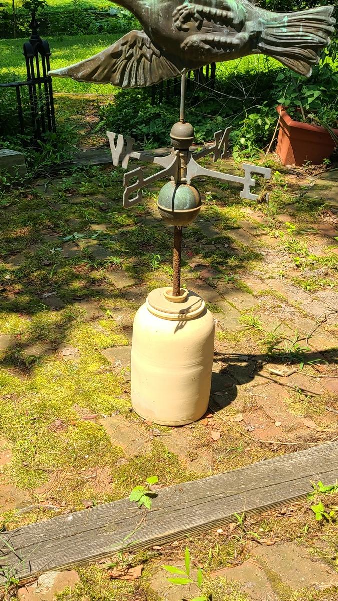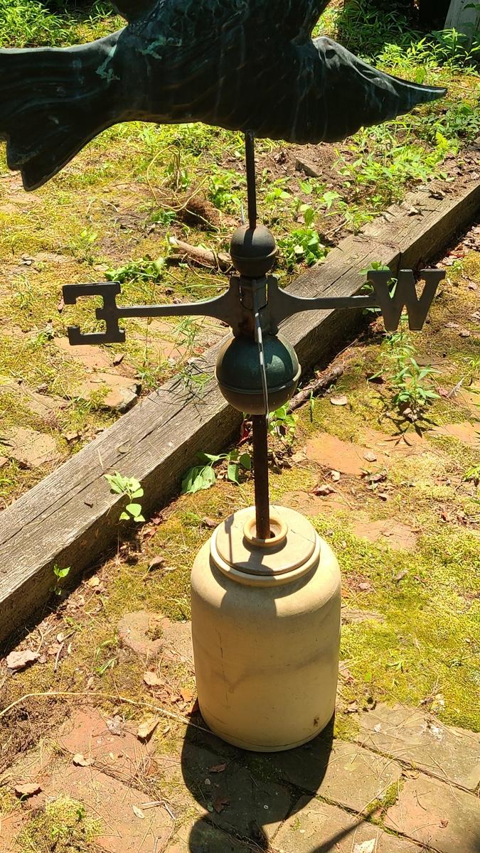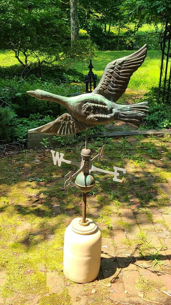 Vintage large goose weather ball on pole and crock. Incredible decor! The crock lid has a repaired break , and the crock would need sand or filler to hold the weather vane in place. The weather vane was kept on porch and has an amazing patina, and the crock was on outside porch and may need to be cleaned on the inside. This is as-is seen and may show wear from age and use. Please see pictures as they are the best representation of the item, the condition of the item, and the size of the item.