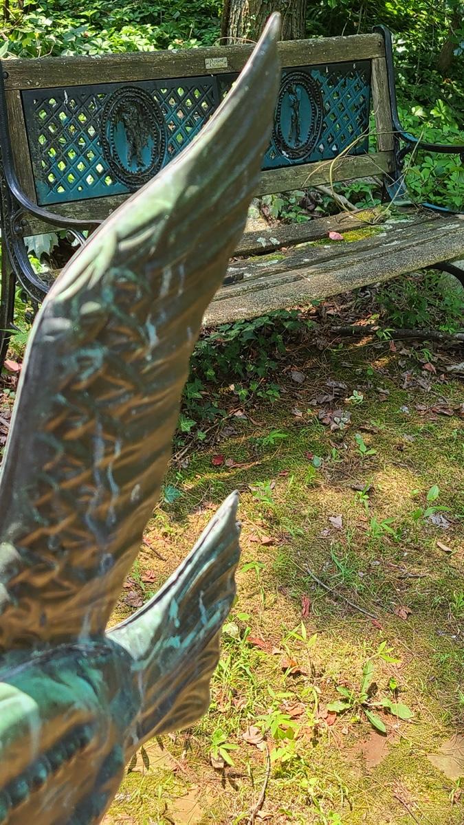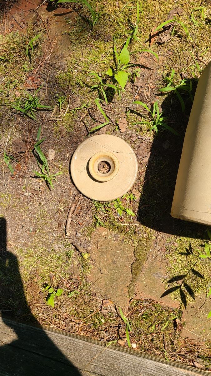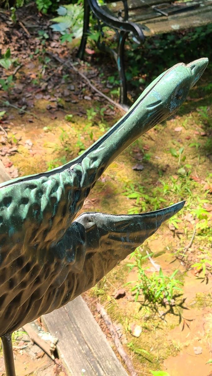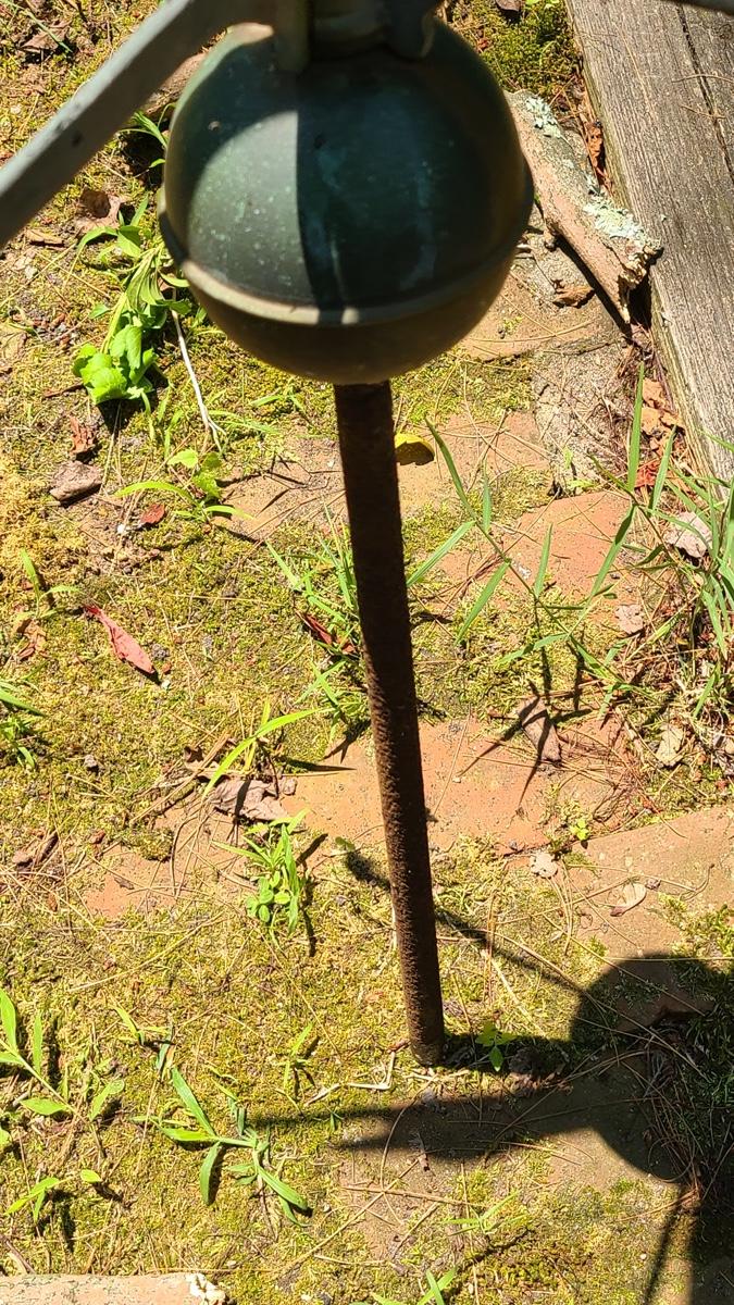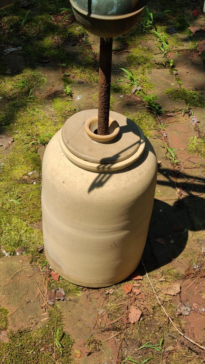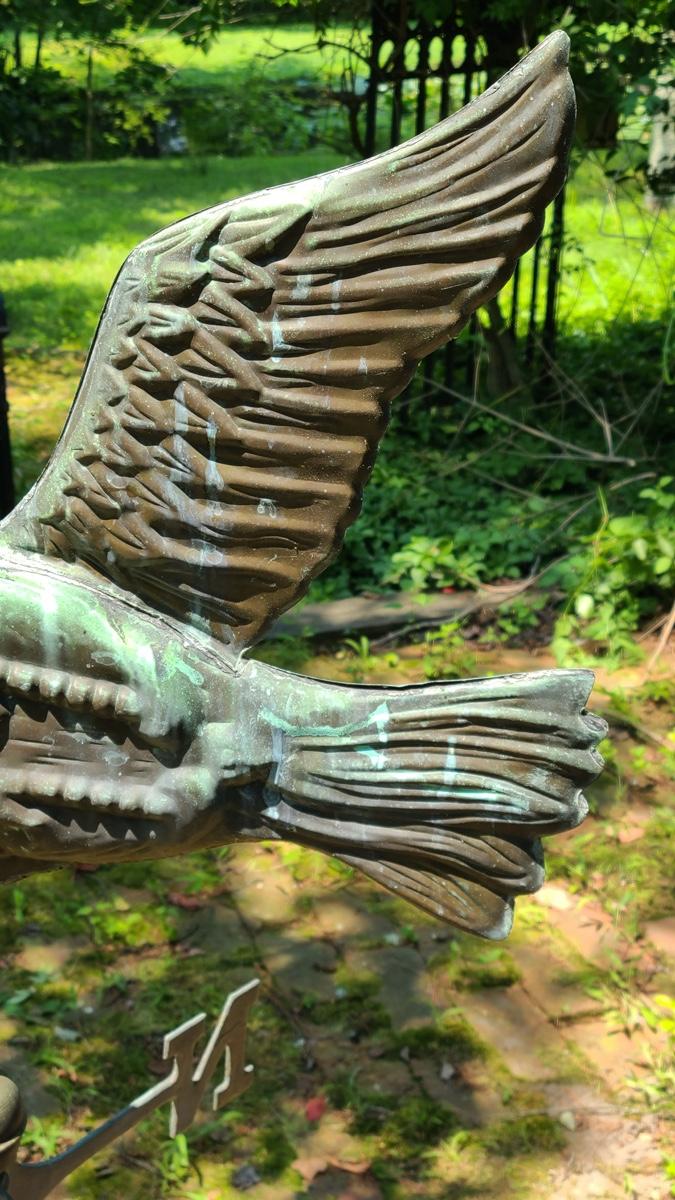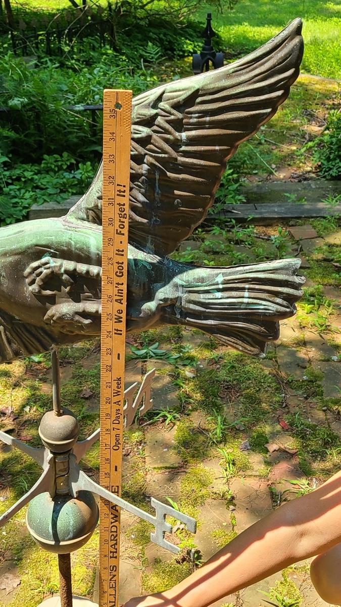 Vintage large goose weather ball on pole and crock. Incredible decor! The crock lid has a repaired break , and the crock would need sand or filler to hold the weather vane in place. The weather vane was kept on porch and has an amazing patina, and the crock was on outside porch and may need to be cleaned on the inside. This is as-is seen and may show wear from age and use. Please see pictures as they are the best representation of the item, the condition of the item, and the size of the item.