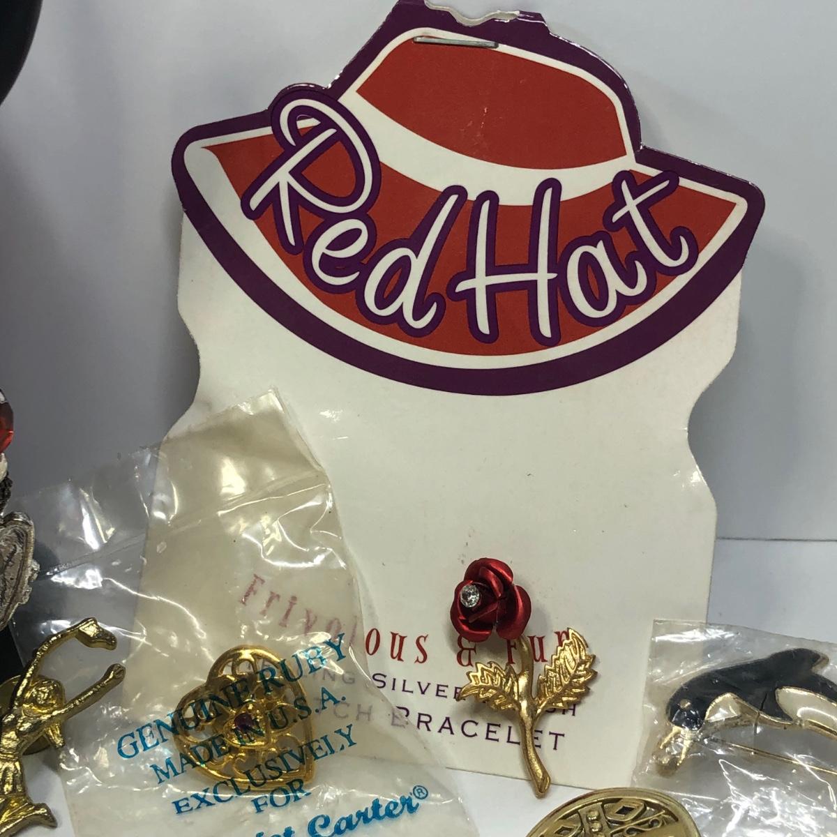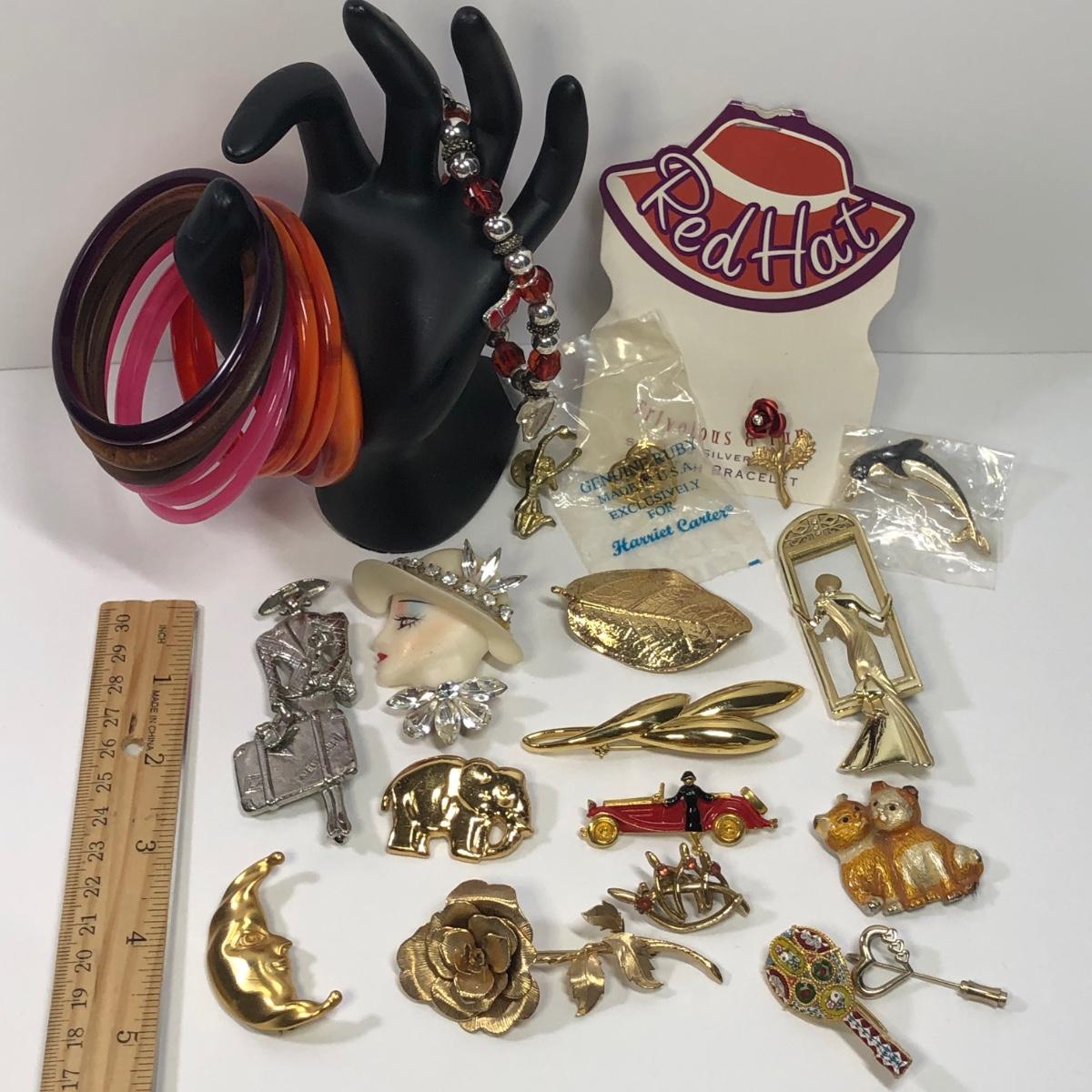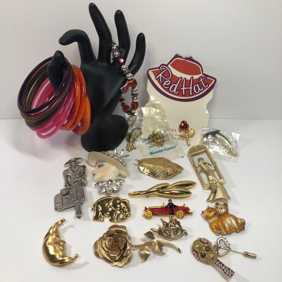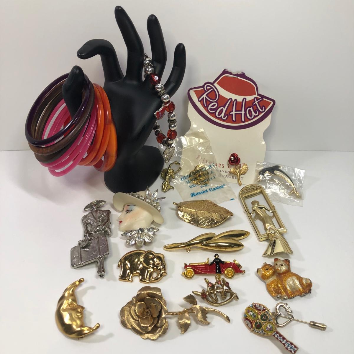 LOT 504M: Red Hat Club Bracelet & Pin, Trifari Brooch, Napier Elephant Pin, Bangle Bracelets & More