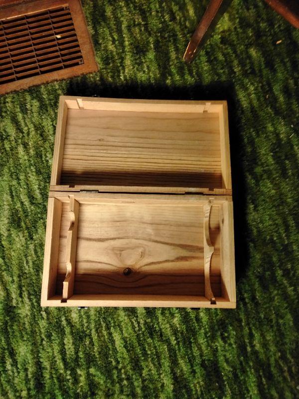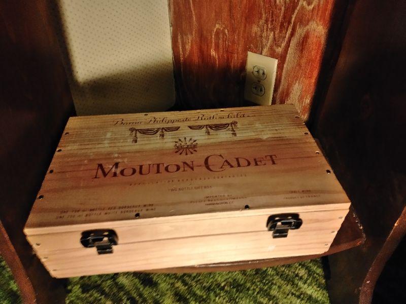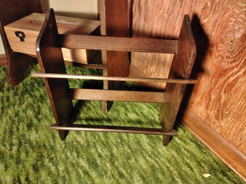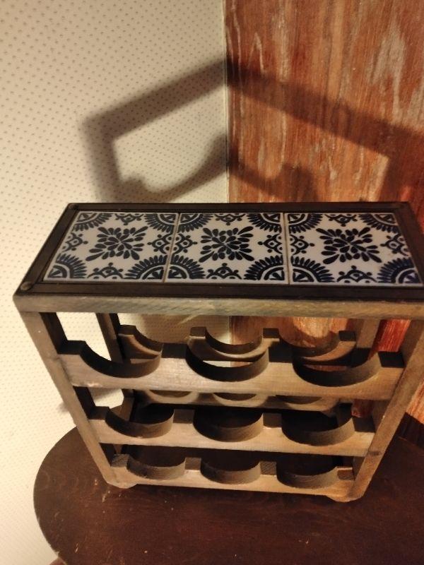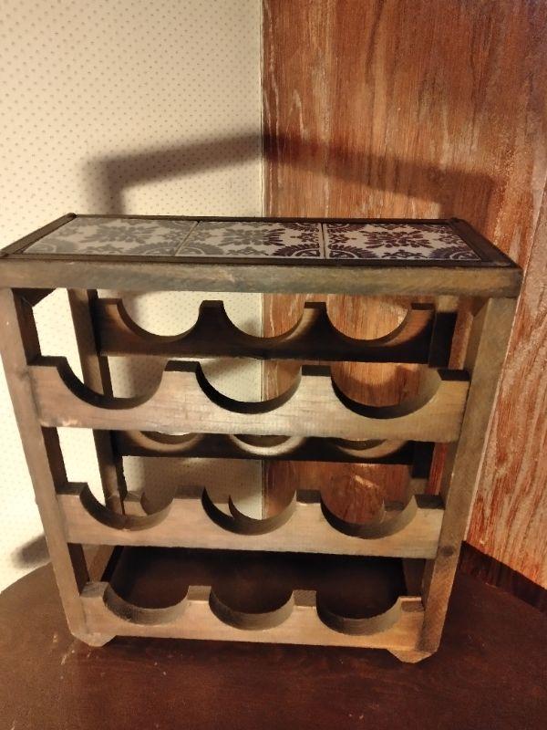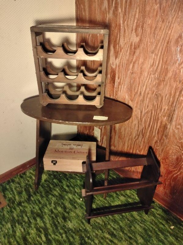 TILED TOPPED WOODEN FREE STANDING WINE RACK, SMALL TABLE 26" X 13.5" X 24", CD SHELF, AND WINE BOX.