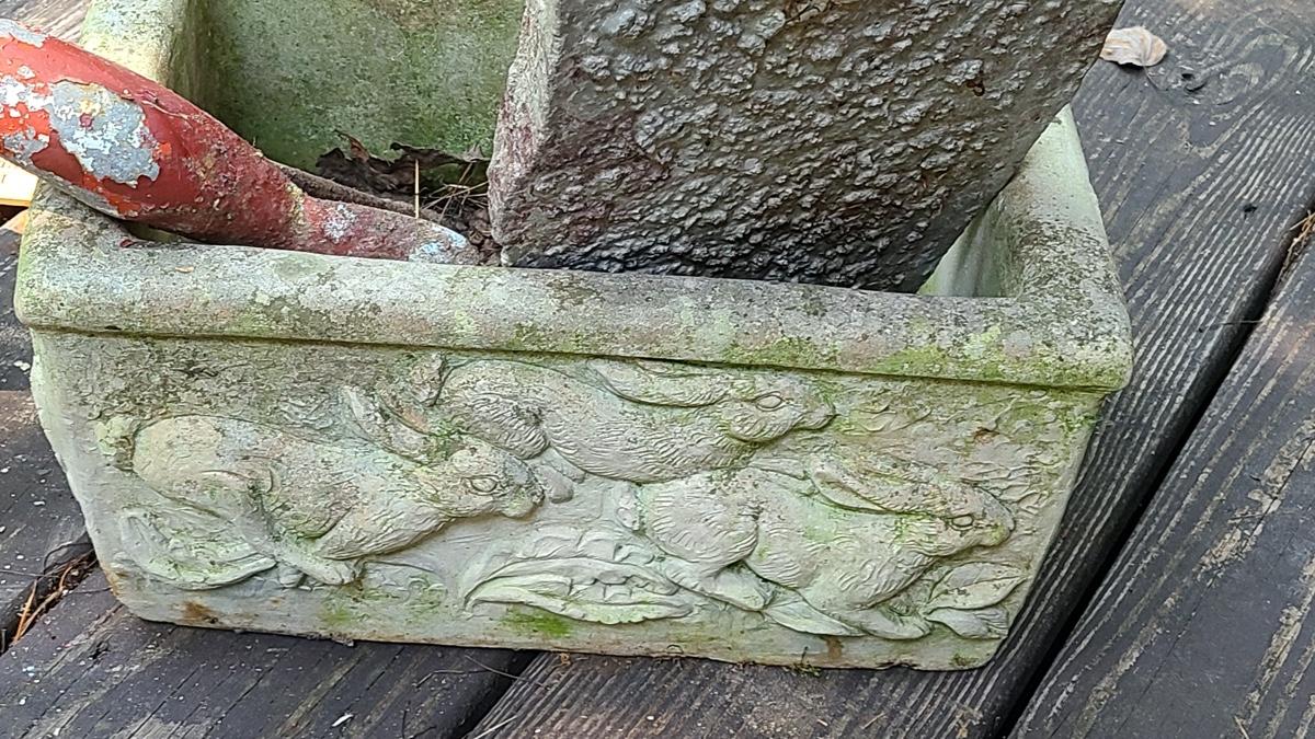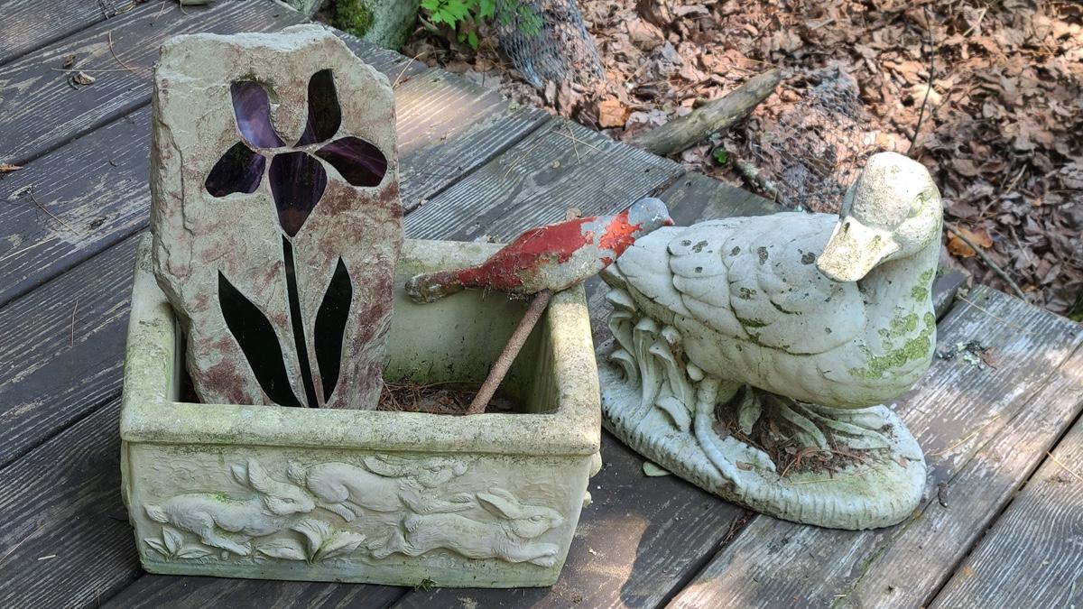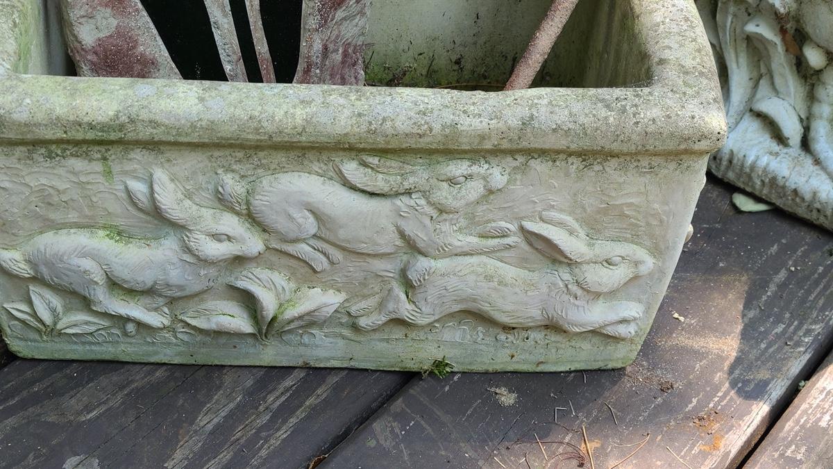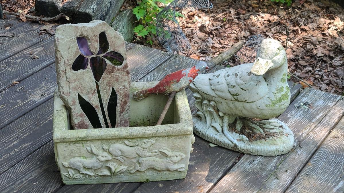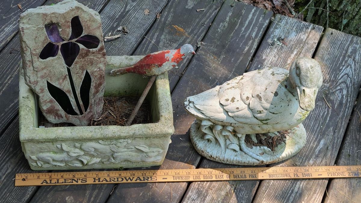 Nice lot of yard decor including concrete planter with running rabbits, a mosaic flower stepping stone (has hook to hang on wall), and ceramic duck as is. Yard art! Please see pictures as they are the best representation of the item, the condition of the item, and the size of the item.