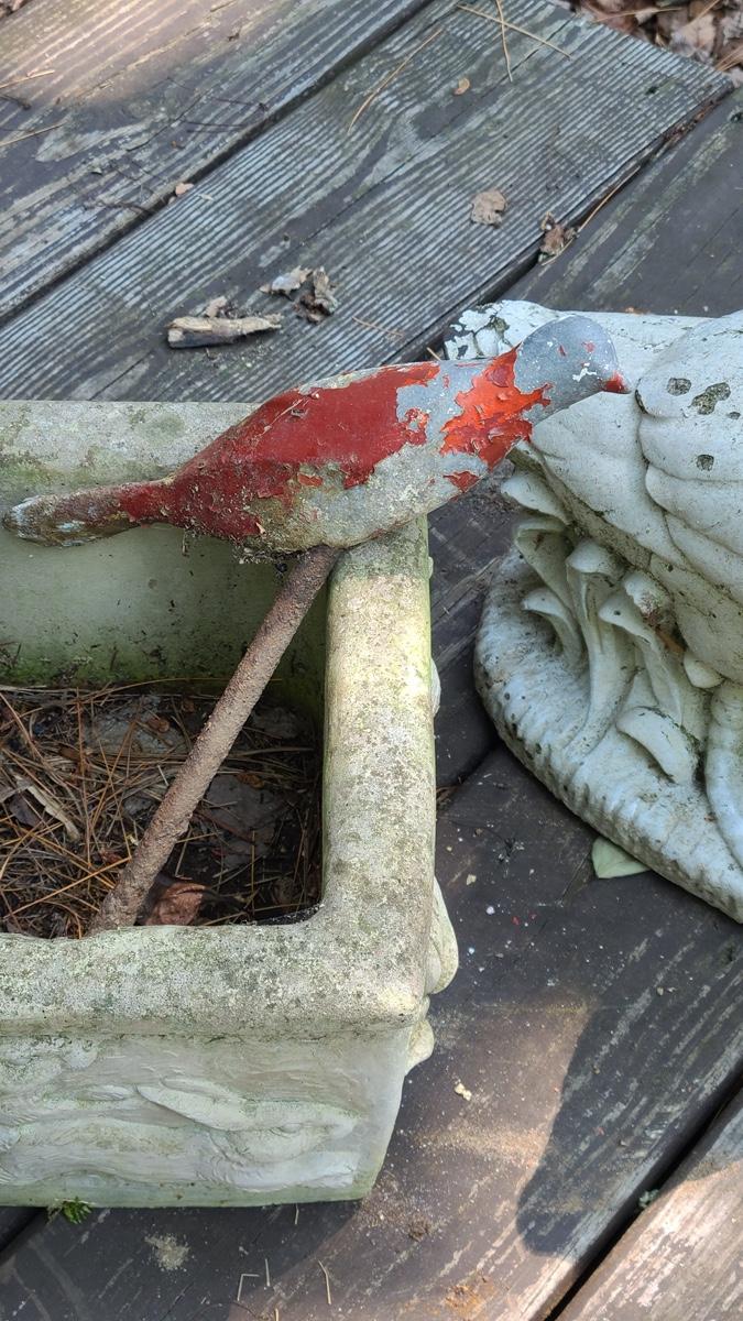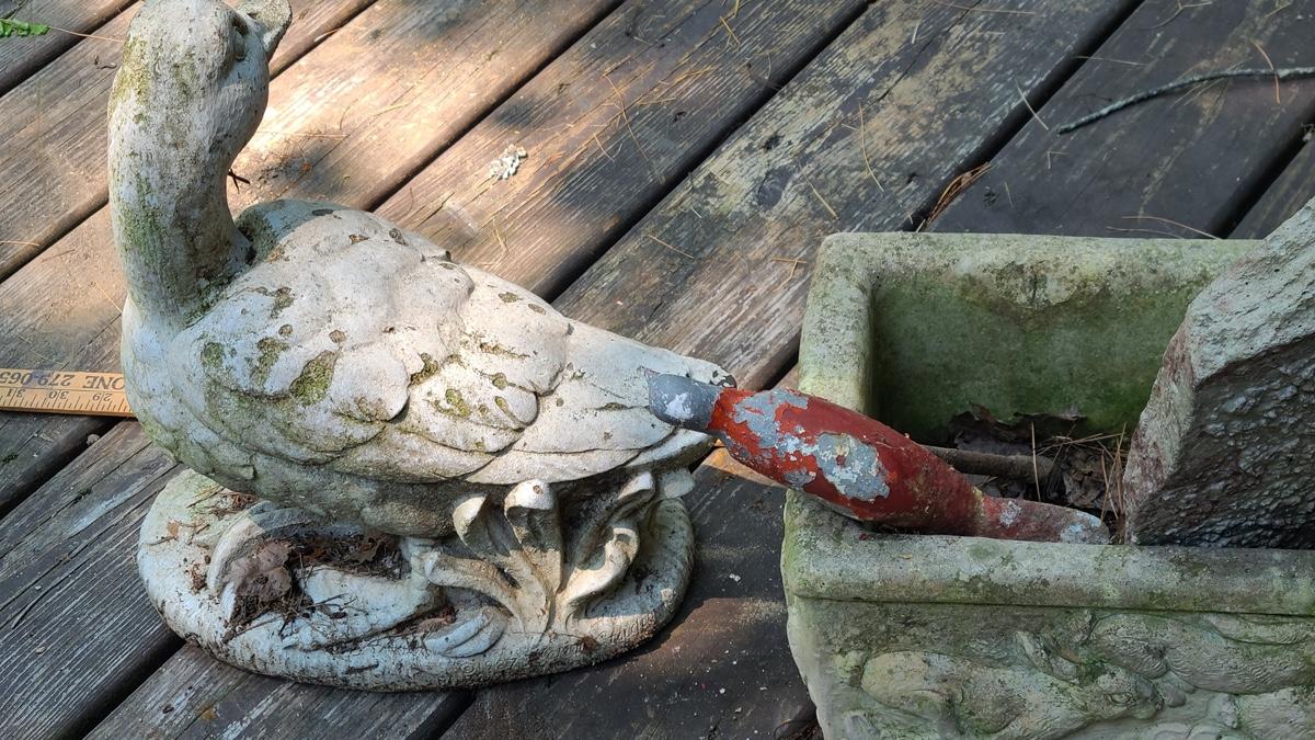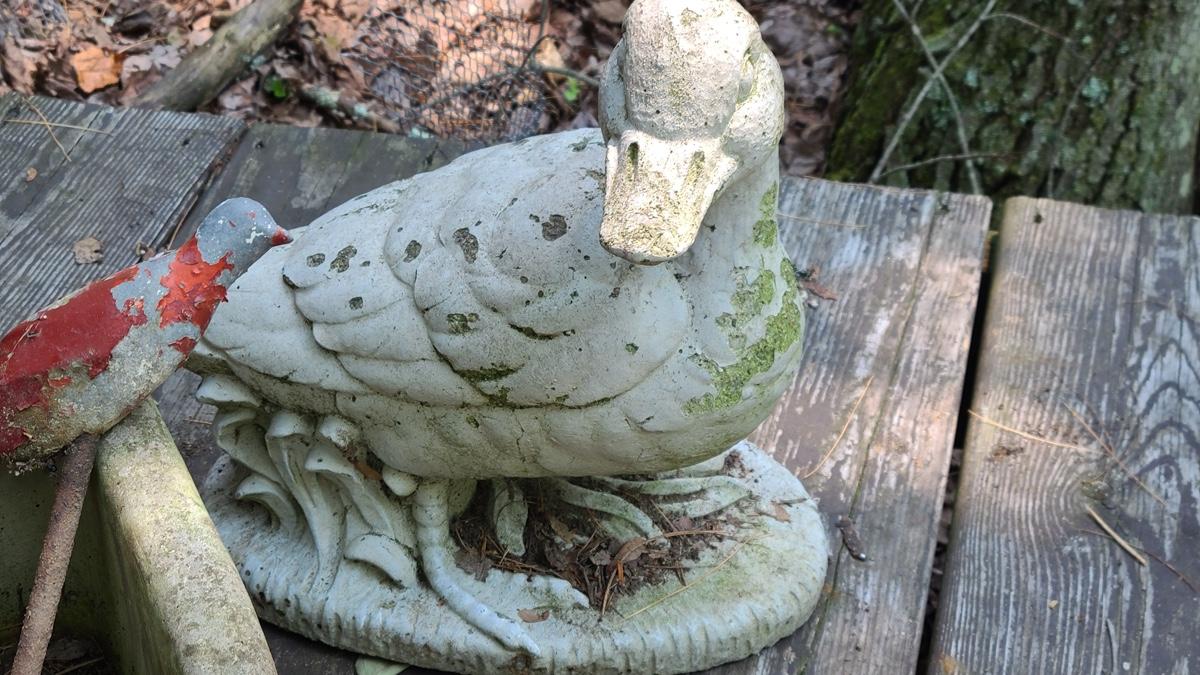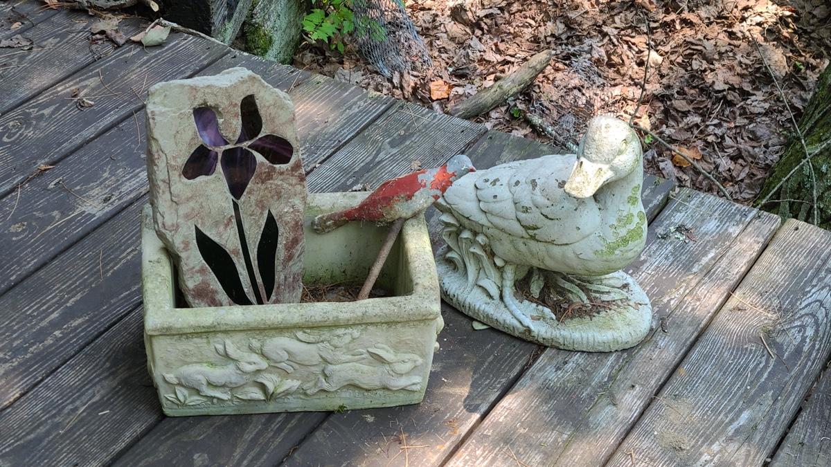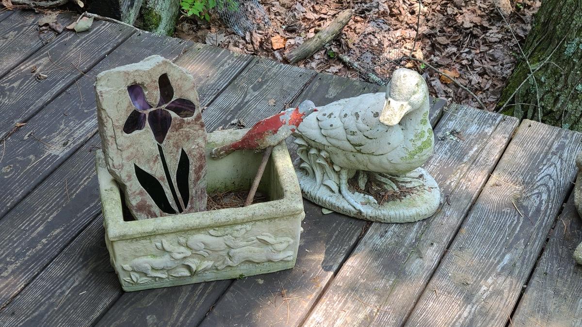 Nice lot of yard decor including concrete planter with running rabbits, a mosaic flower stepping stone (has hook to hang on wall), and ceramic duck as is. Yard art! Please see pictures as they are the best representation of the item, the condition of the item, and the size of the item.