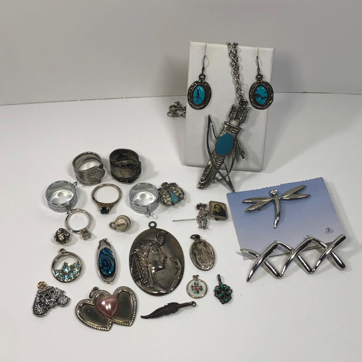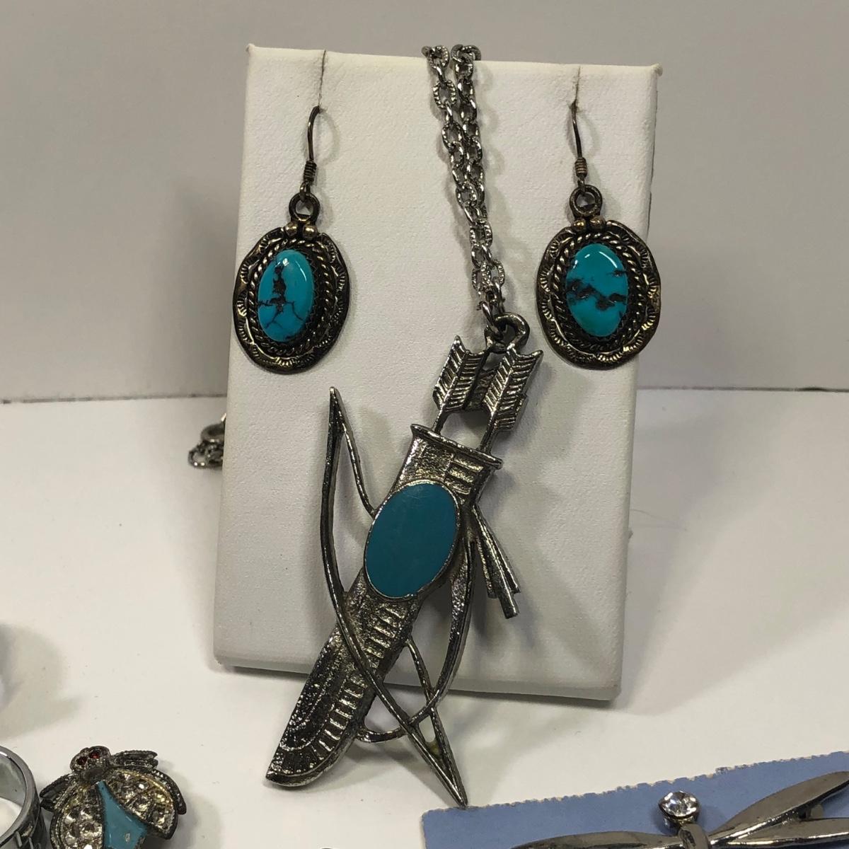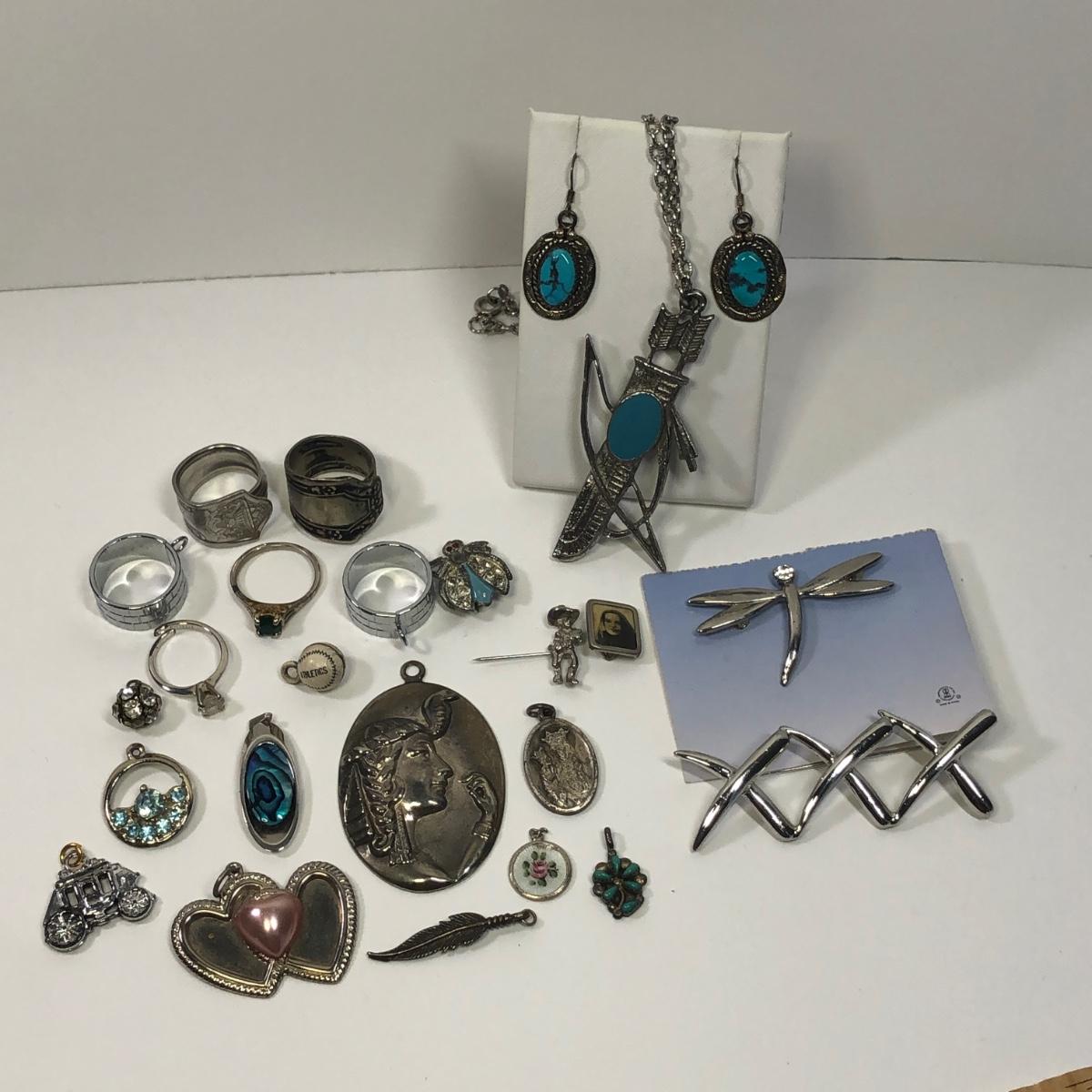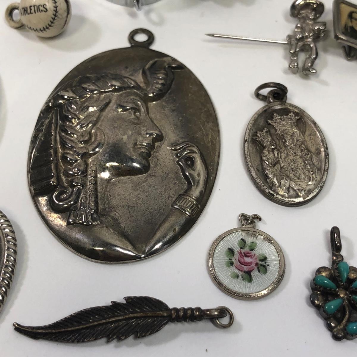 LOT 506M: 24” Bow & Arrow Necklace, Sterling Earrings, Pendants, Athletics Baseball Charm & More