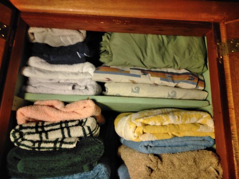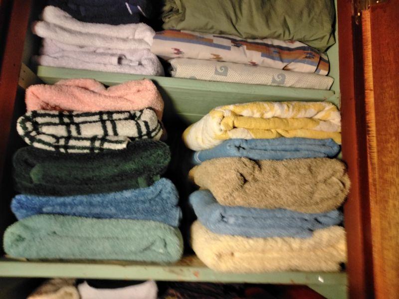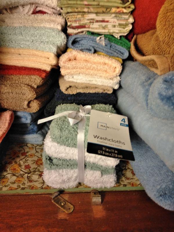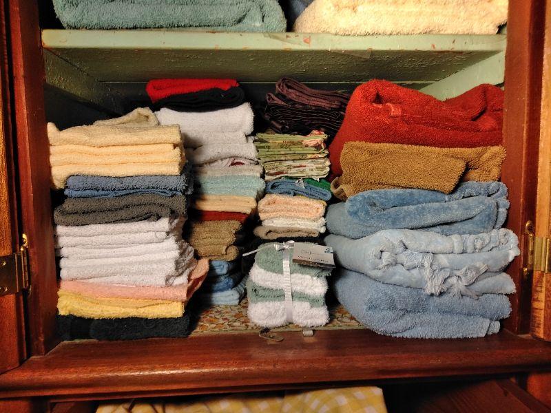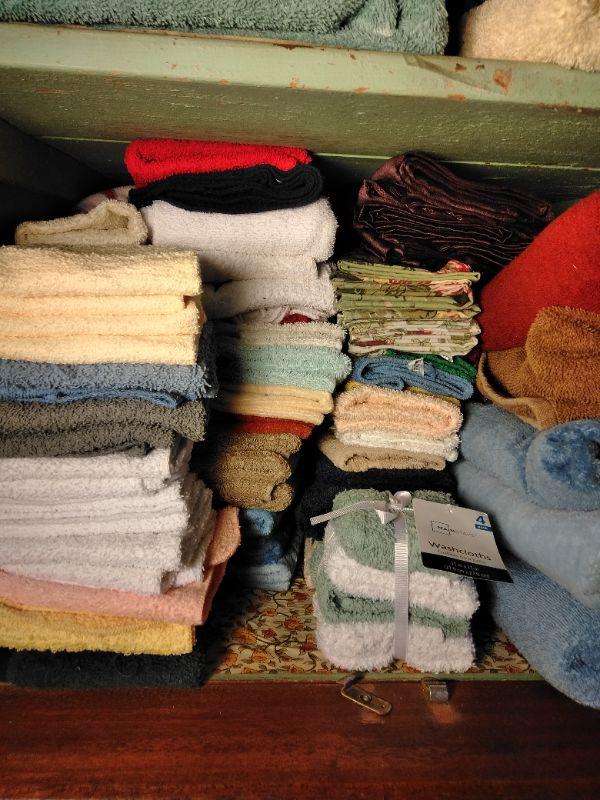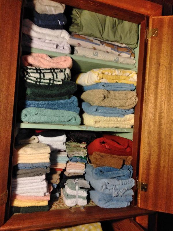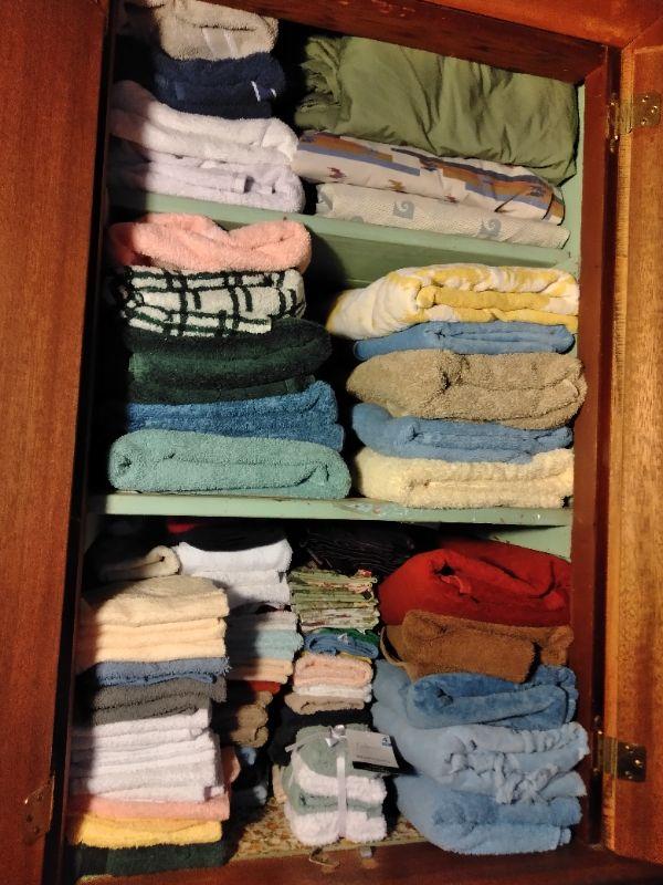 CLOSET FULL OF TOWELS, WASHCLOTHS, SHEETS AND A FEW LINENS. SOME ARE NEW!