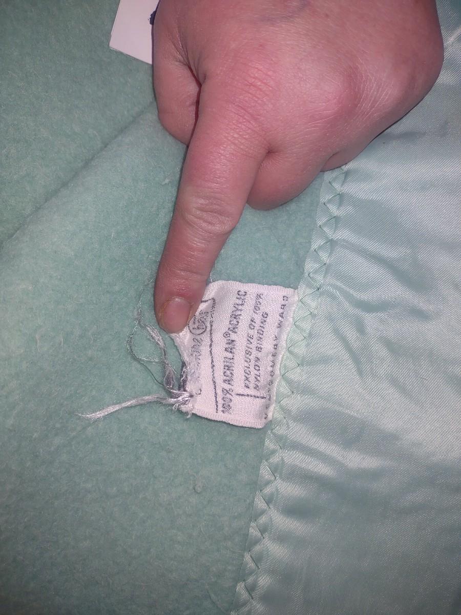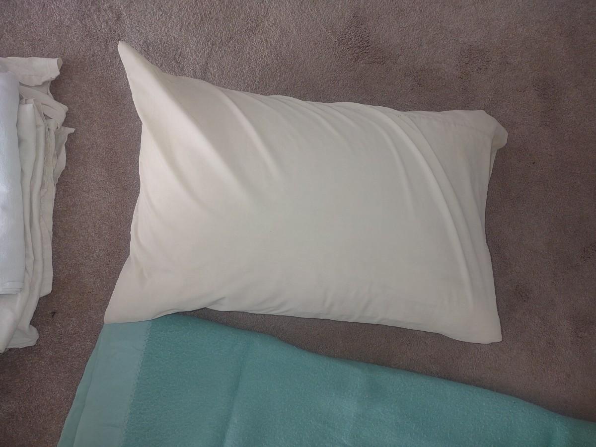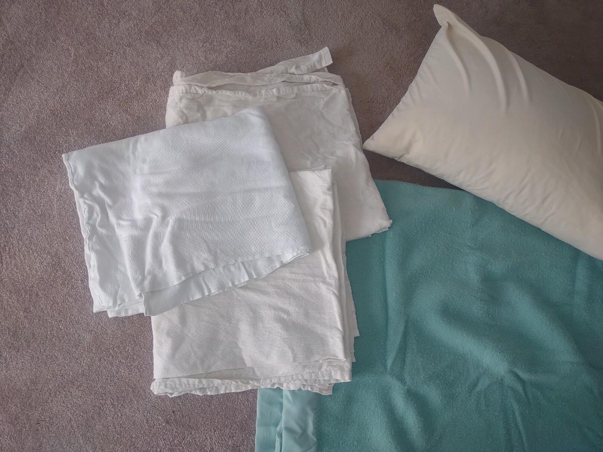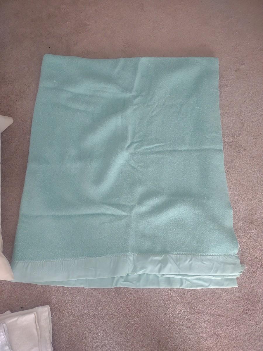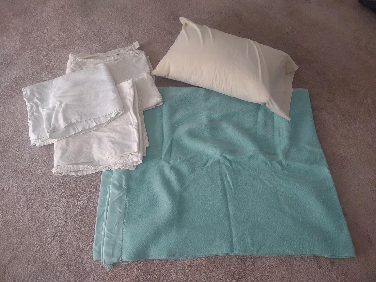 GREEN WOOL BLANKET, 3 HOSPITAL TYPE BLANKETS AND A FEATHER PILLOW