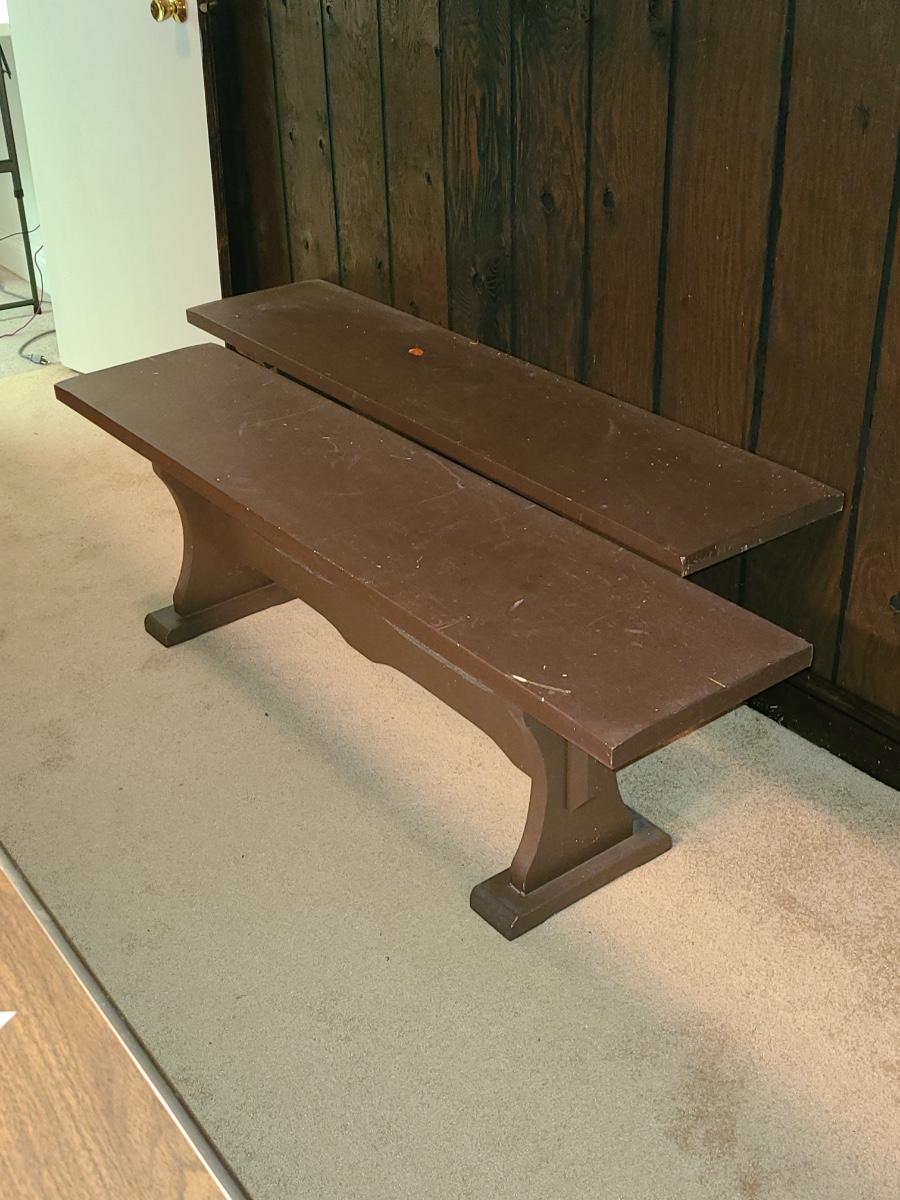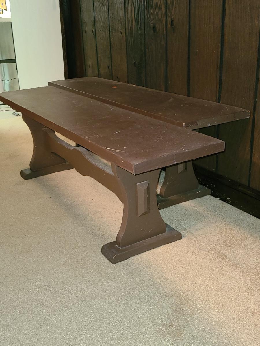 These vintage wood benches are painted brown and were used indoors in the basement as extra seating along the wall for the pool players. They could use a fresh coat of paint, or they are perfect for a porch or primitive look as they are. They measure about 5 feet long and 13 inches wide. They are in a basement and will need to be carried upstairs. Please see all pictures as they are the best representation of the items. The pictures show condition, measurements if taken, and what is included in the lot. Due to the large amount that we photograph and the time frame, we are not always able to take measurements. All items unless noted, are pre-owned and have been used. If you purchased furniture, you must bring help. We do not allow one person to carry large furniture out on their own. Bring help, tools and a truck for the safety of our client’s homes, and your personal safety. Company policy. Thank you.