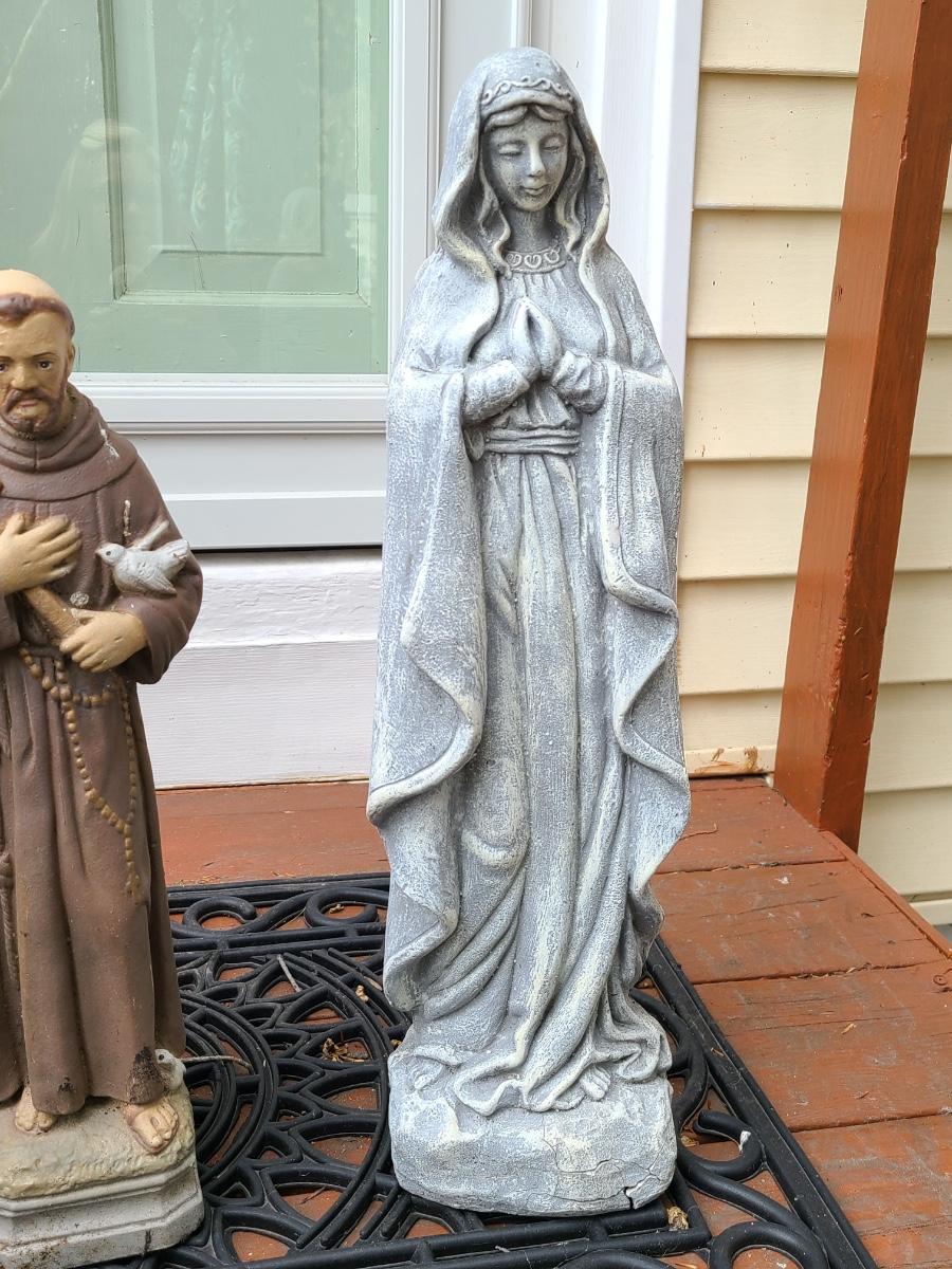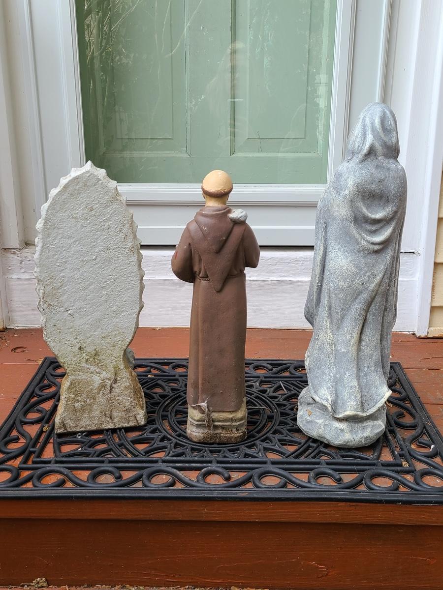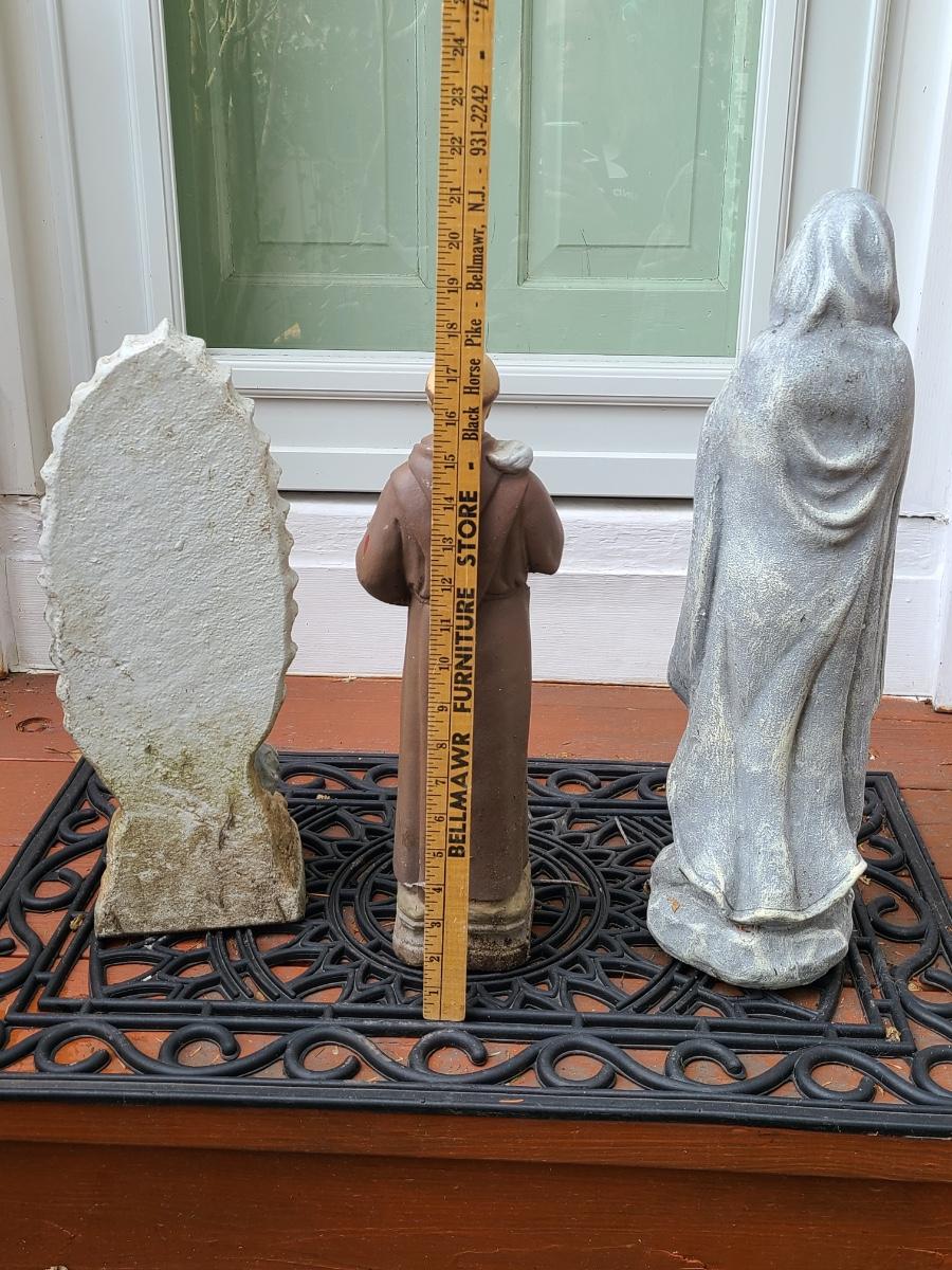 The larger gray statue is resin, the others are chalk or cement. As found in yard. Please see all pictures as they are the best representation of the items. The pictures show condition, measurements if taken, and what is included in the lot. Due to the large amount that we photograph and the time frame, we are not always able to take measurements. All items unless noted, are pre-owned and have been used. If you purchased furniture, you must bring help. We do not allow one person to carry large furniture out on their own. Bring help, tools and a truck for the safety of our client’s homes, and your personal safety. Any damages that result to the property including walls, and floors due to moving of the furniture will be charged to the buyer. Company policy. Thank you.
