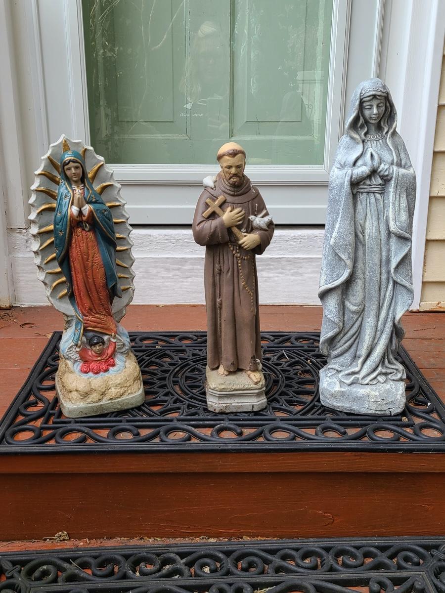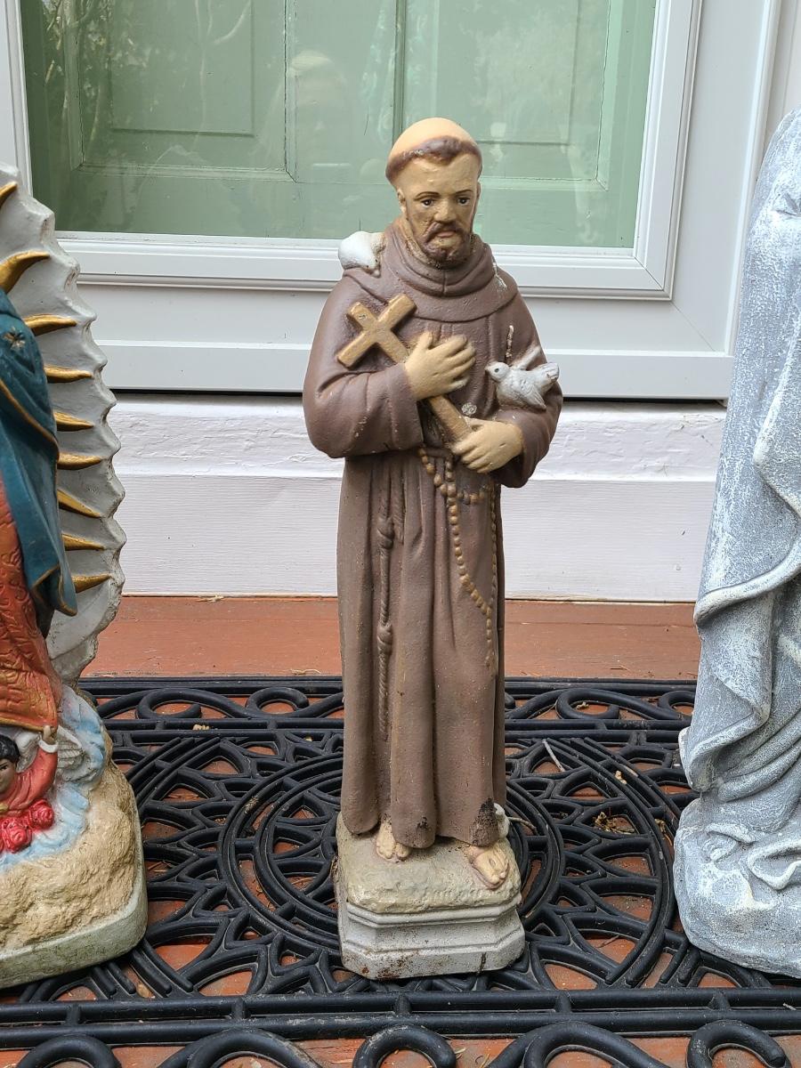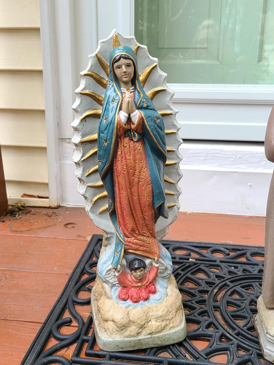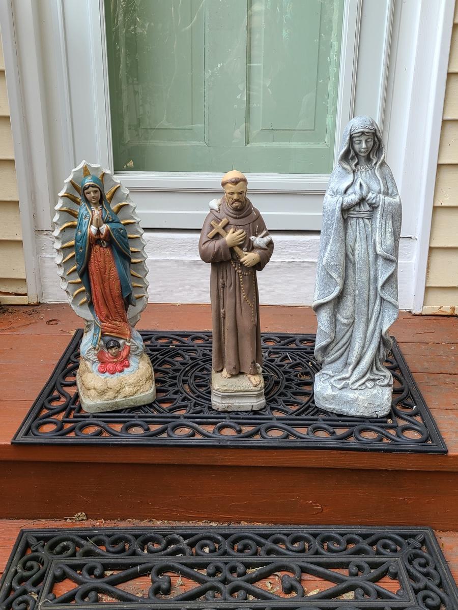 The larger gray statue is resin, the others are chalk or cement. As found in yard. Please see all pictures as they are the best representation of the items. The pictures show condition, measurements if taken, and what is included in the lot. Due to the large amount that we photograph and the time frame, we are not always able to take measurements. All items unless noted, are pre-owned and have been used. If you purchased furniture, you must bring help. We do not allow one person to carry large furniture out on their own. Bring help, tools and a truck for the safety of our client’s homes, and your personal safety. Any damages that result to the property including walls, and floors due to moving of the furniture will be charged to the buyer. Company policy. Thank you.