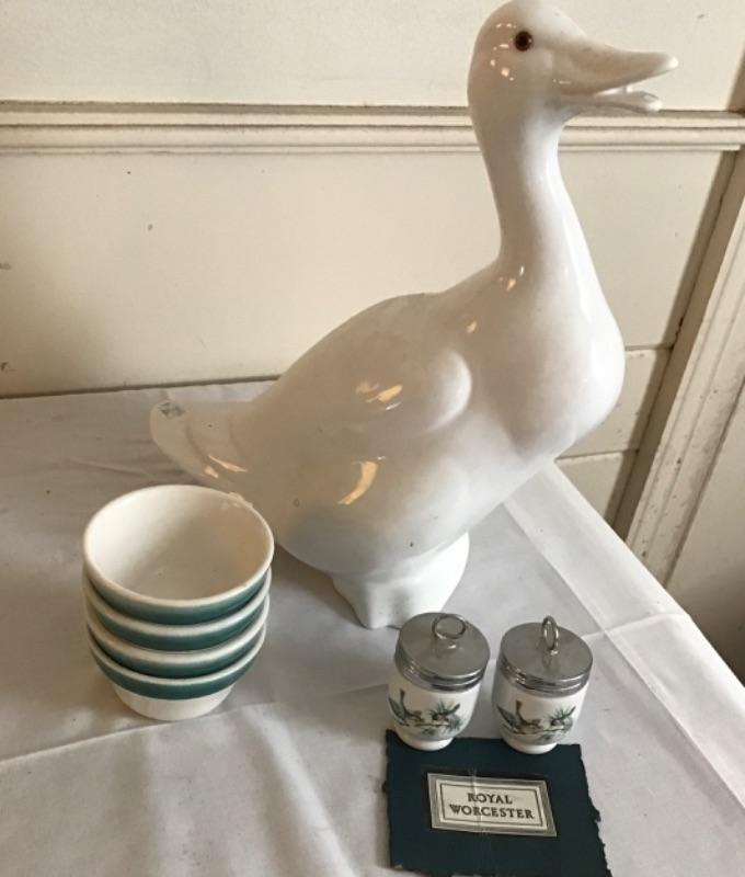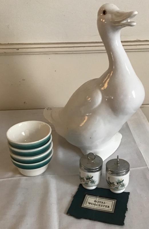 Porcelain Duck - Dept 56, with two Royal Worcester Egg Coddlers