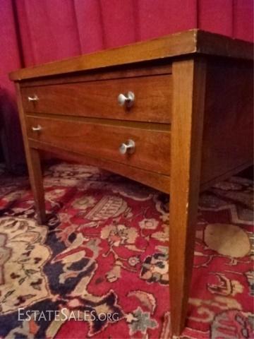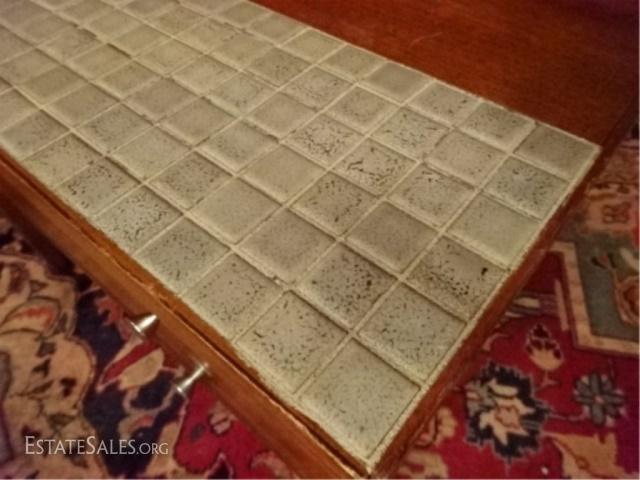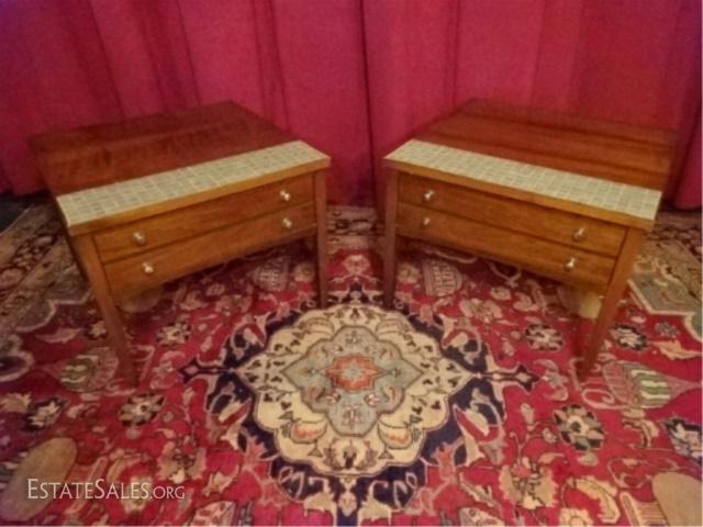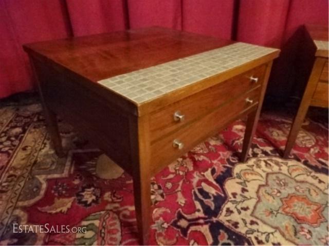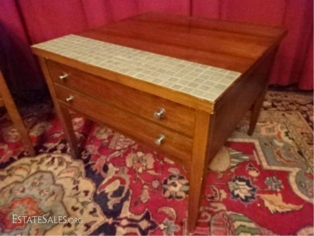 LOT 50A: PAIR LANE MID CENTURY MODERN TABLES, WALNUT WITH TILE INLAID TOPS, CIRCA 1960's, LARGE FRONT DRAWERS, STAMPED LANE MARK, VERY GOOD CONDITION WITH MINOR WEAR, 26" X 25.5" X 30", SKU355