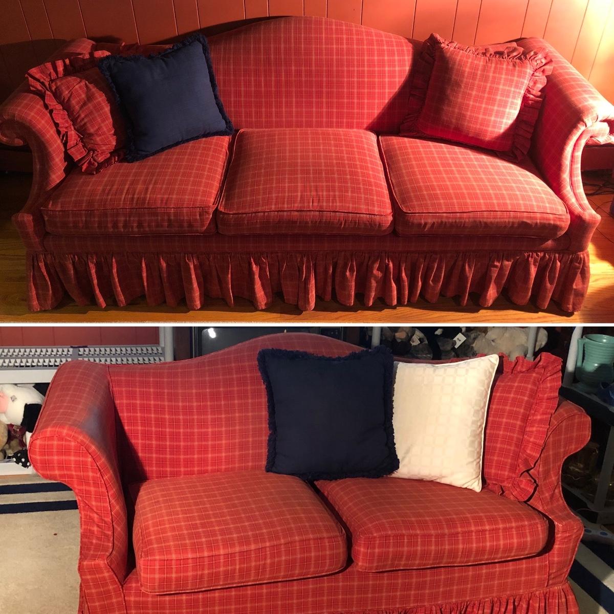 Couch measures 79W x 31D x 29H and loveseat measures 62W x 29D x 34H. Some condition issues.