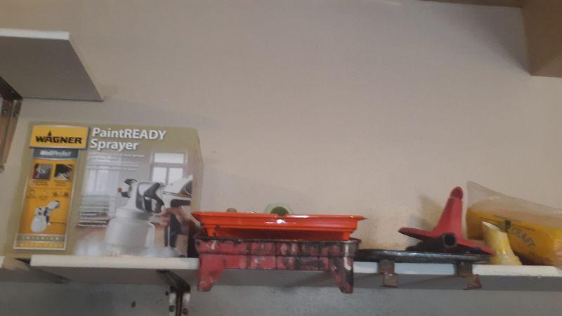HAND HELD SPRAYER WITH FLOW CONTROL, PAINT TRAYS, PAINT CAN LIDS WITH POUR SPOUT, BRUSH, ROLLER.