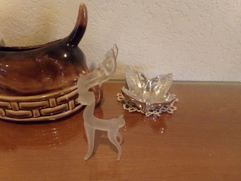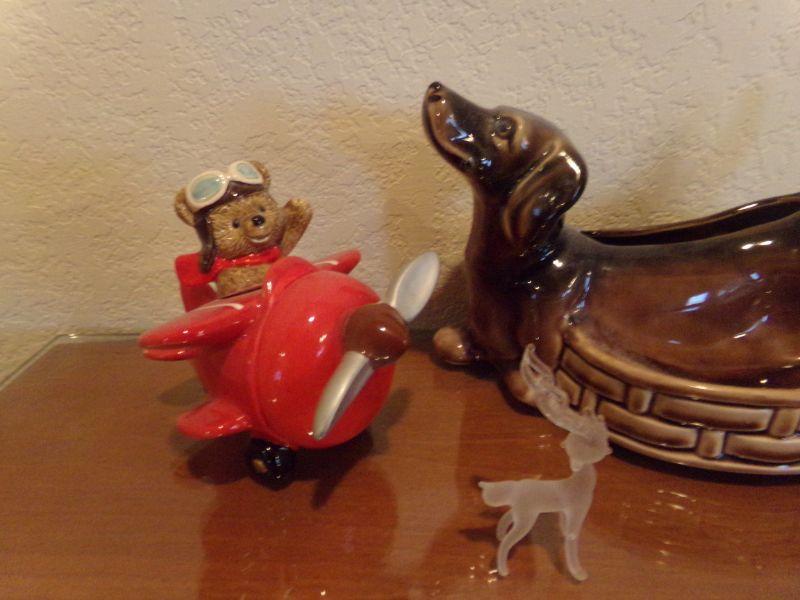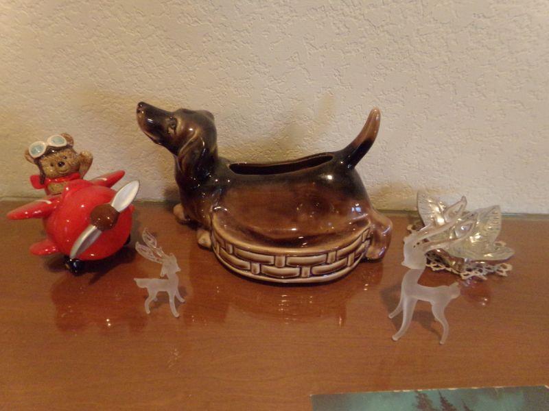 DACHSHUND CERAMIC PLANTER, BEAR IN HELICOPTER, CRYSTAL FLOWER & 2-GLASS FROSTED DEER
